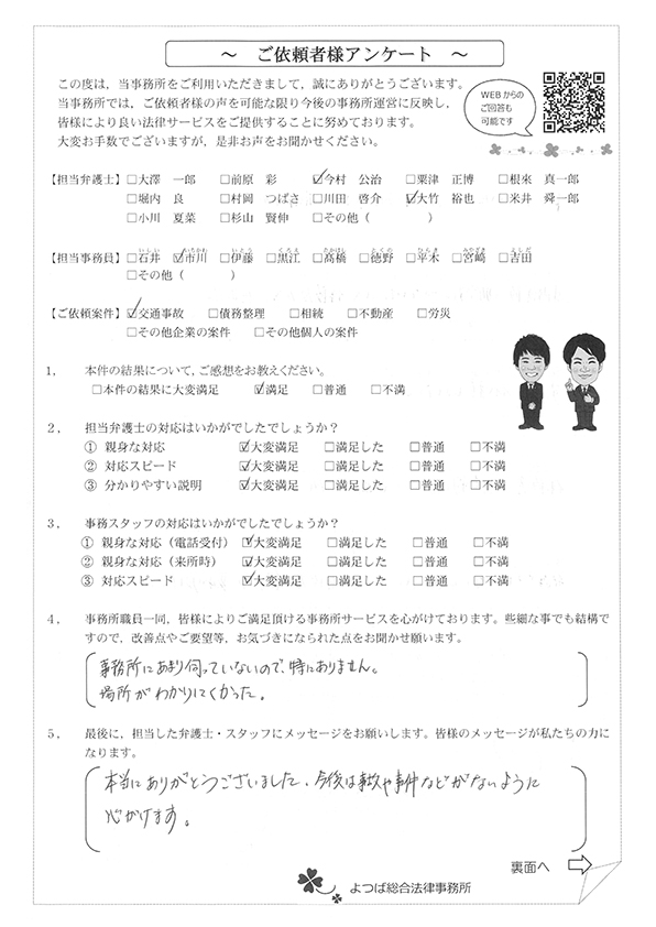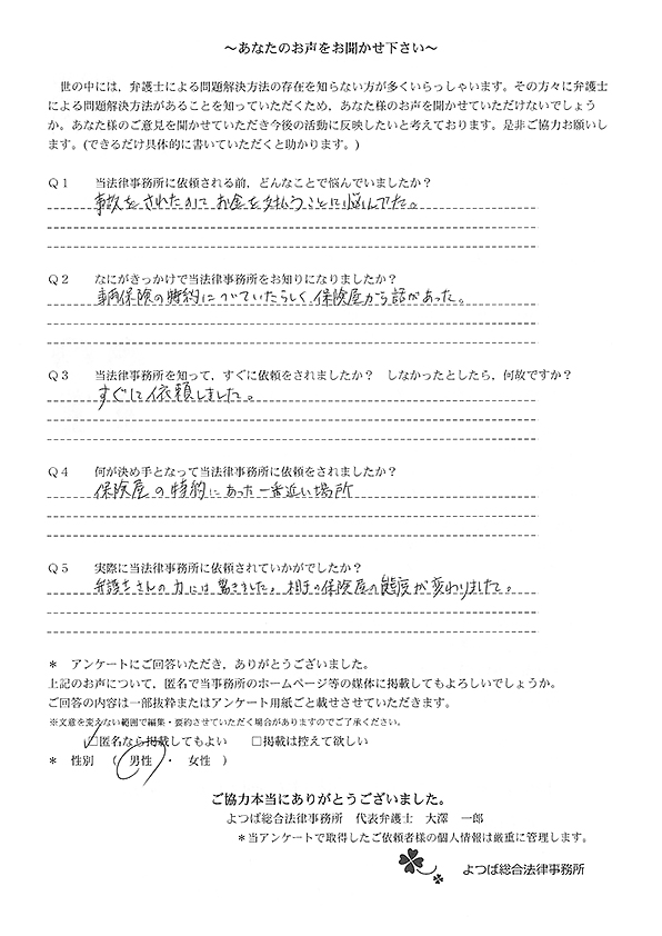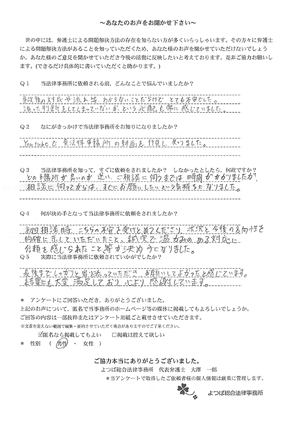 先生に依頼した事で普段通りの生活で、事故対応ができました。感謝しております。