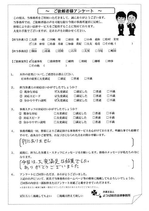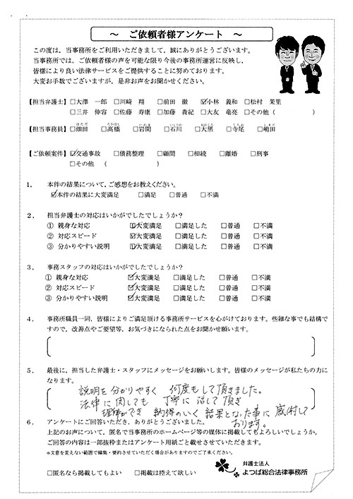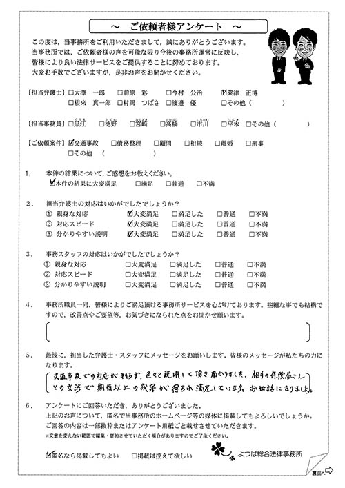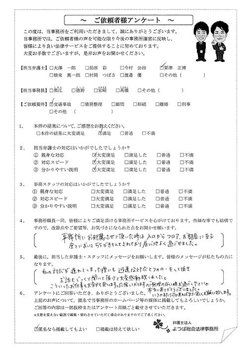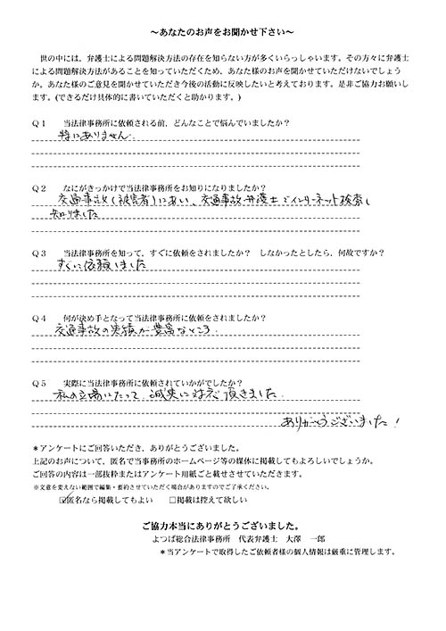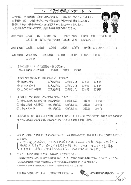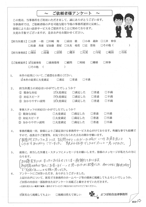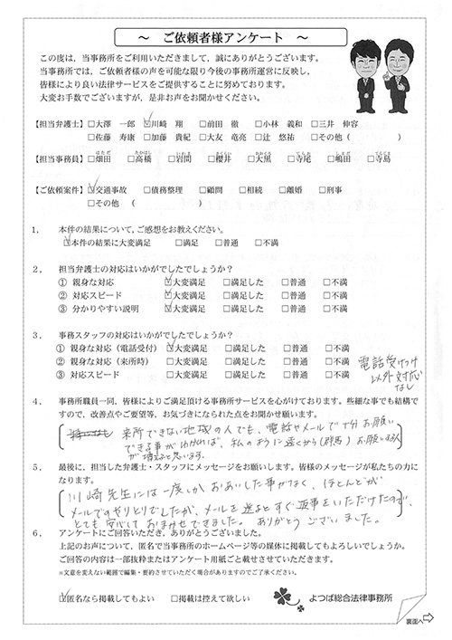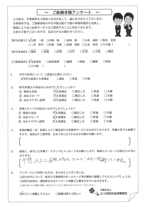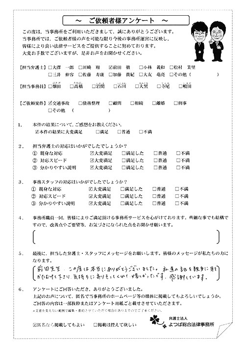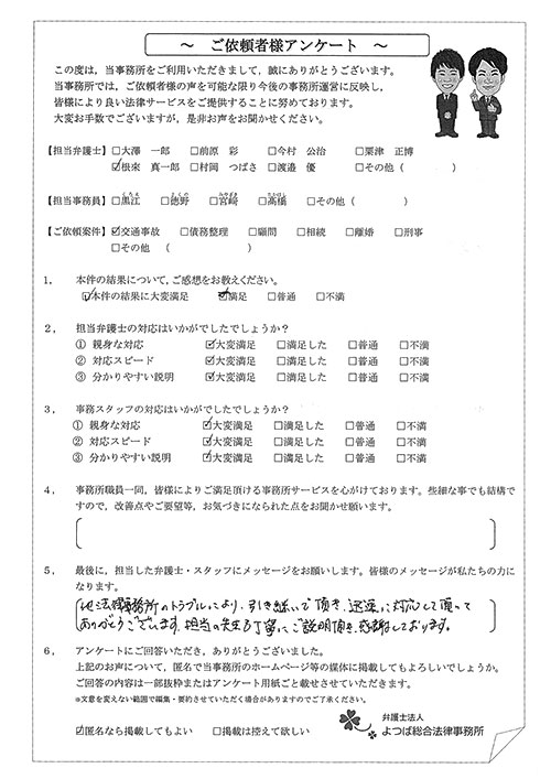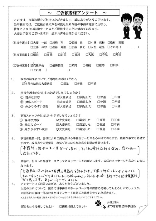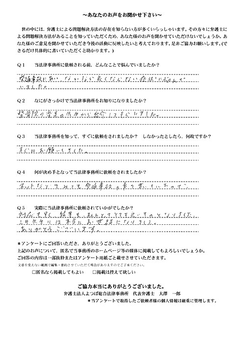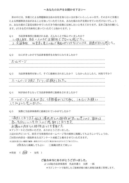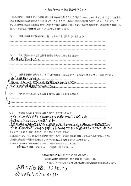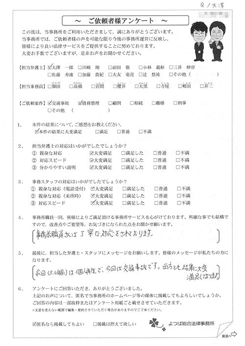 前回は個人再生で、今回は交通事故です。両方とも結果に大変満足しております。