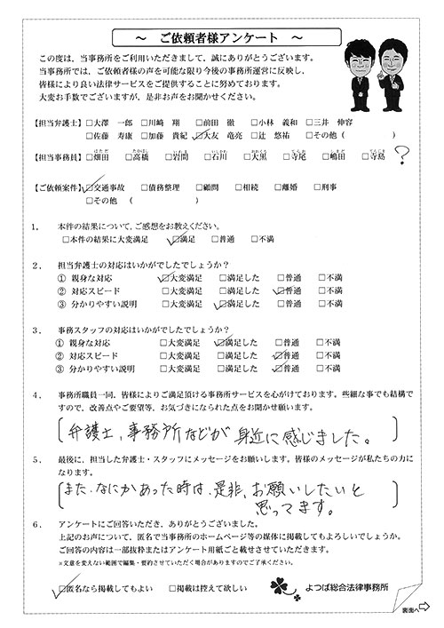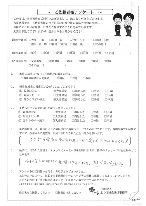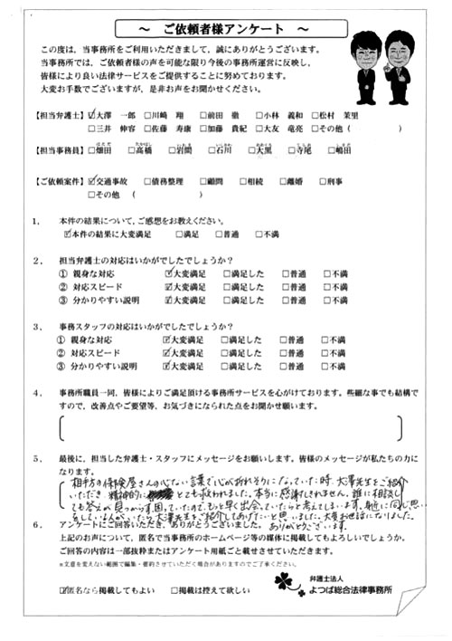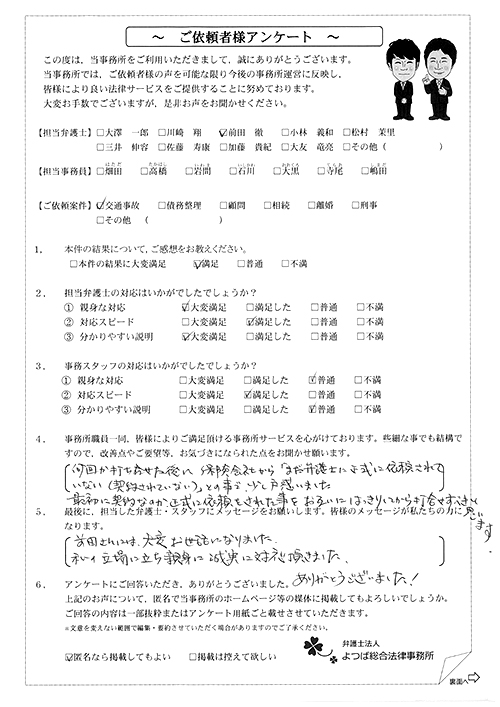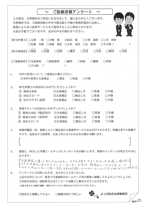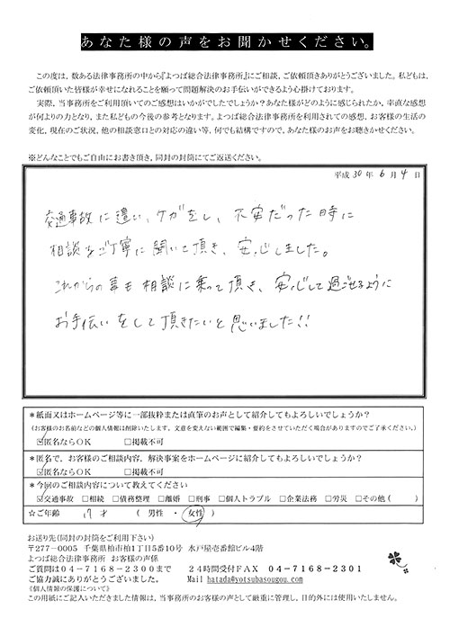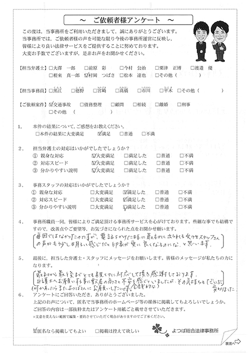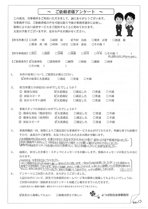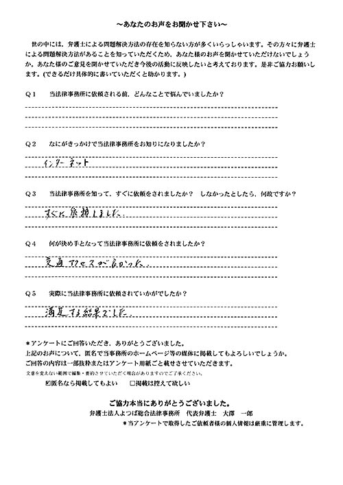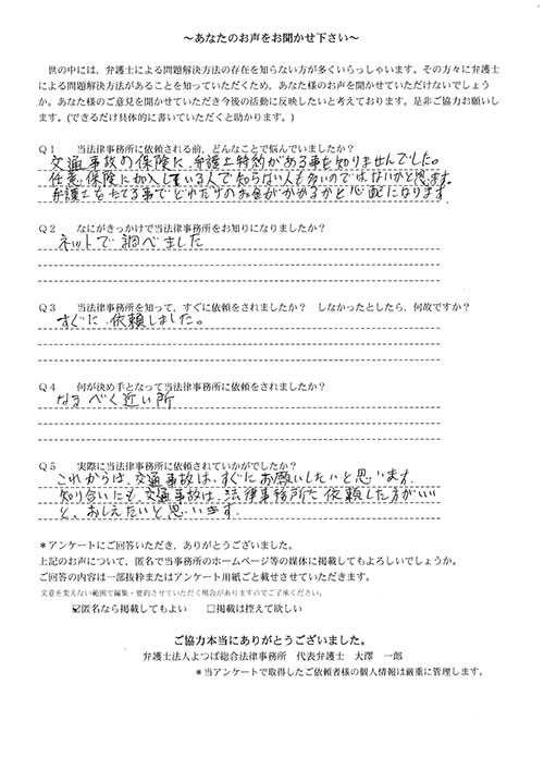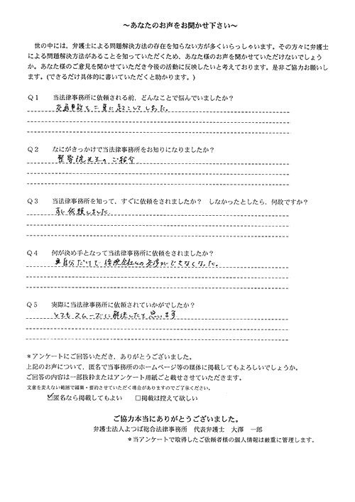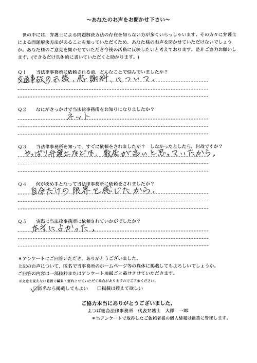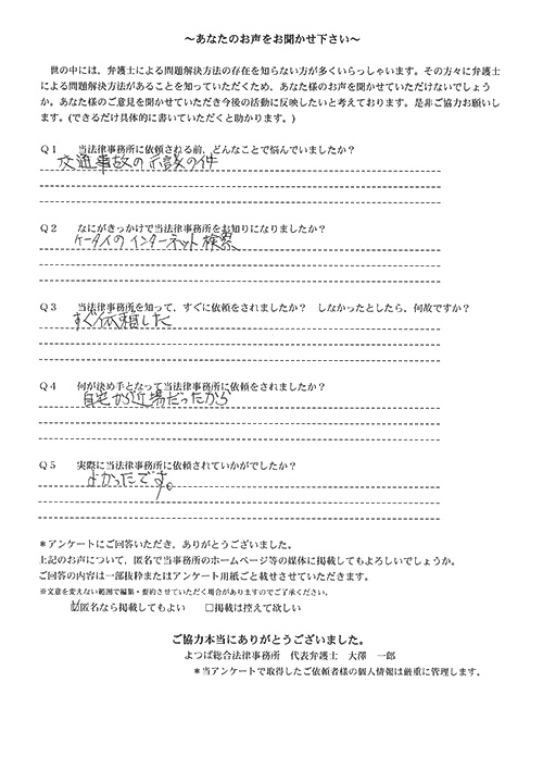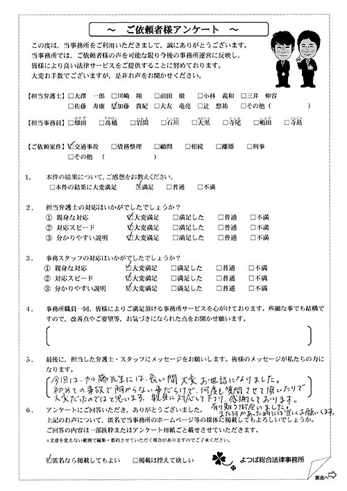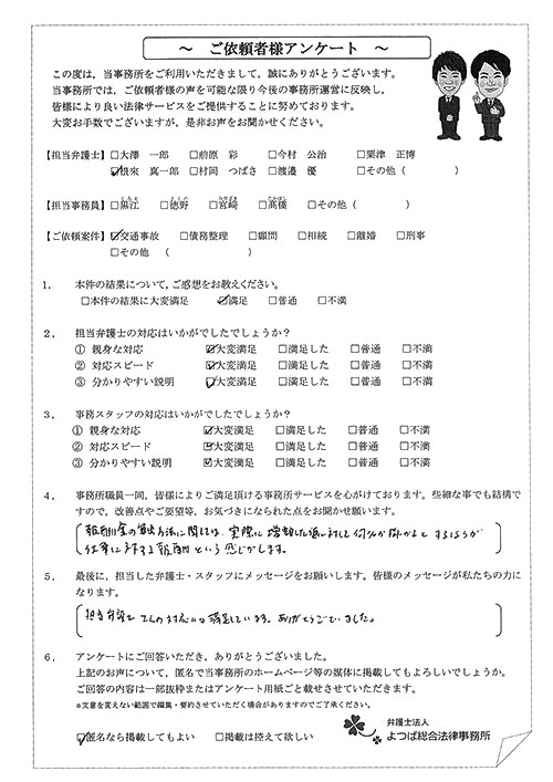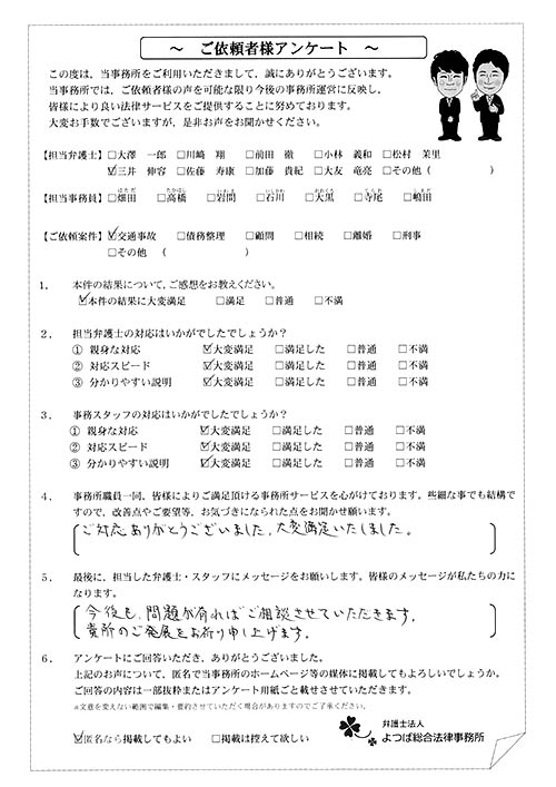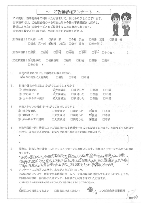 前回は個人再生で、今回は交通事故です。両方とも結果に大変満足しております。