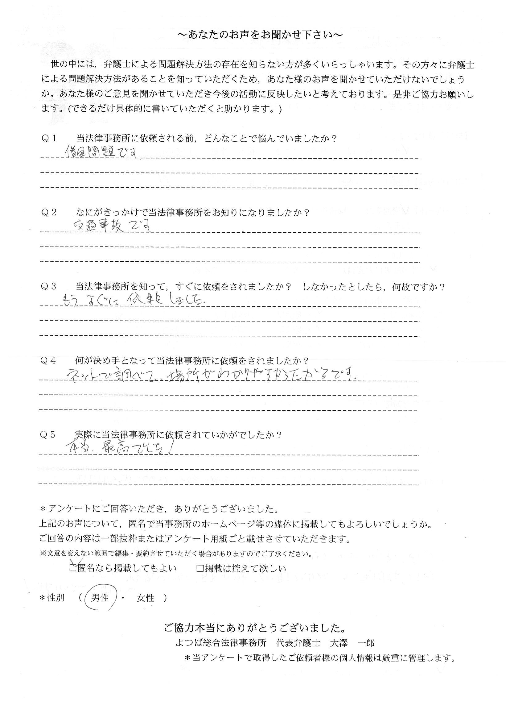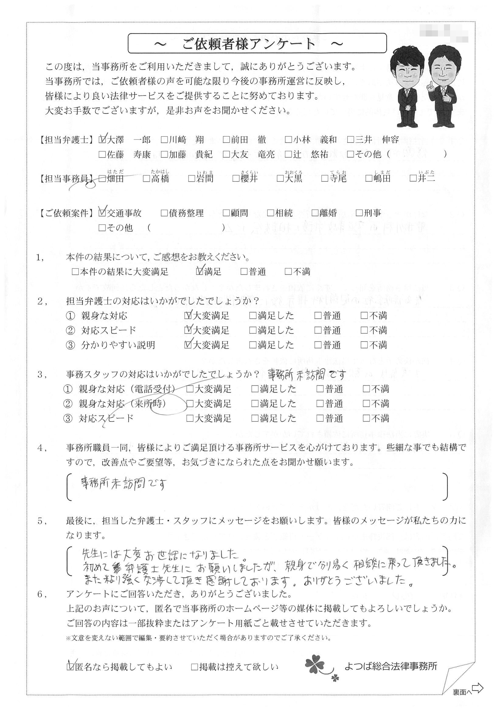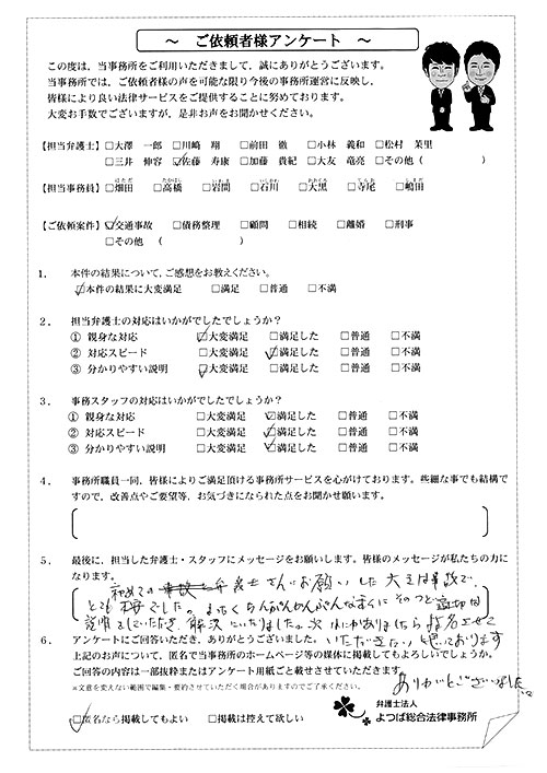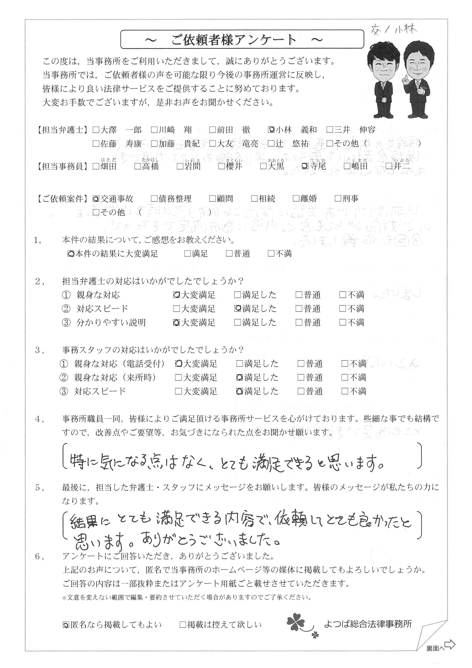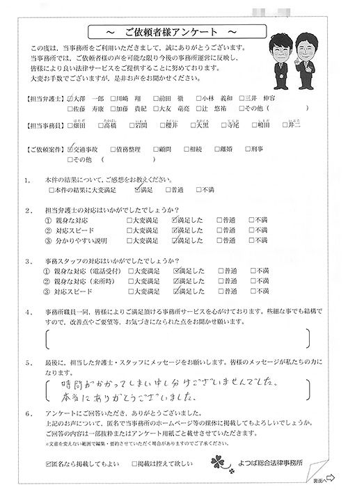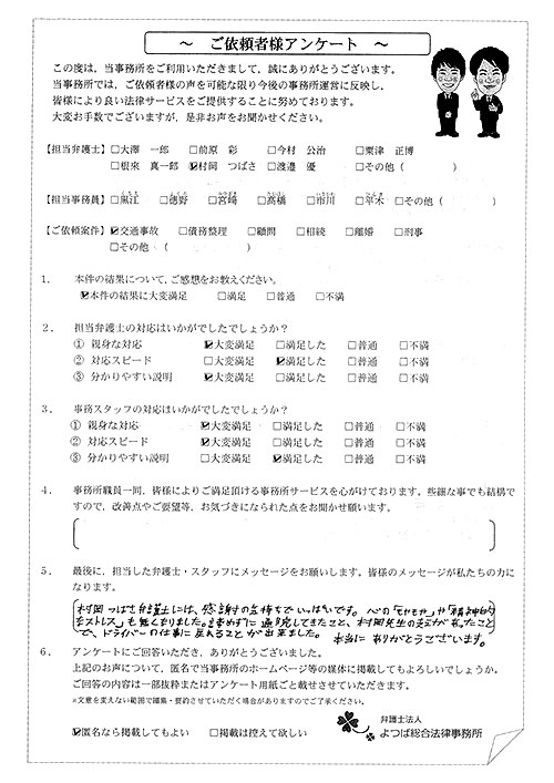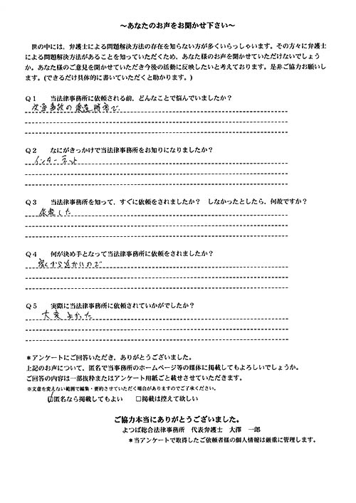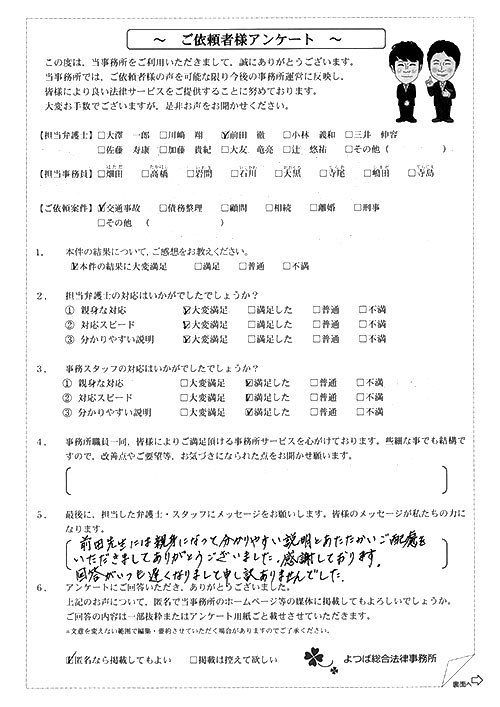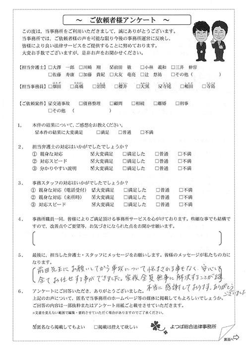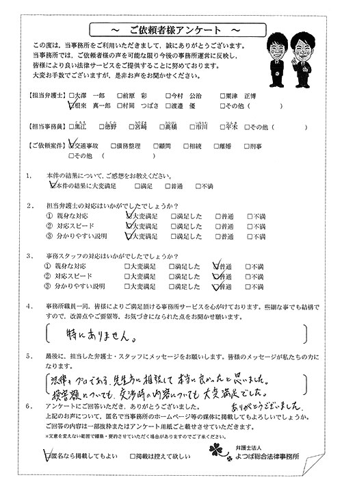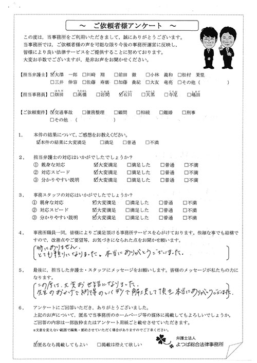 前回は個人再生で、今回は交通事故です。両方とも結果に大変満足しております。
