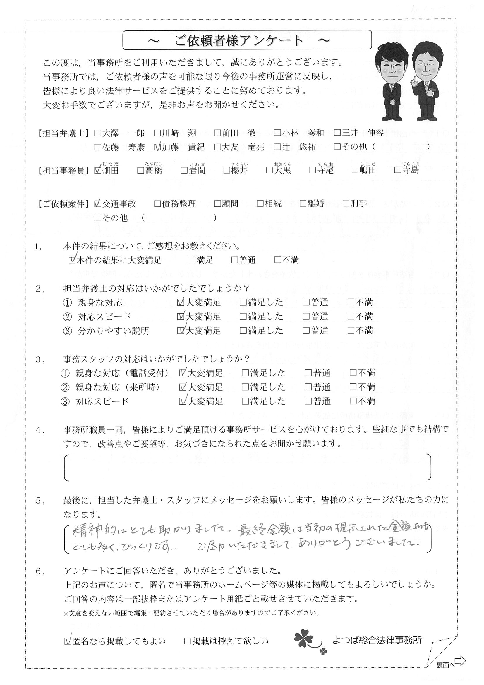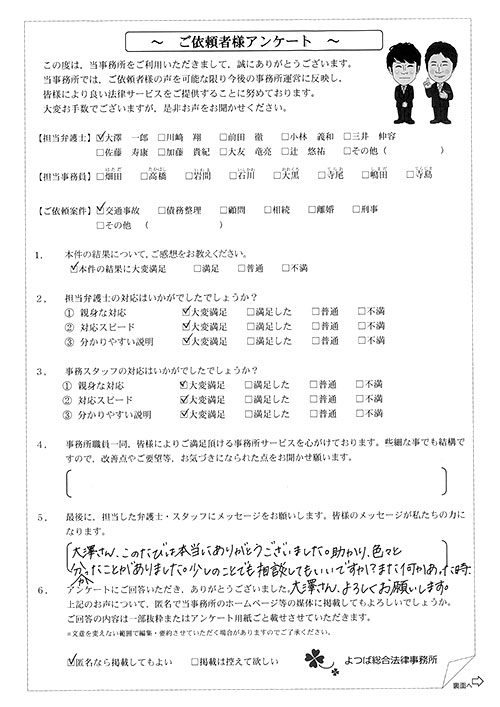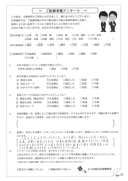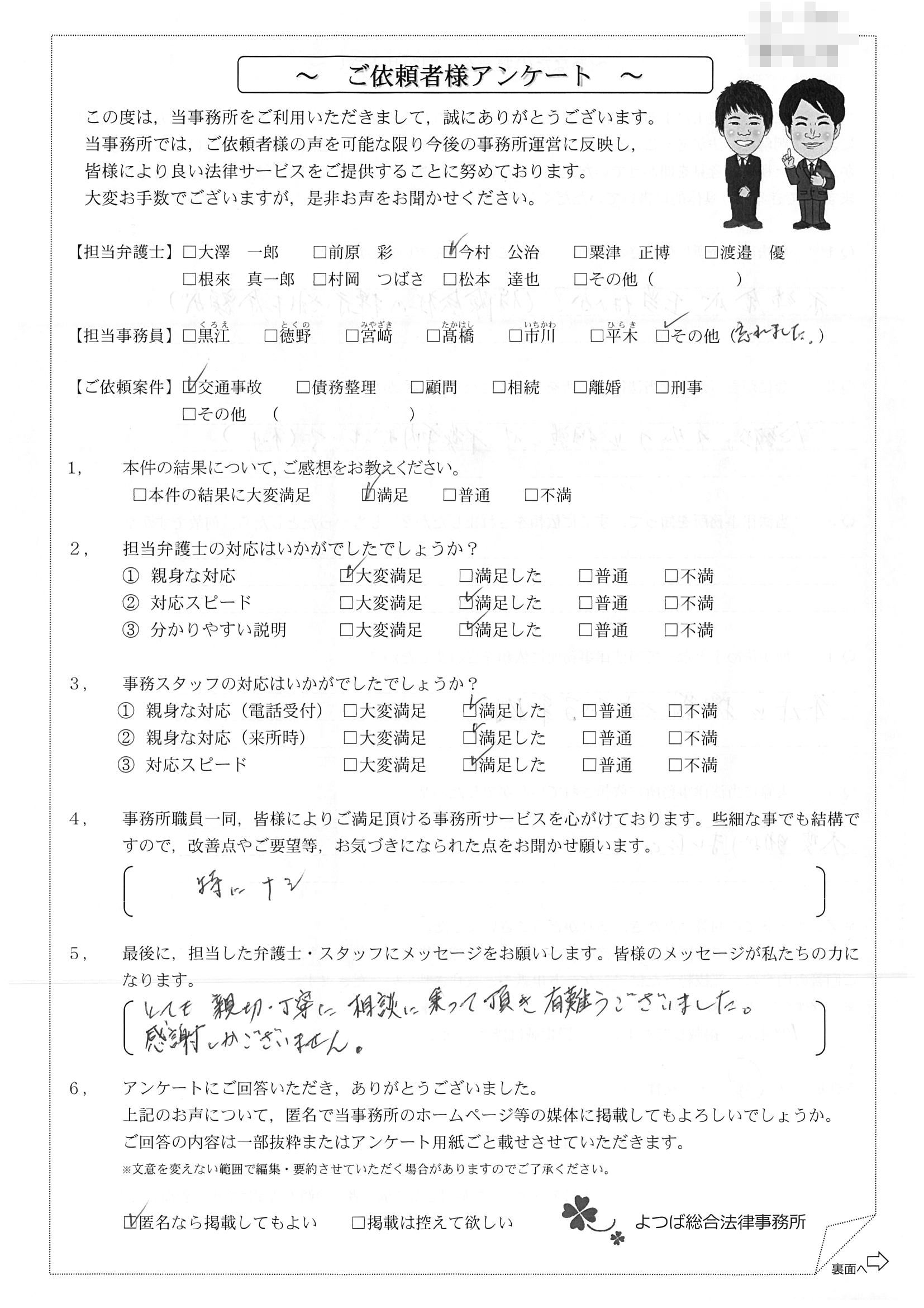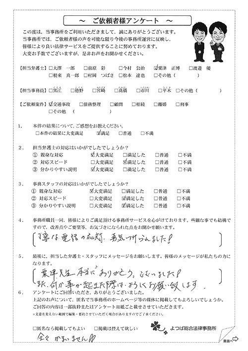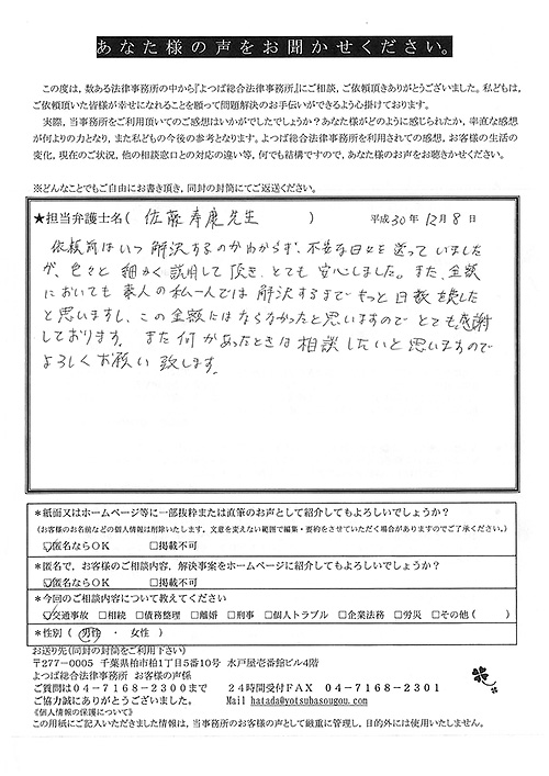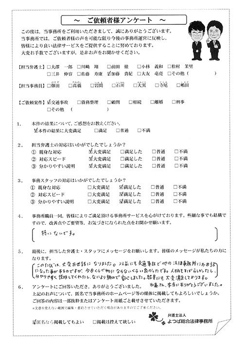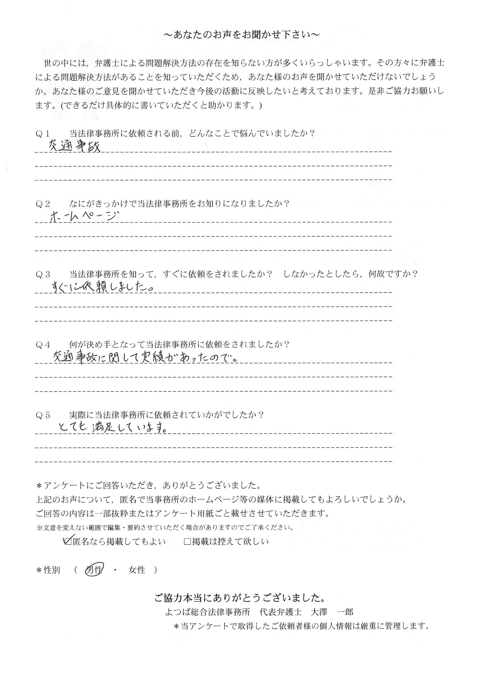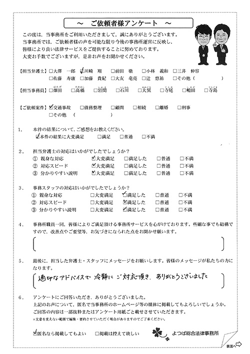 前回は個人再生で、今回は交通事故です。両方とも結果に大変満足しております。
