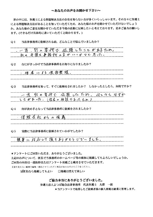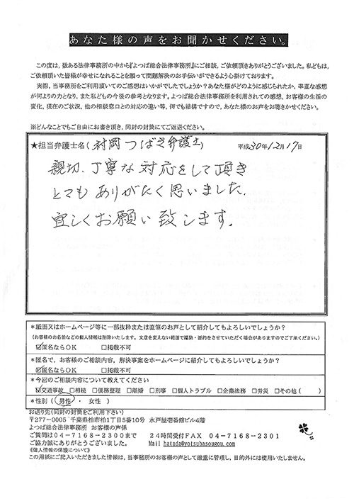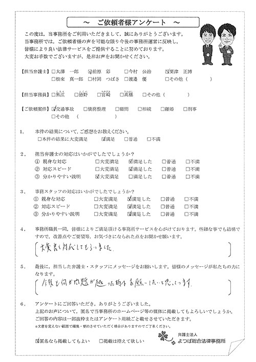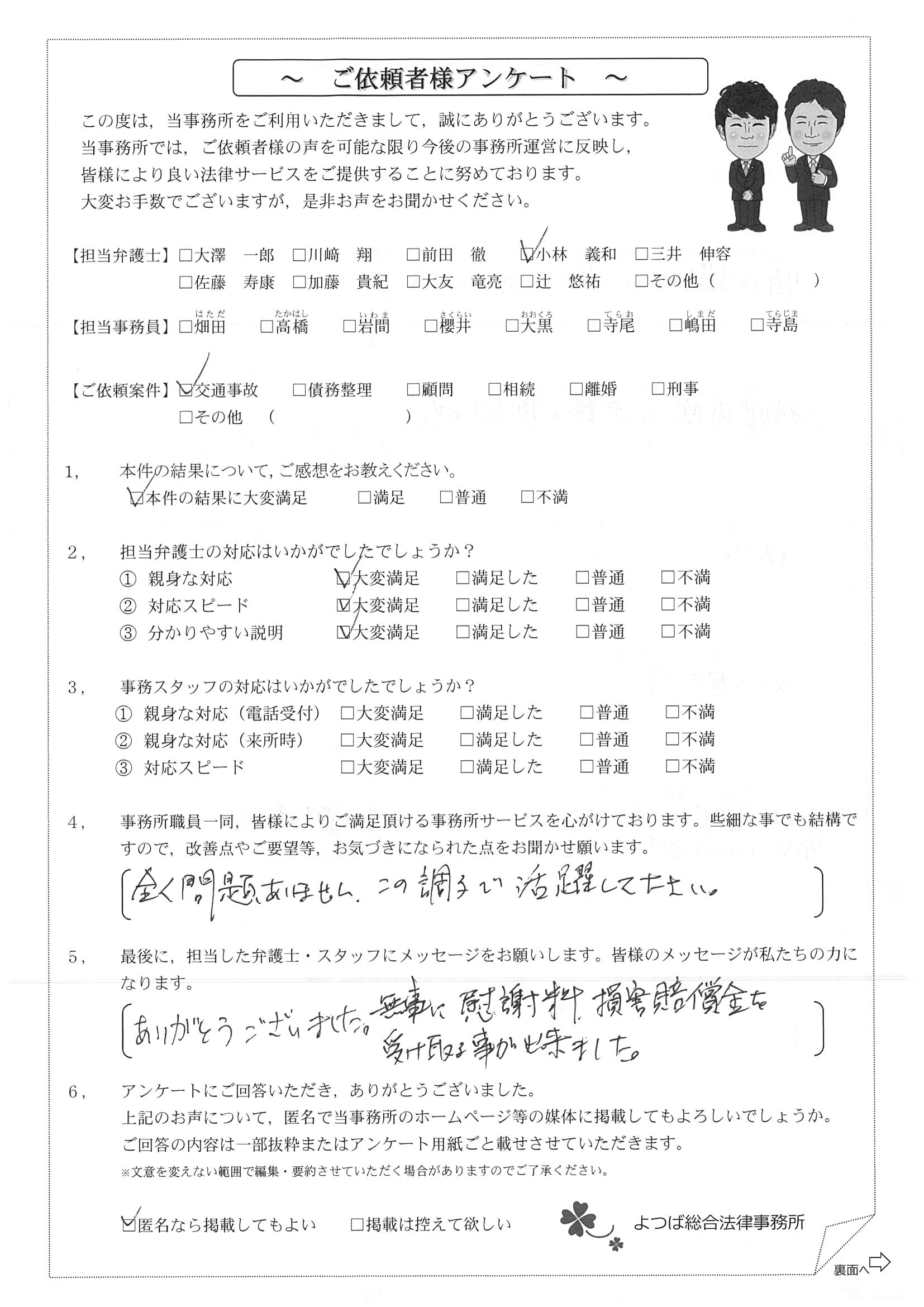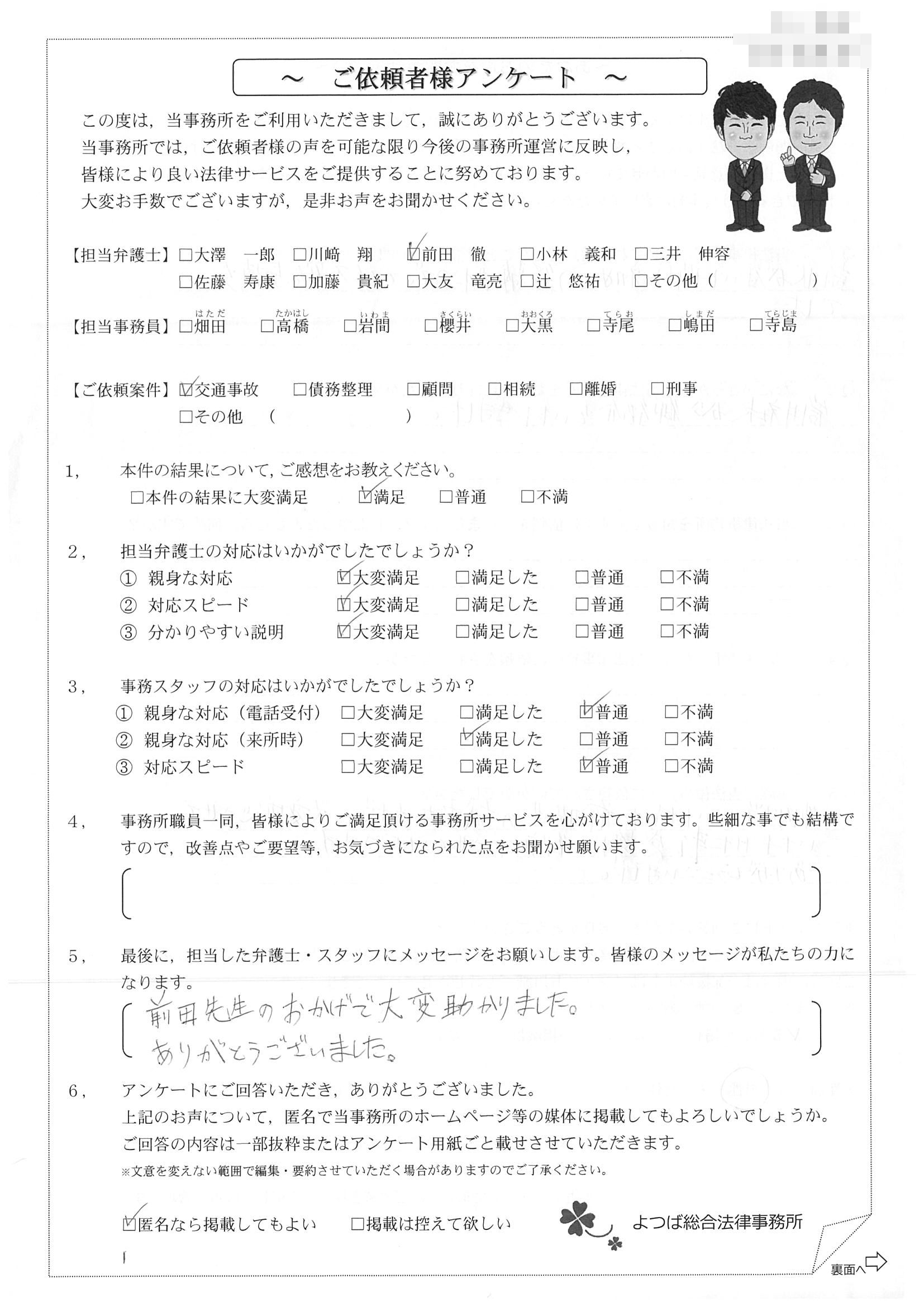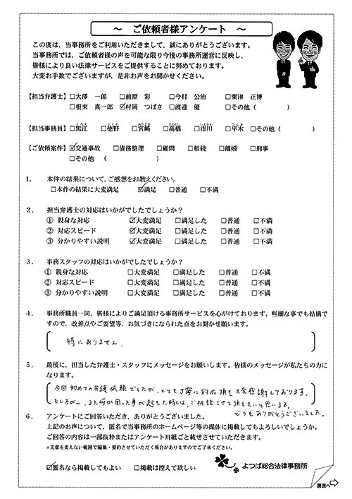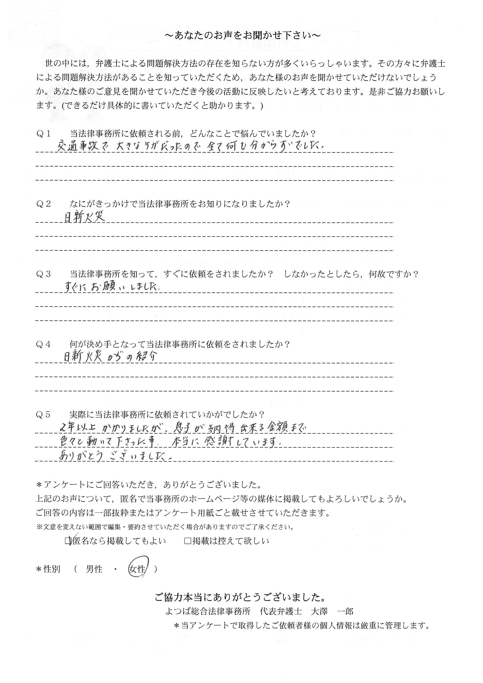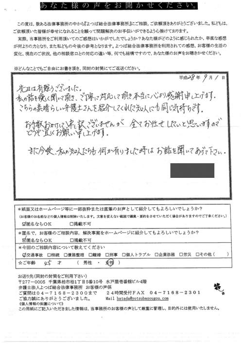 前回は個人再生で、今回は交通事故です。両方とも結果に大変満足しております。