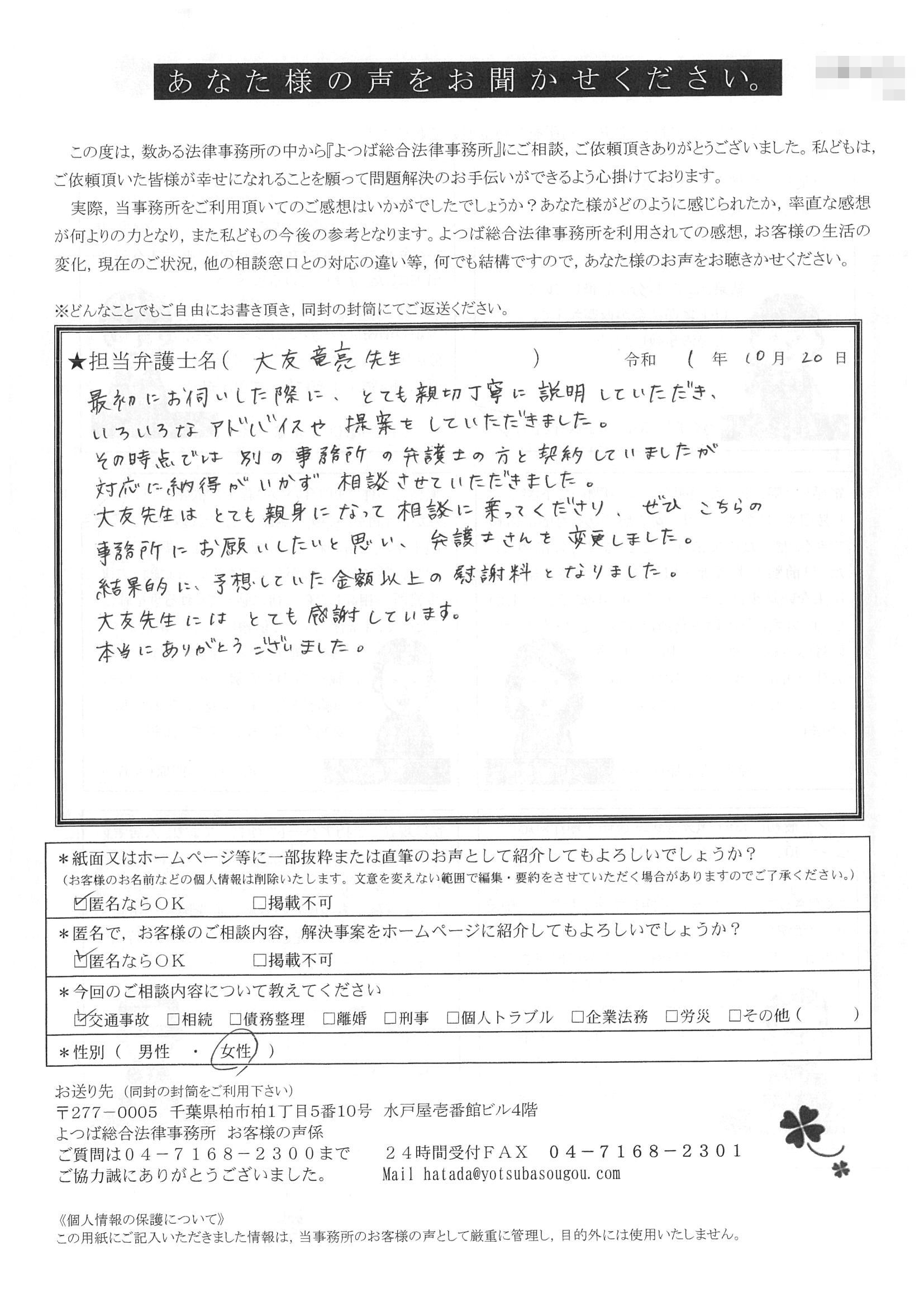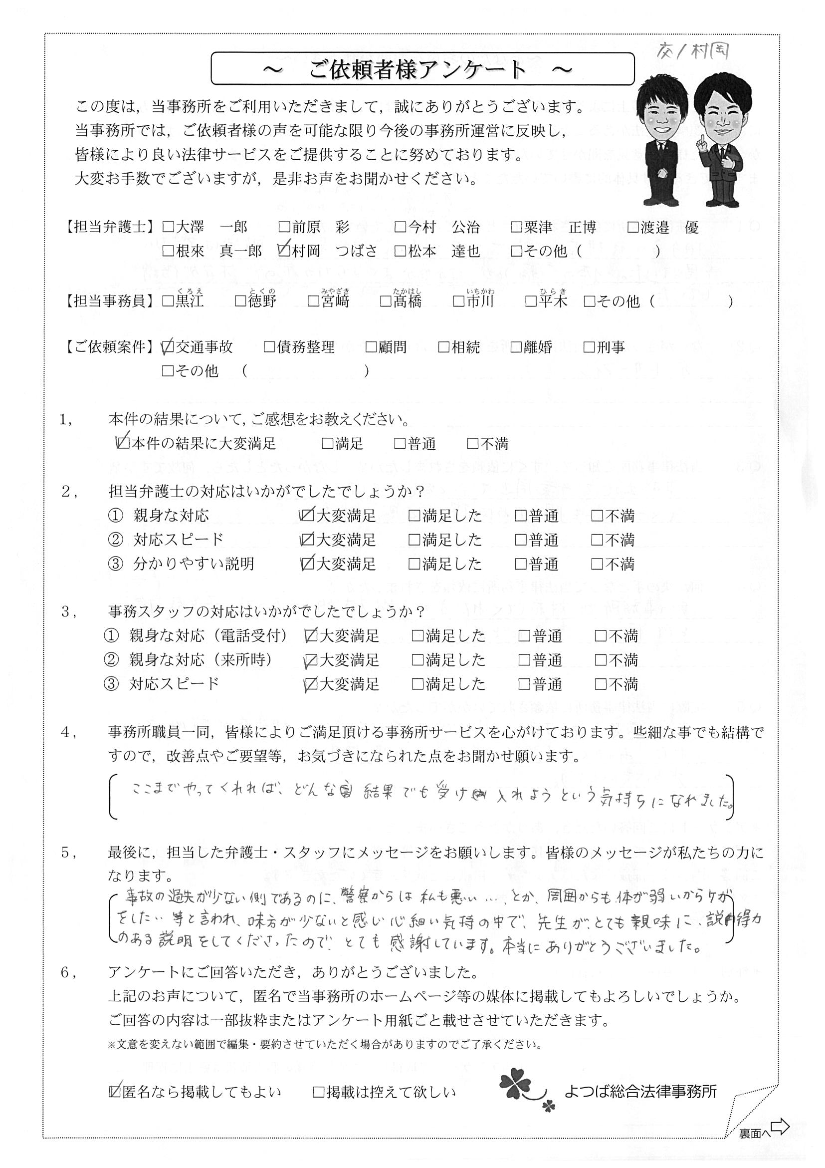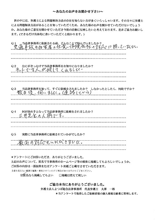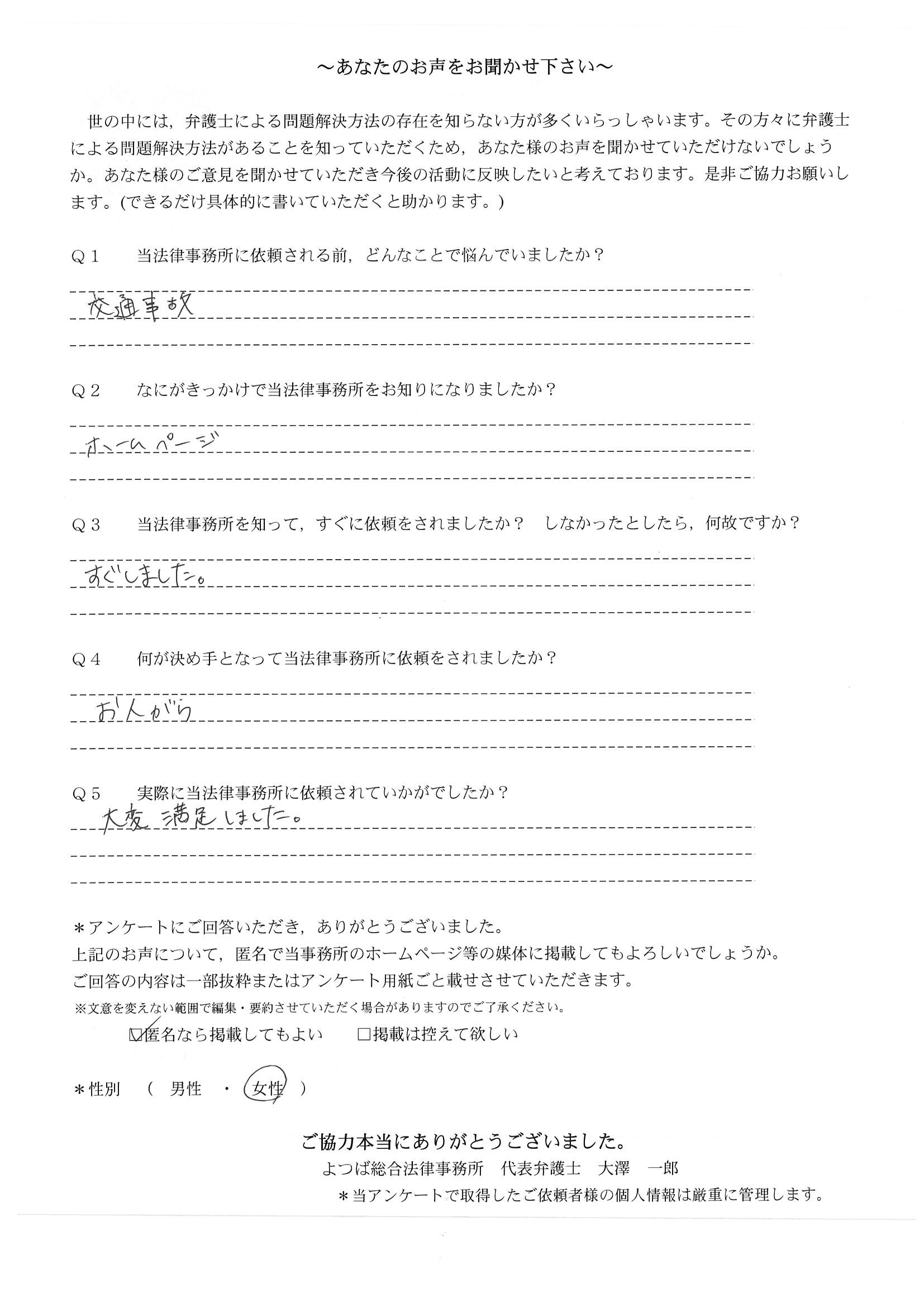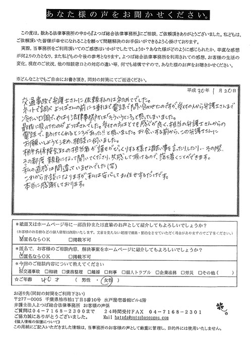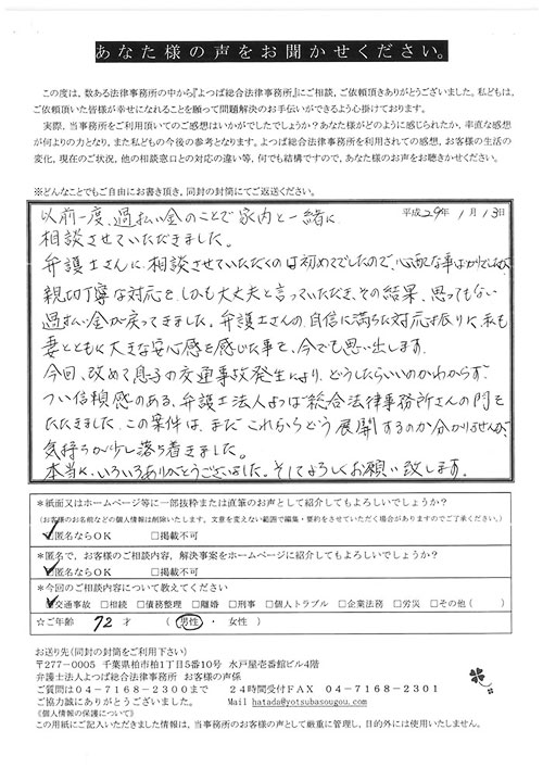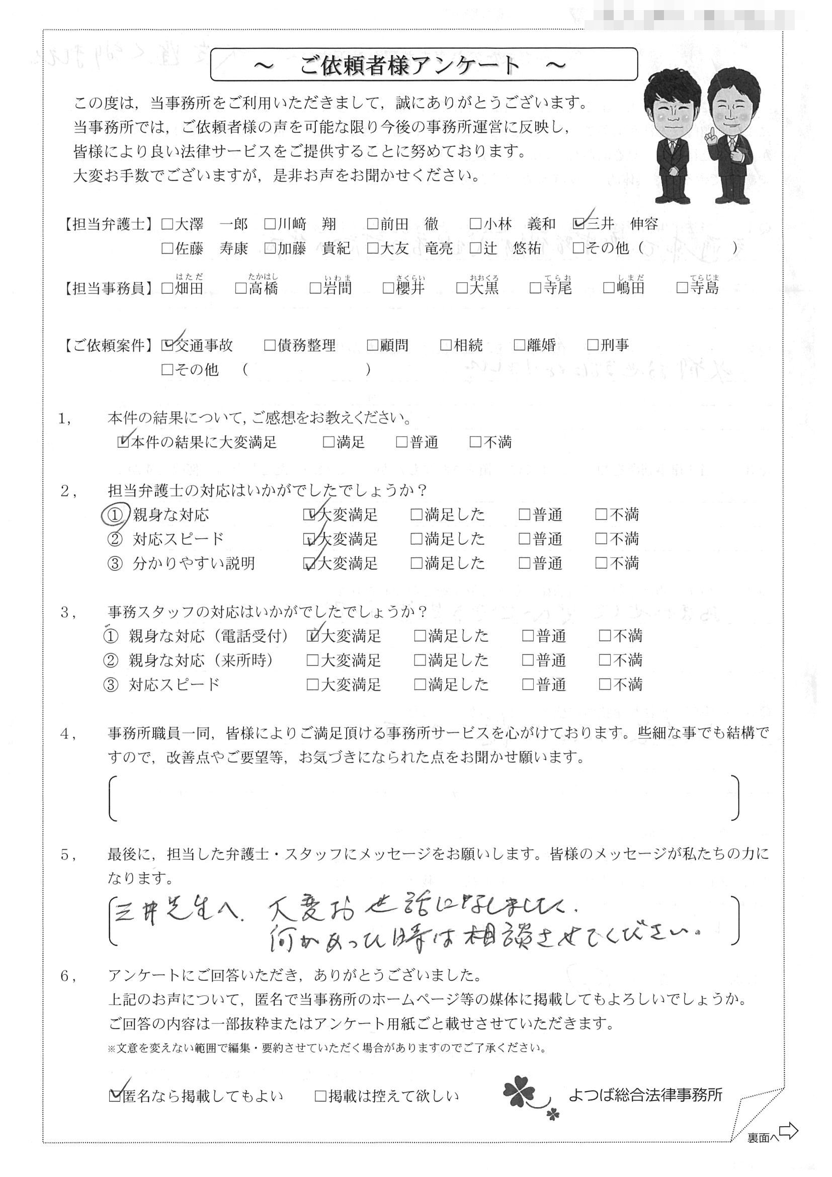 前回は個人再生で、今回は交通事故です。両方とも結果に大変満足しております。