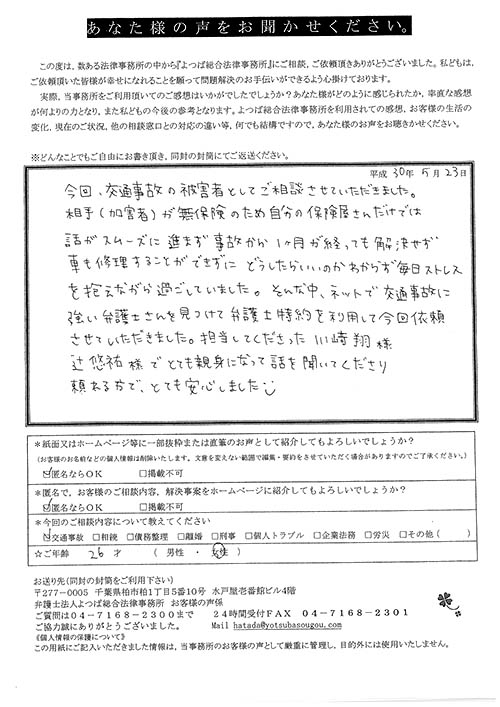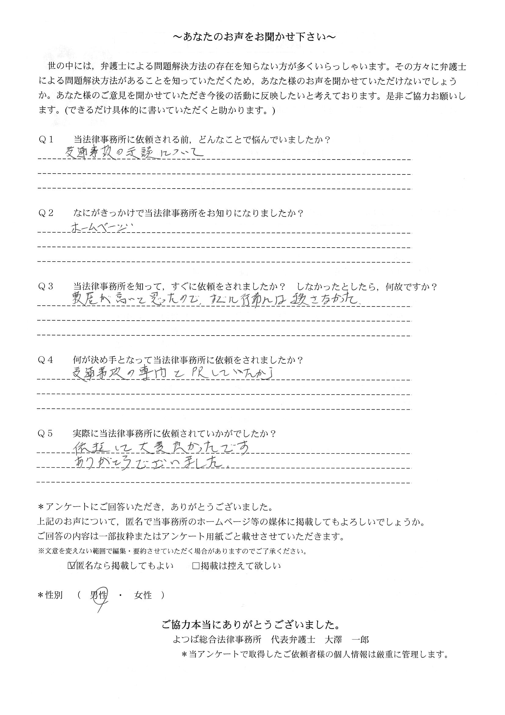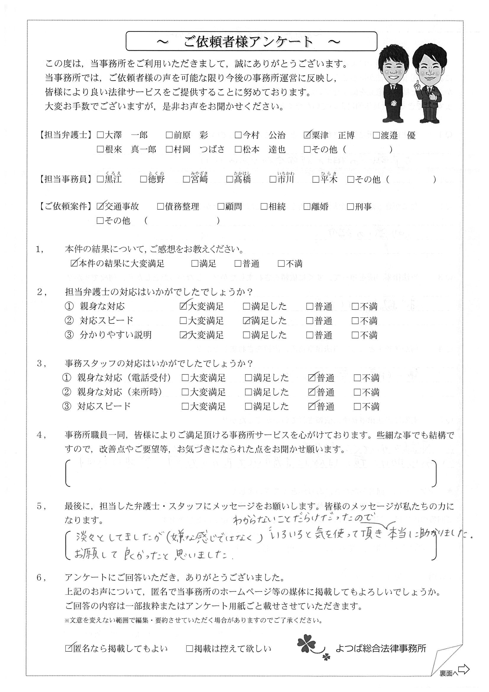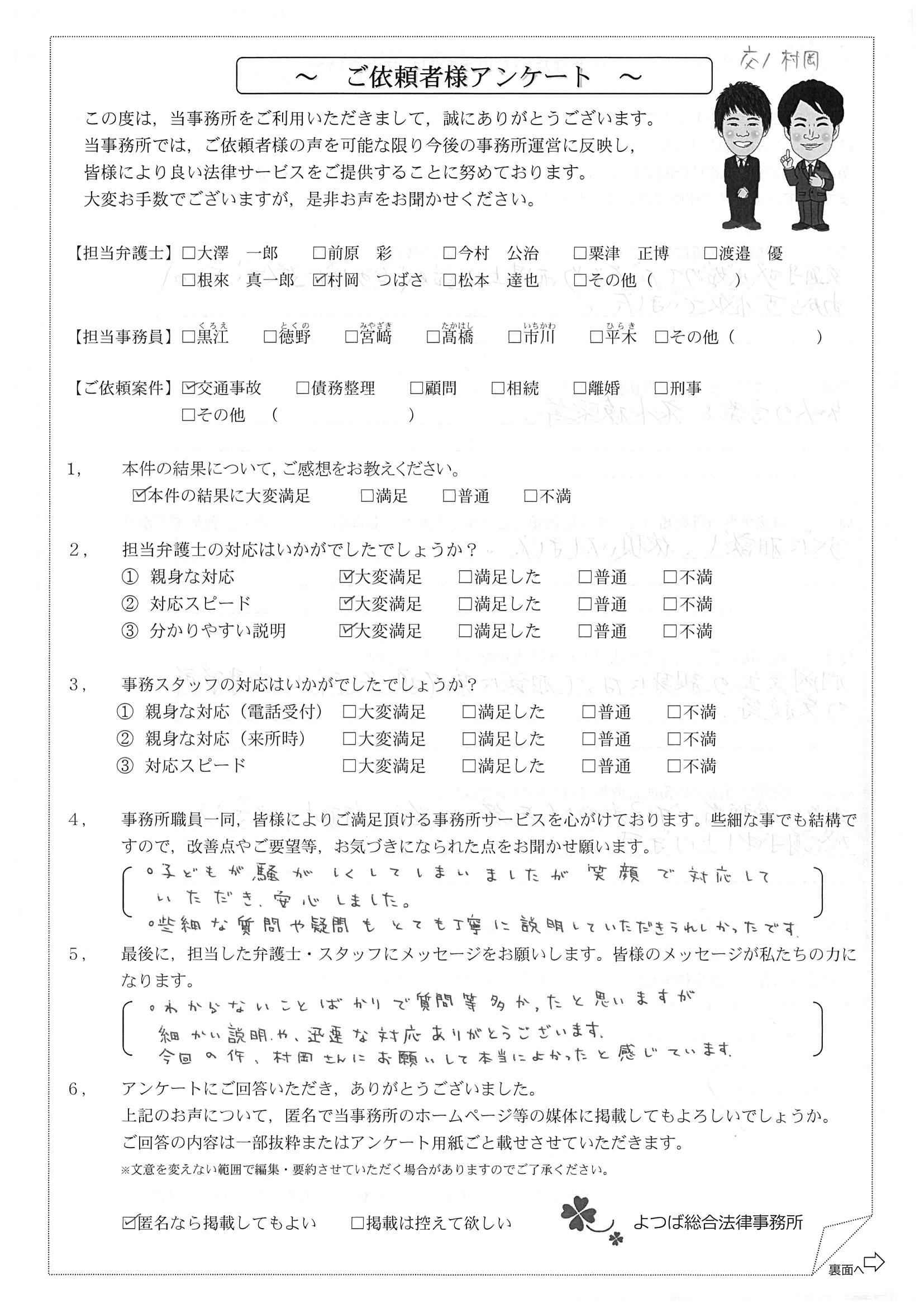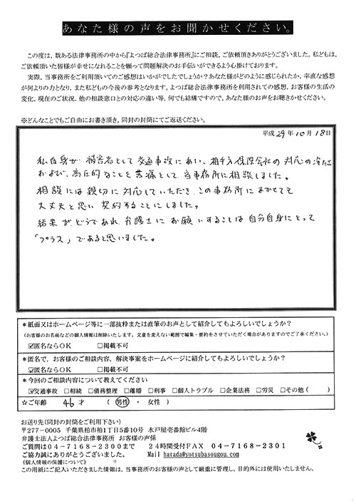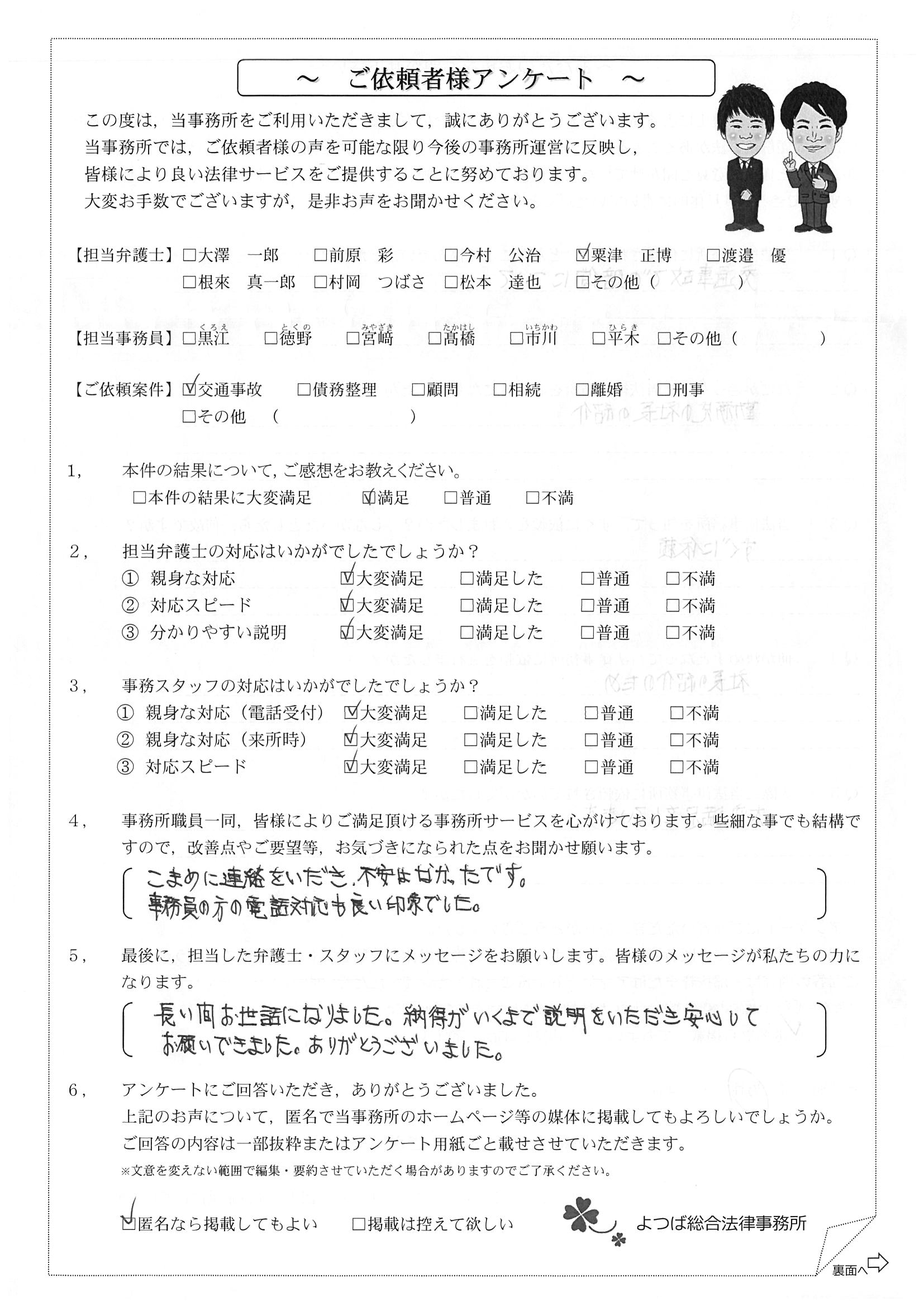 前回は個人再生で、今回は交通事故です。両方とも結果に大変満足しております。