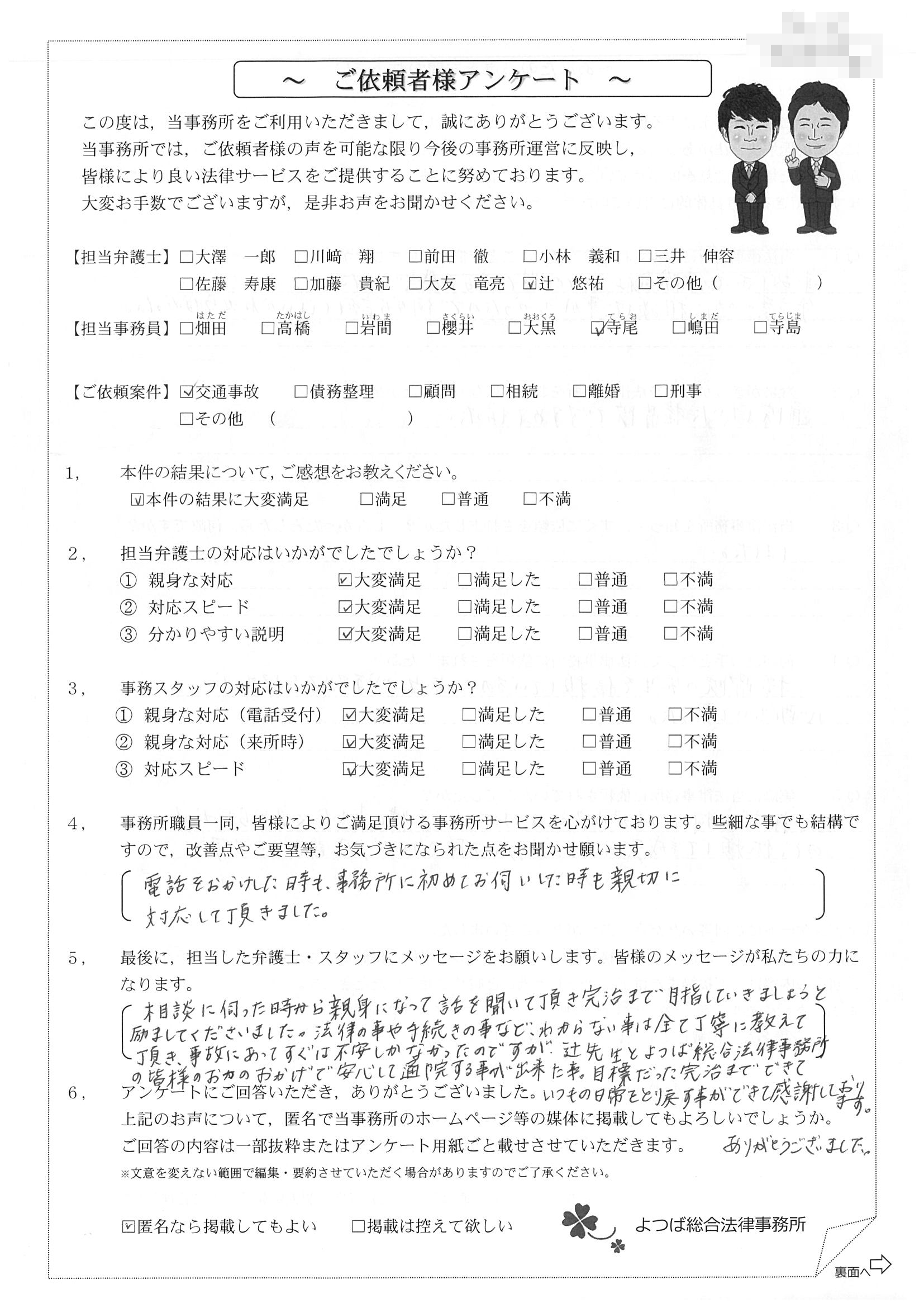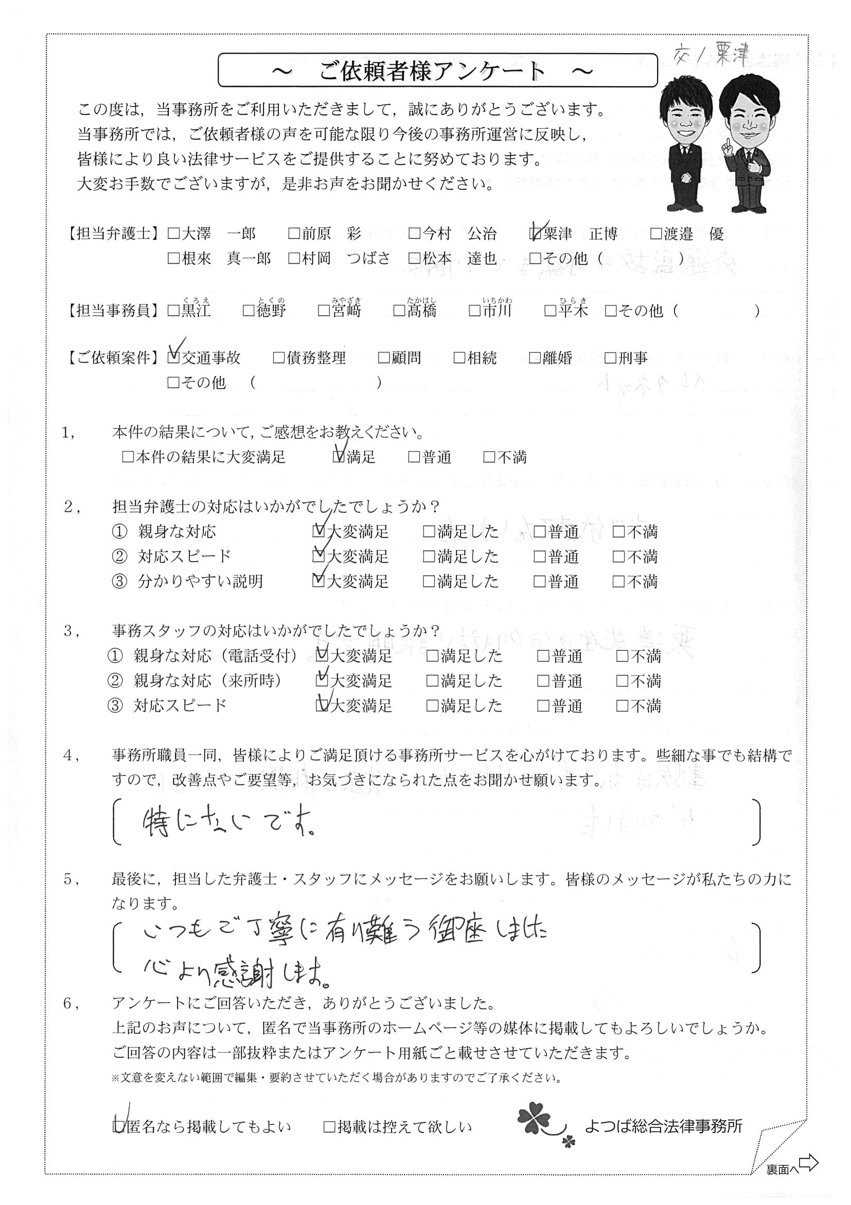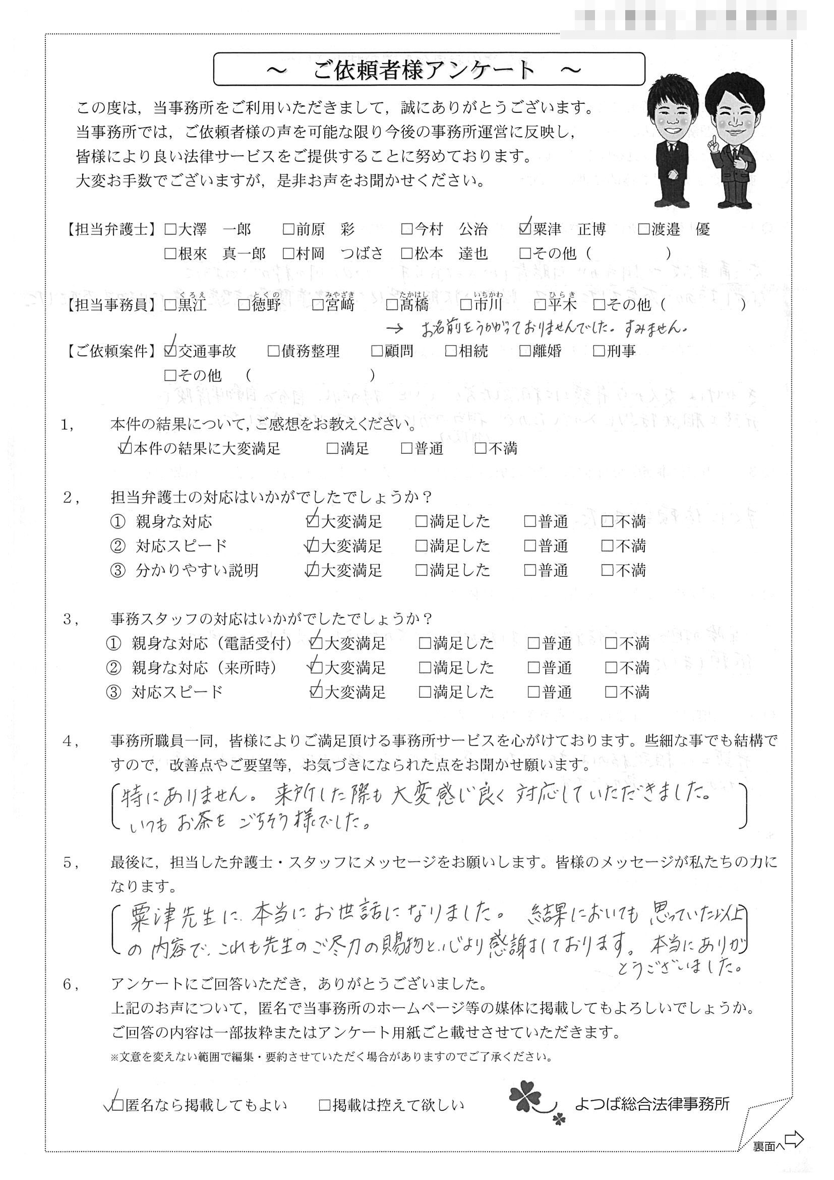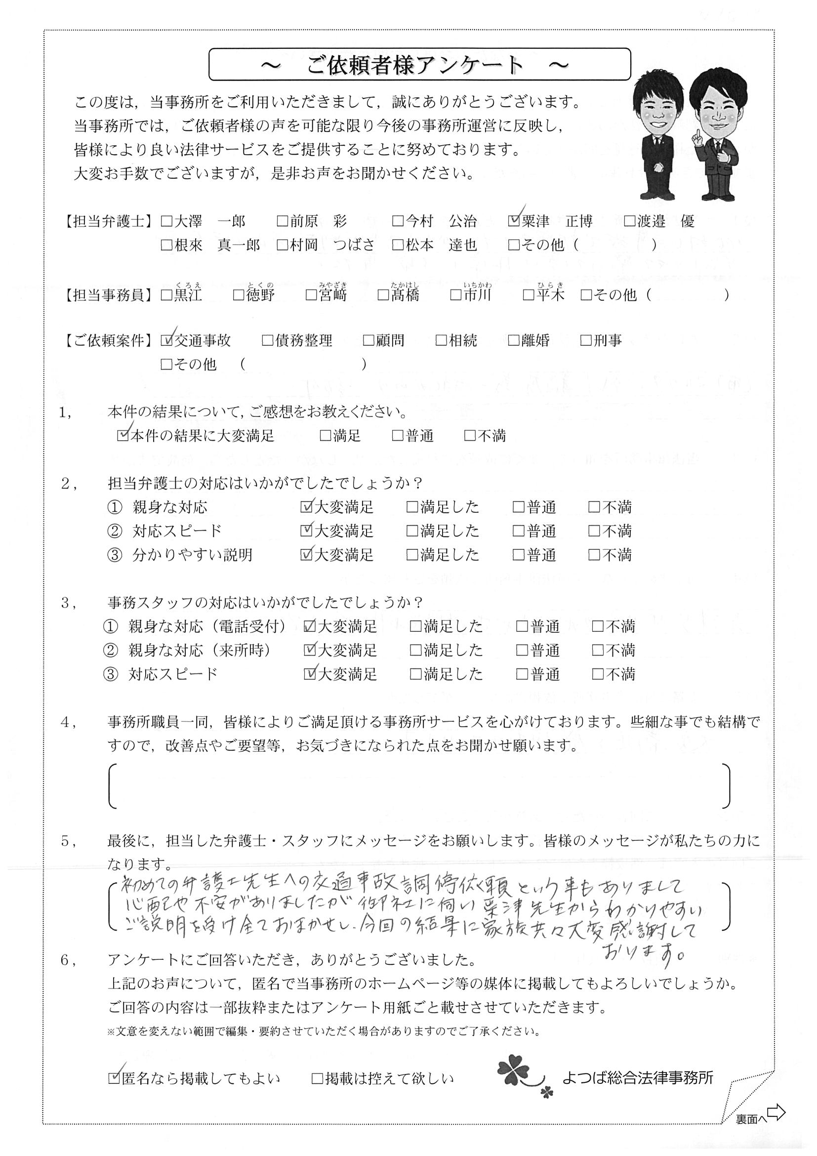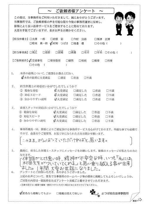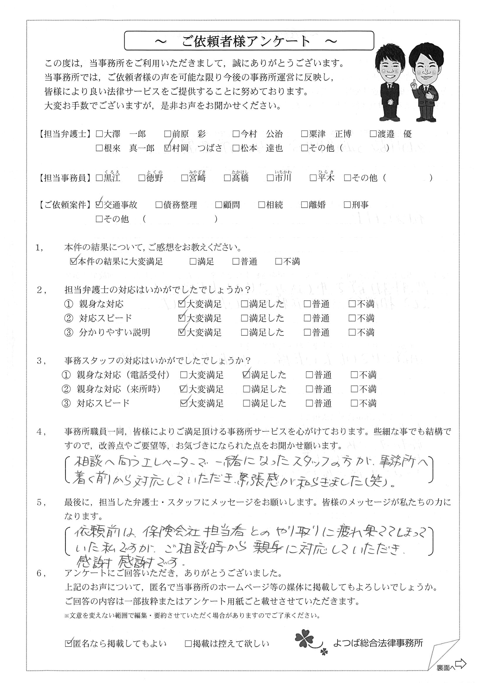 前回は個人再生で、今回は交通事故です。両方とも結果に大変満足しております。