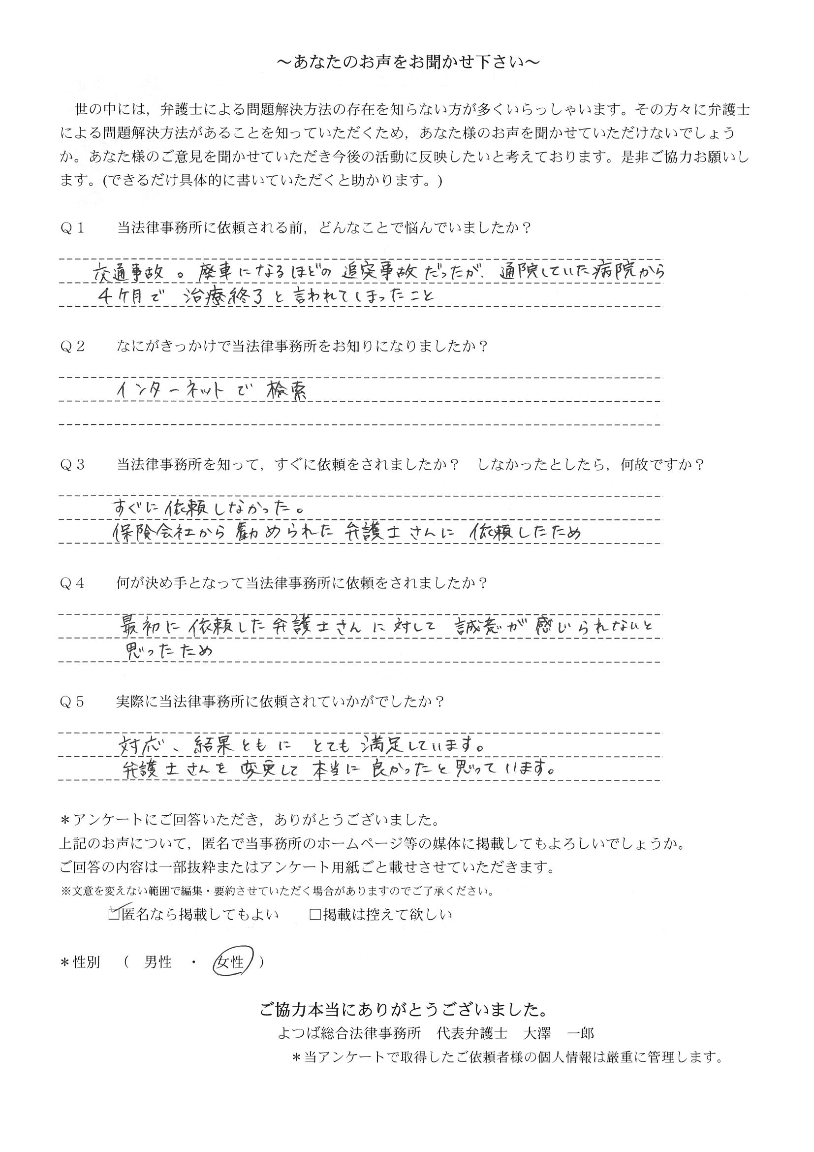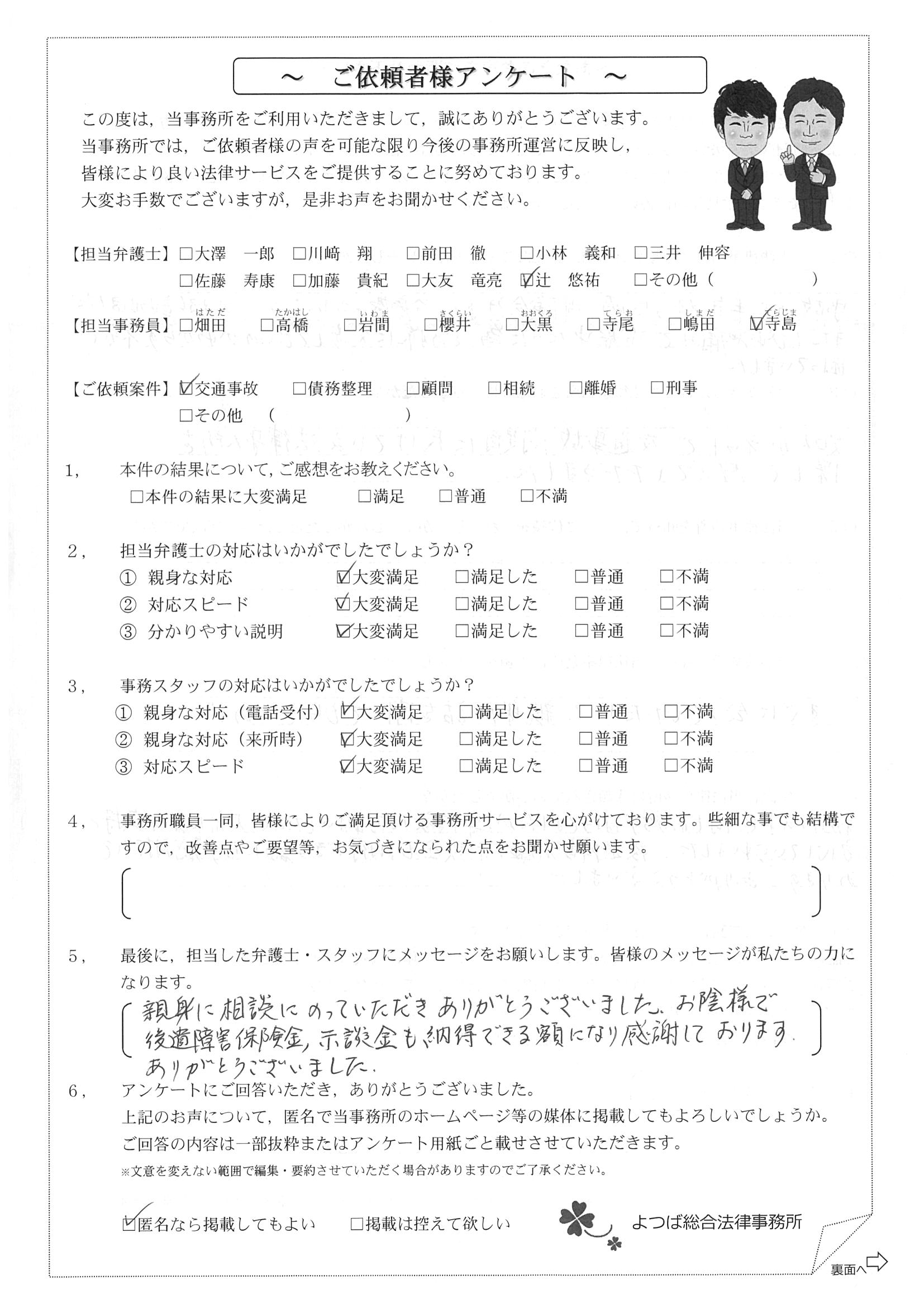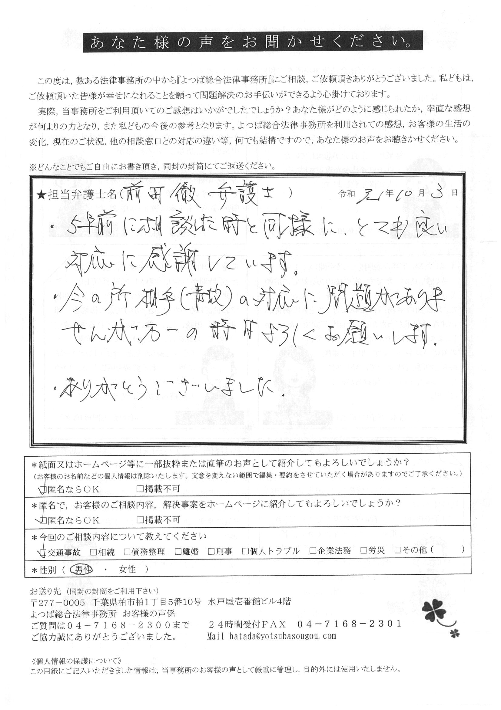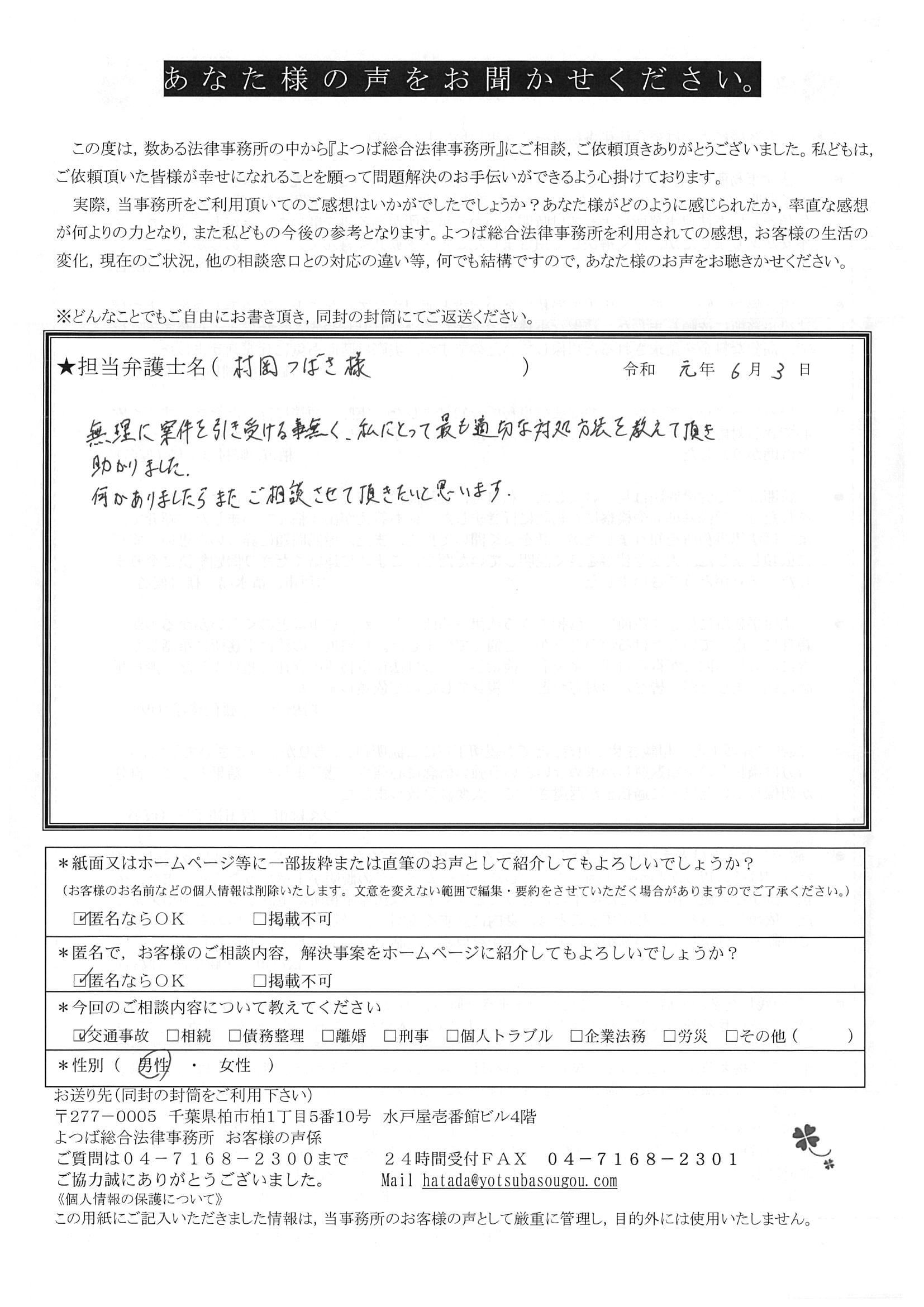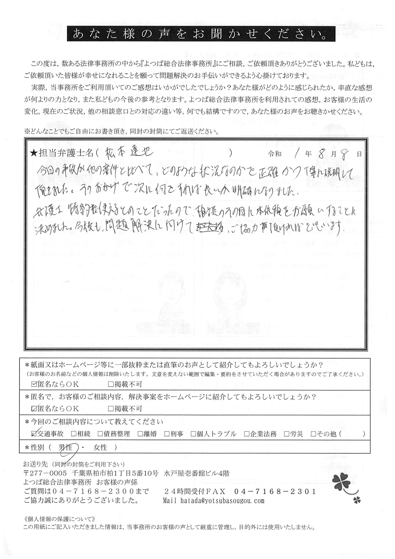 前回は個人再生で、今回は交通事故です。両方とも結果に大変満足しております。