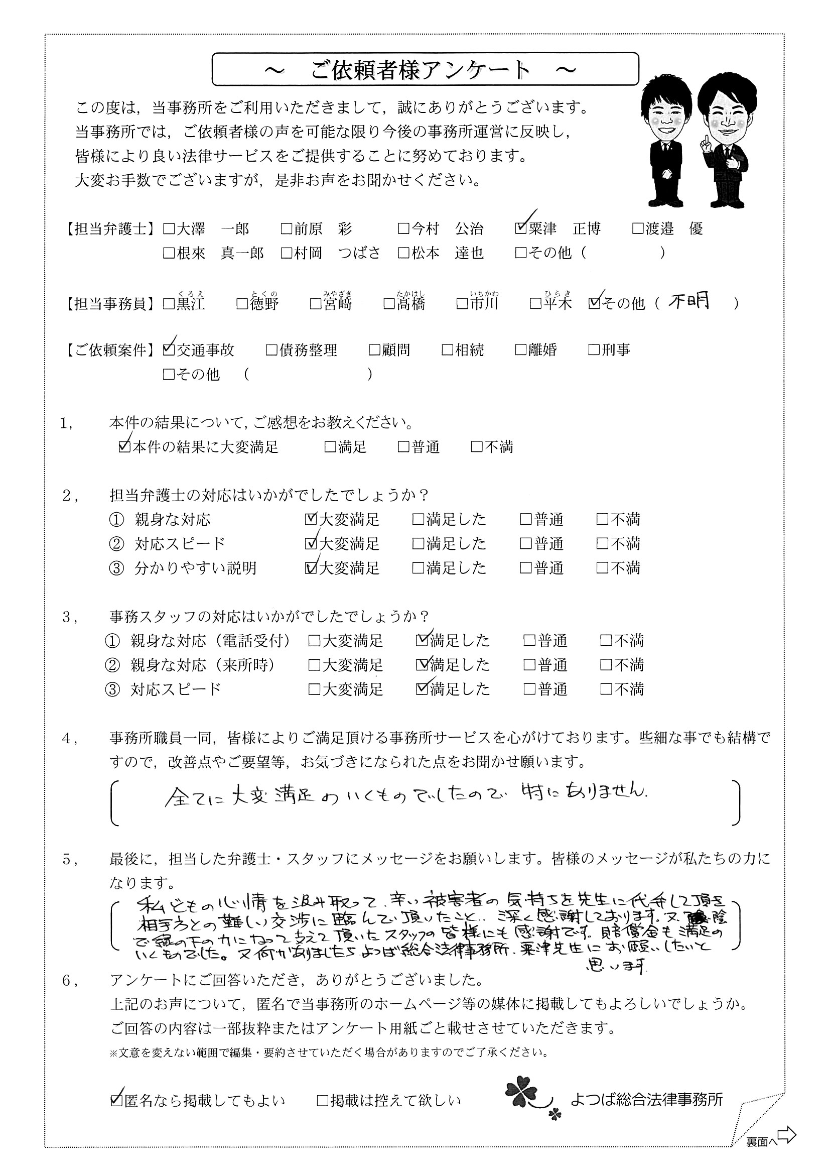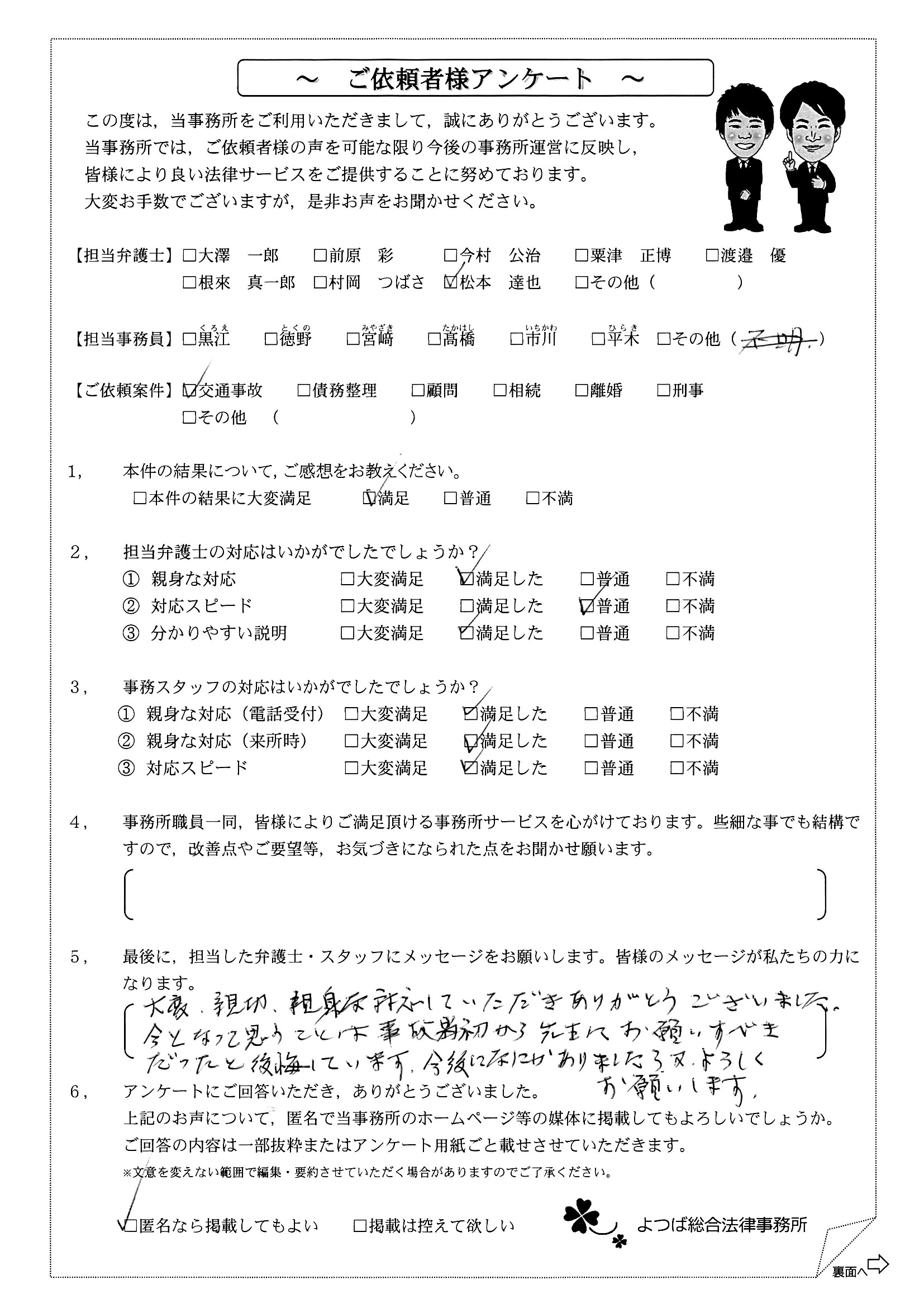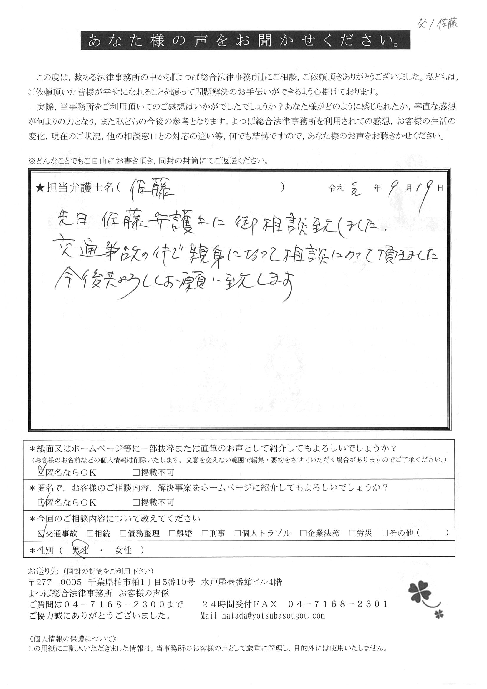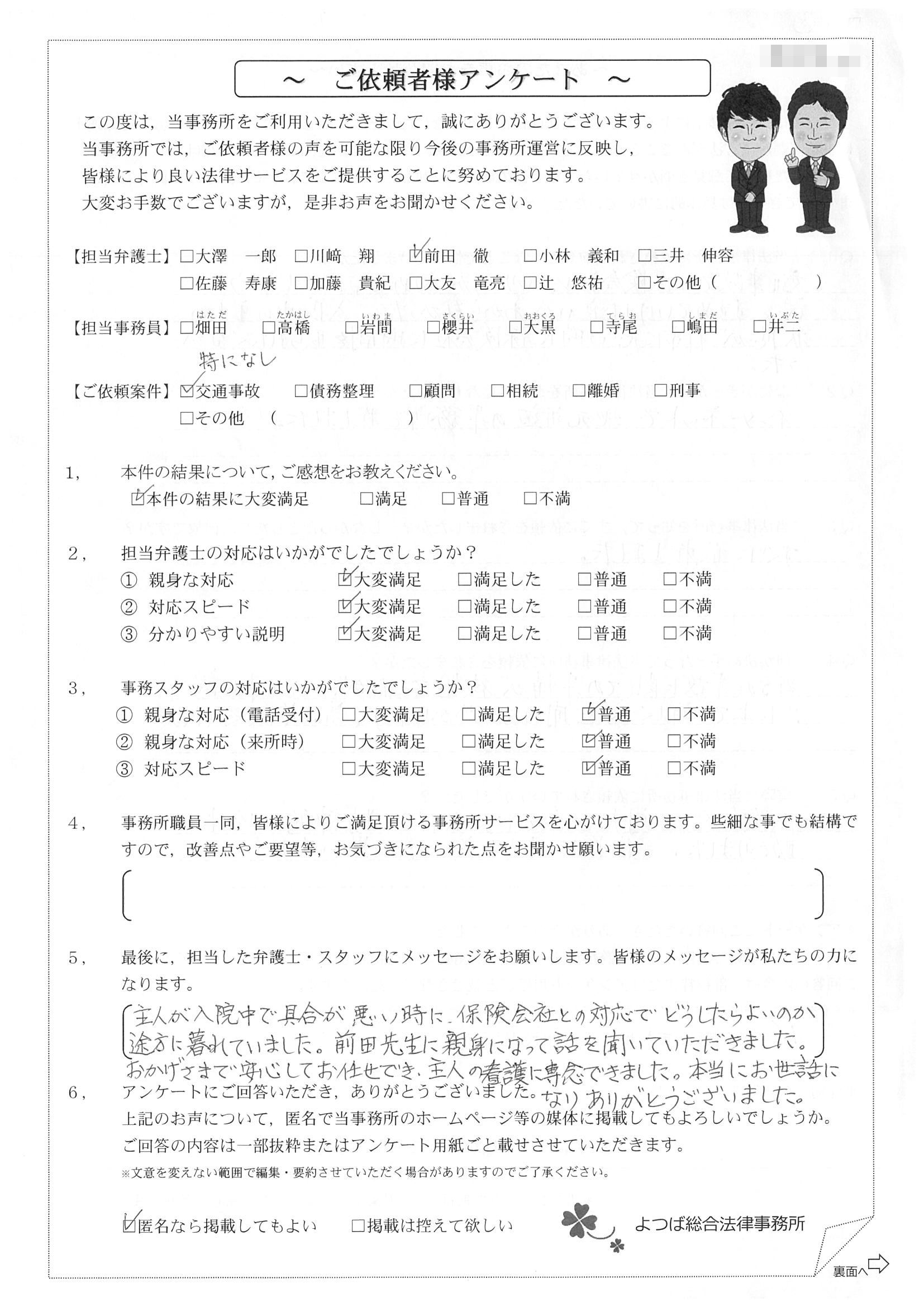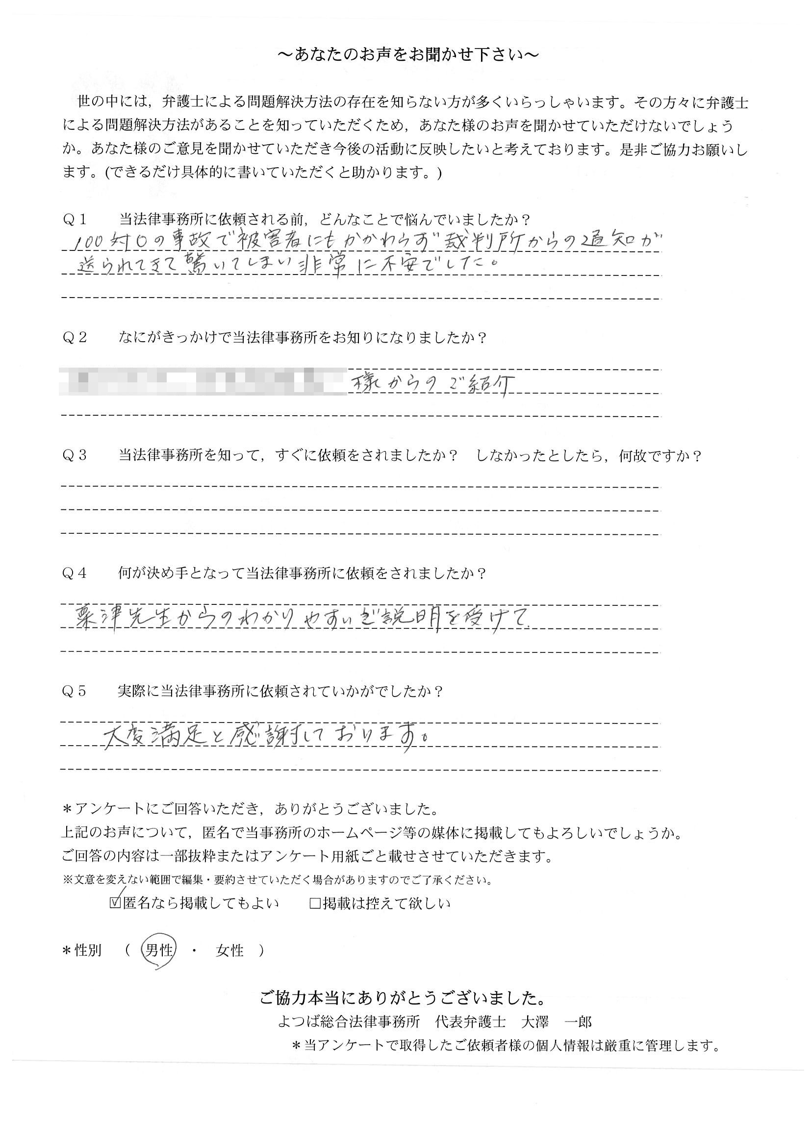 前回は個人再生で、今回は交通事故です。両方とも結果に大変満足しております。