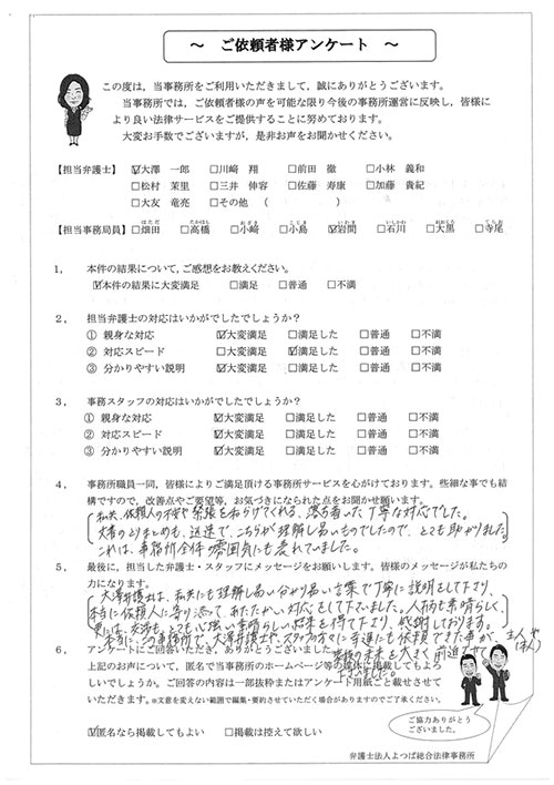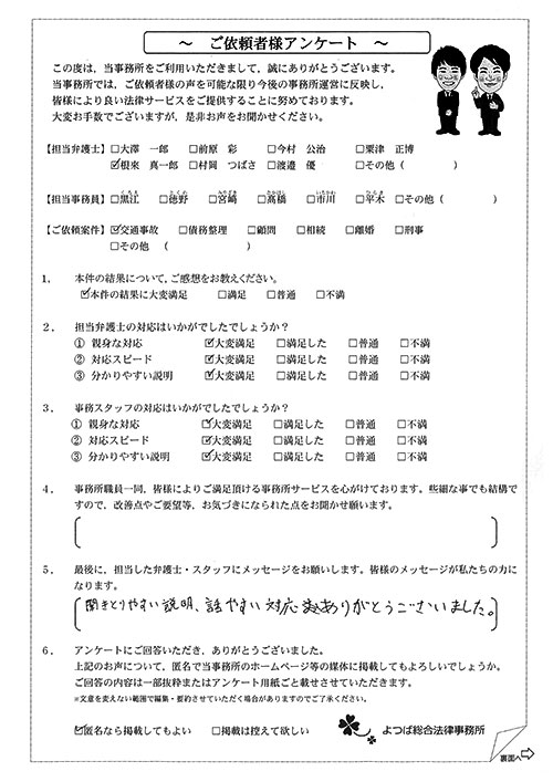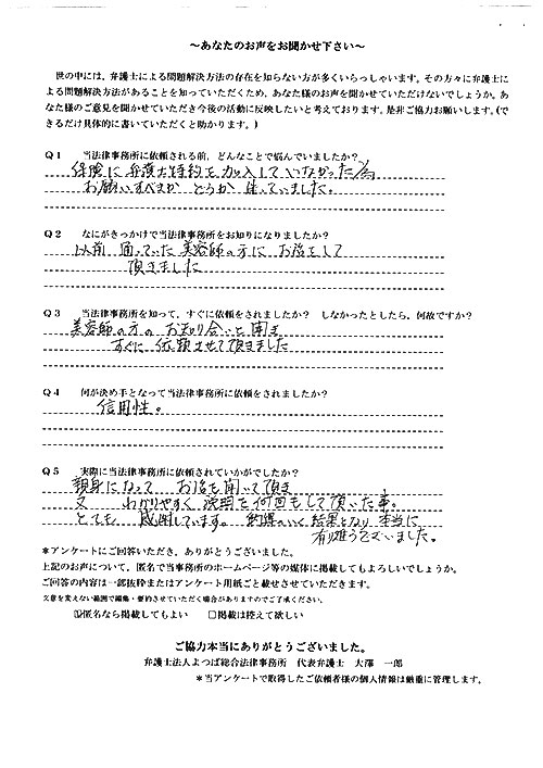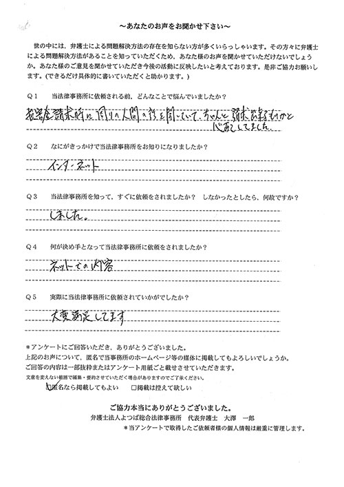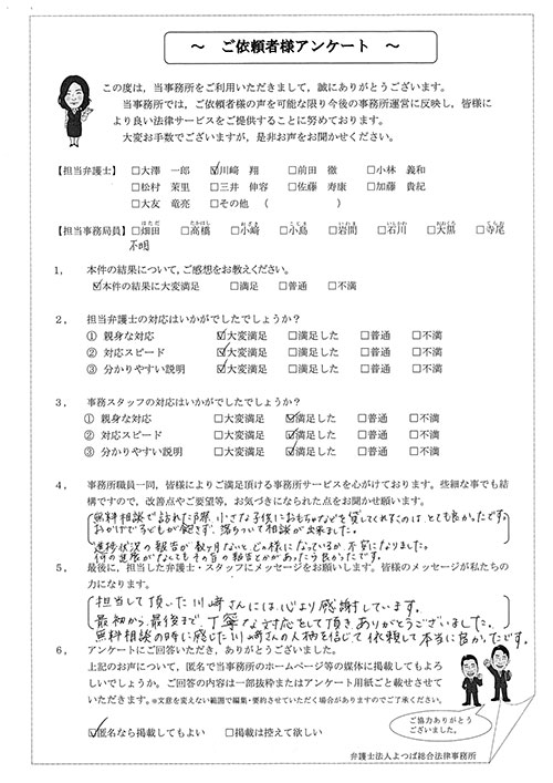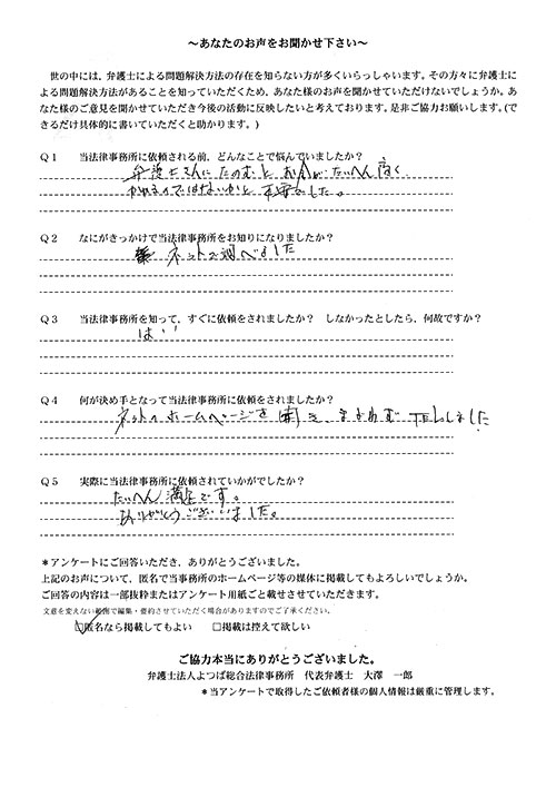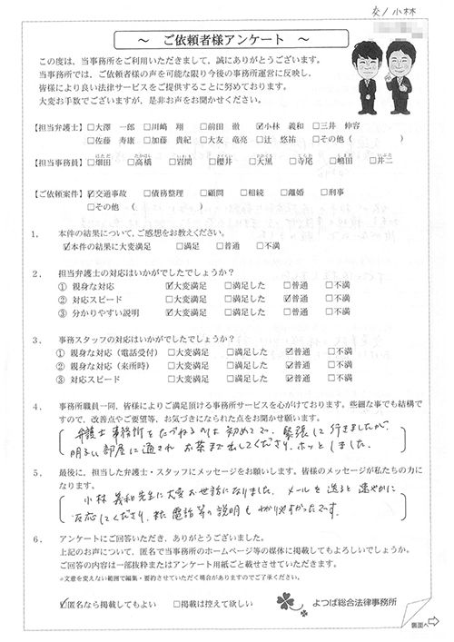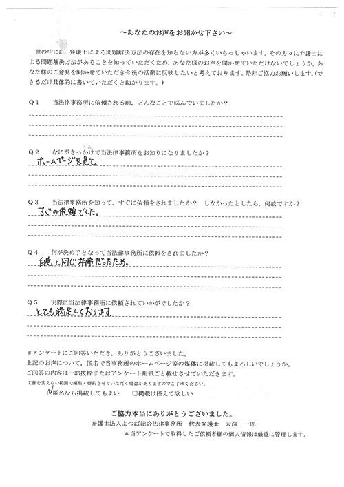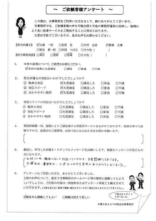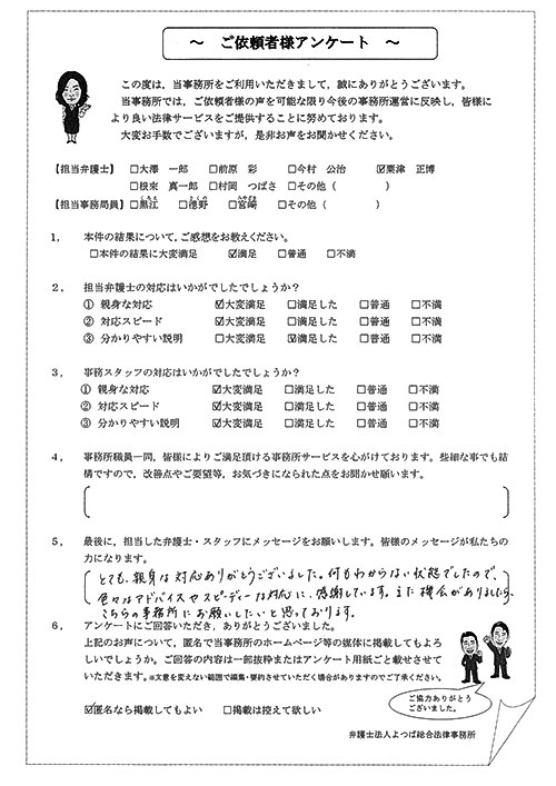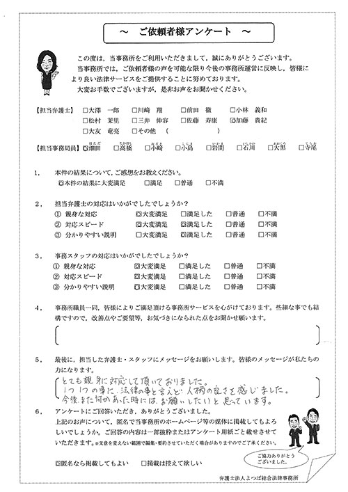 この度は御対応頂きありがとうございました。丁寧な説明で、初めて弁護士さんに依頼したのですが、終始安心してお任せさせて頂く事が出来ました。結果にも大変満足しております。