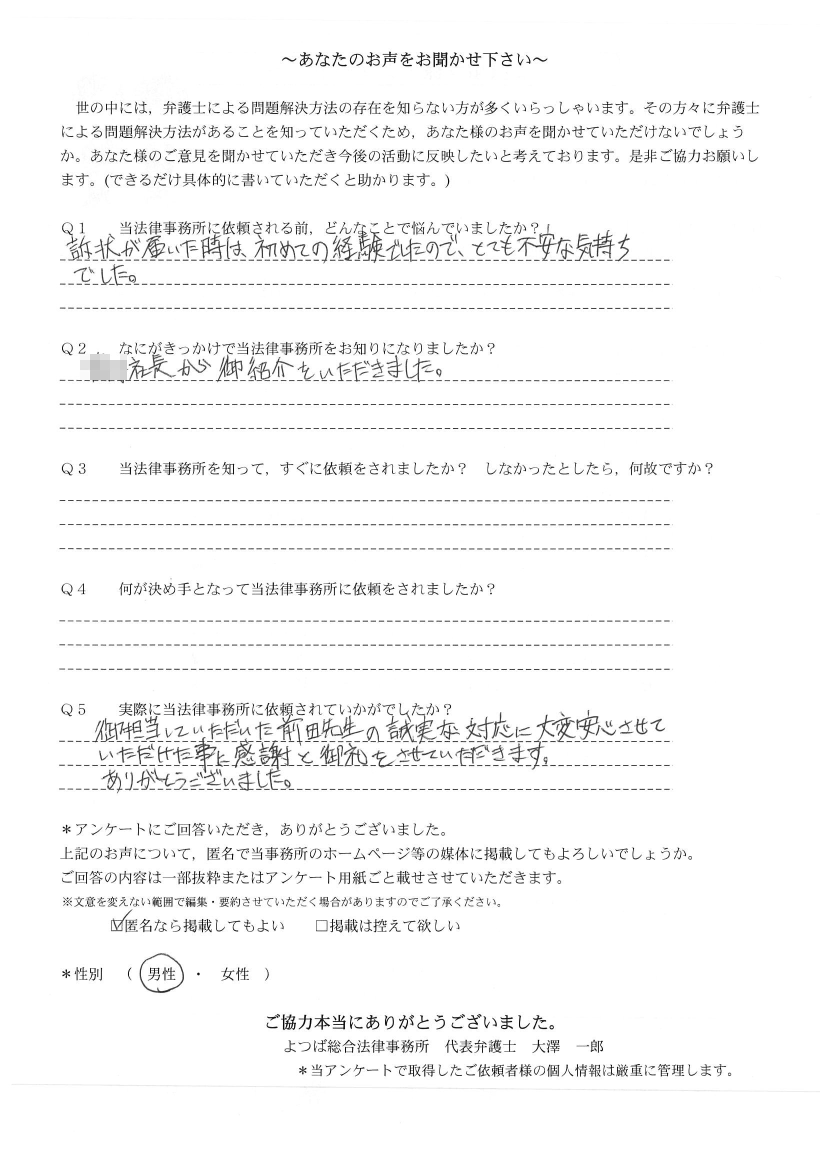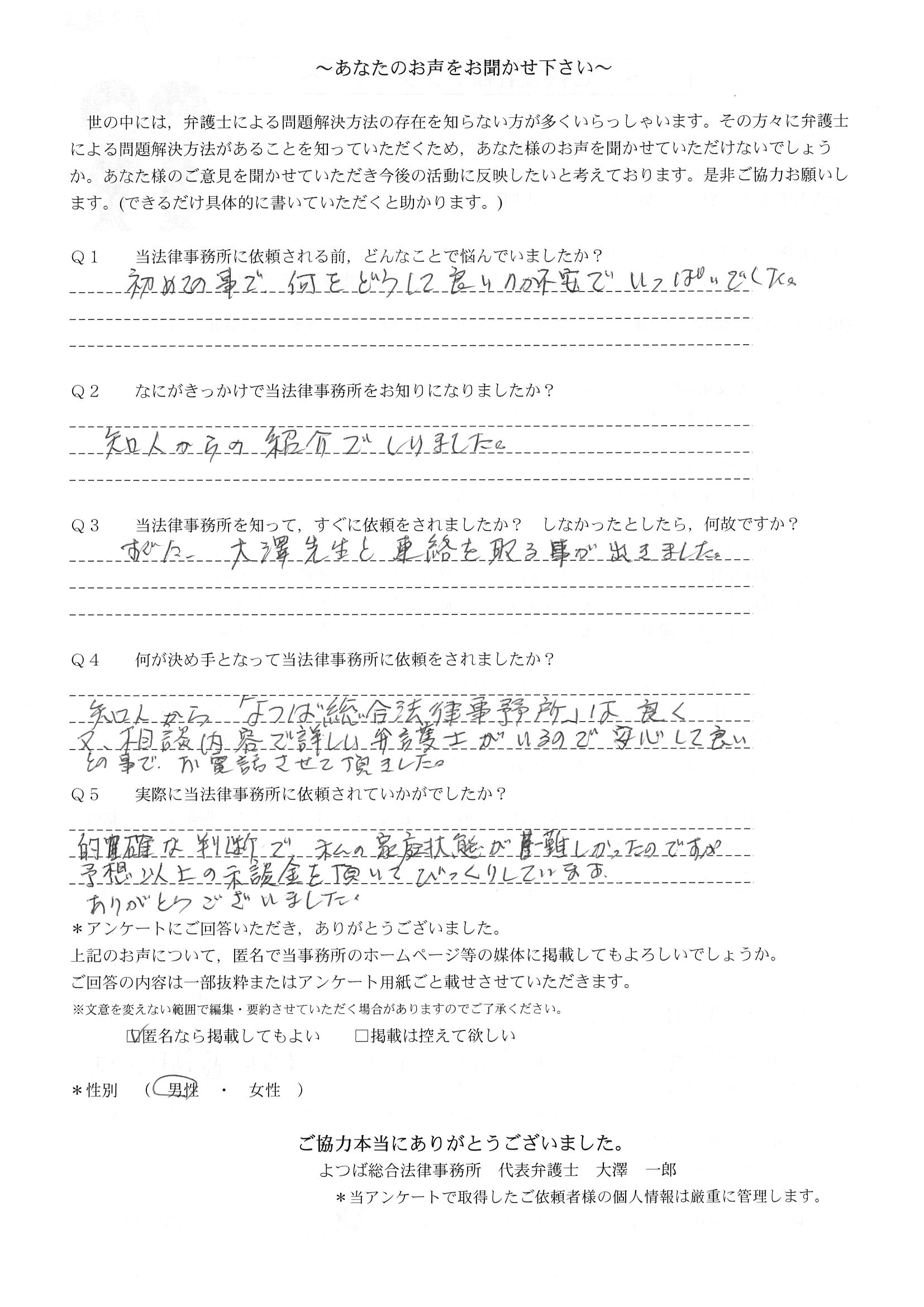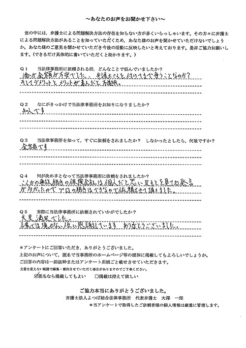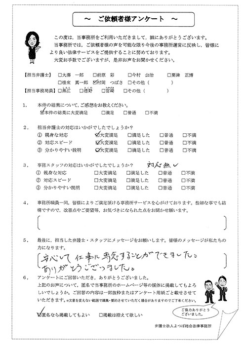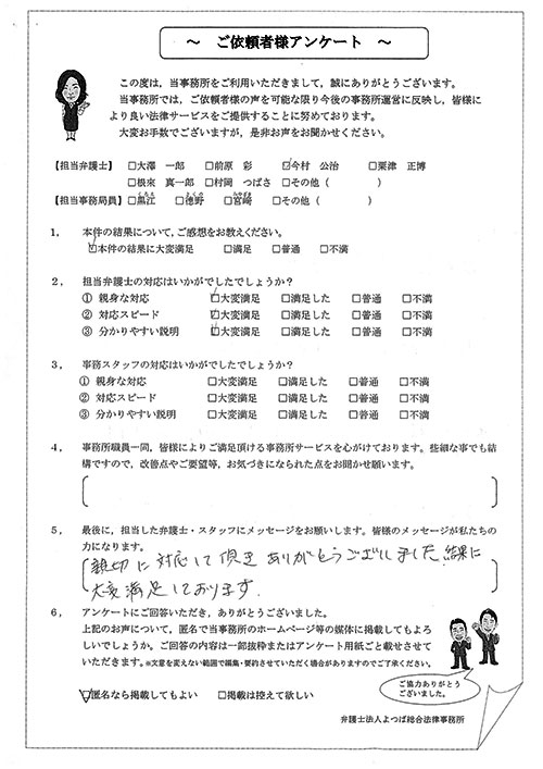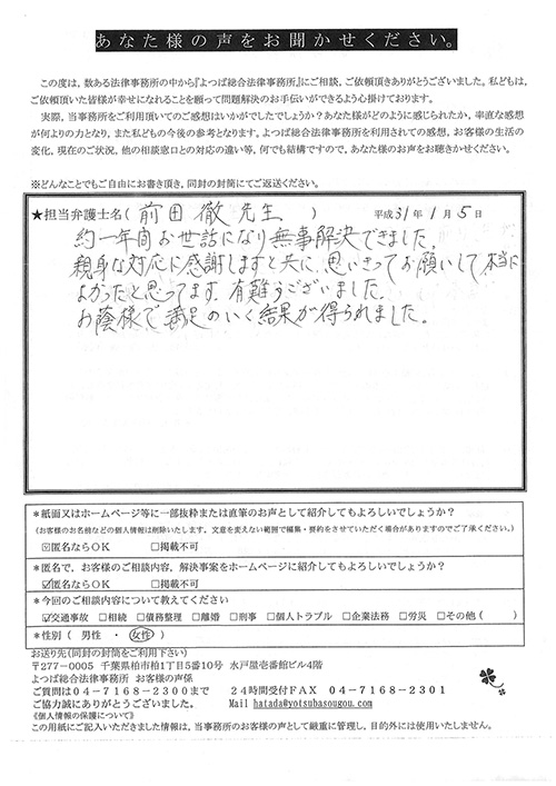この度は御対応頂きありがとうございました。丁寧な説明で、初めて弁護士さんに依頼したのですが、終始安心してお任せさせて頂く事が出来ました。結果にも大変満足しております。