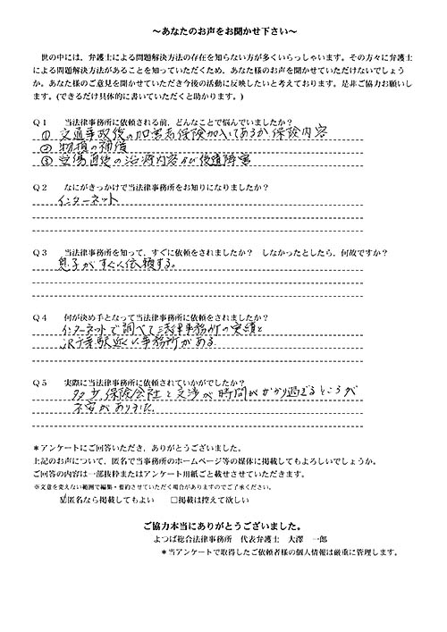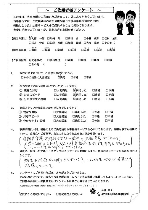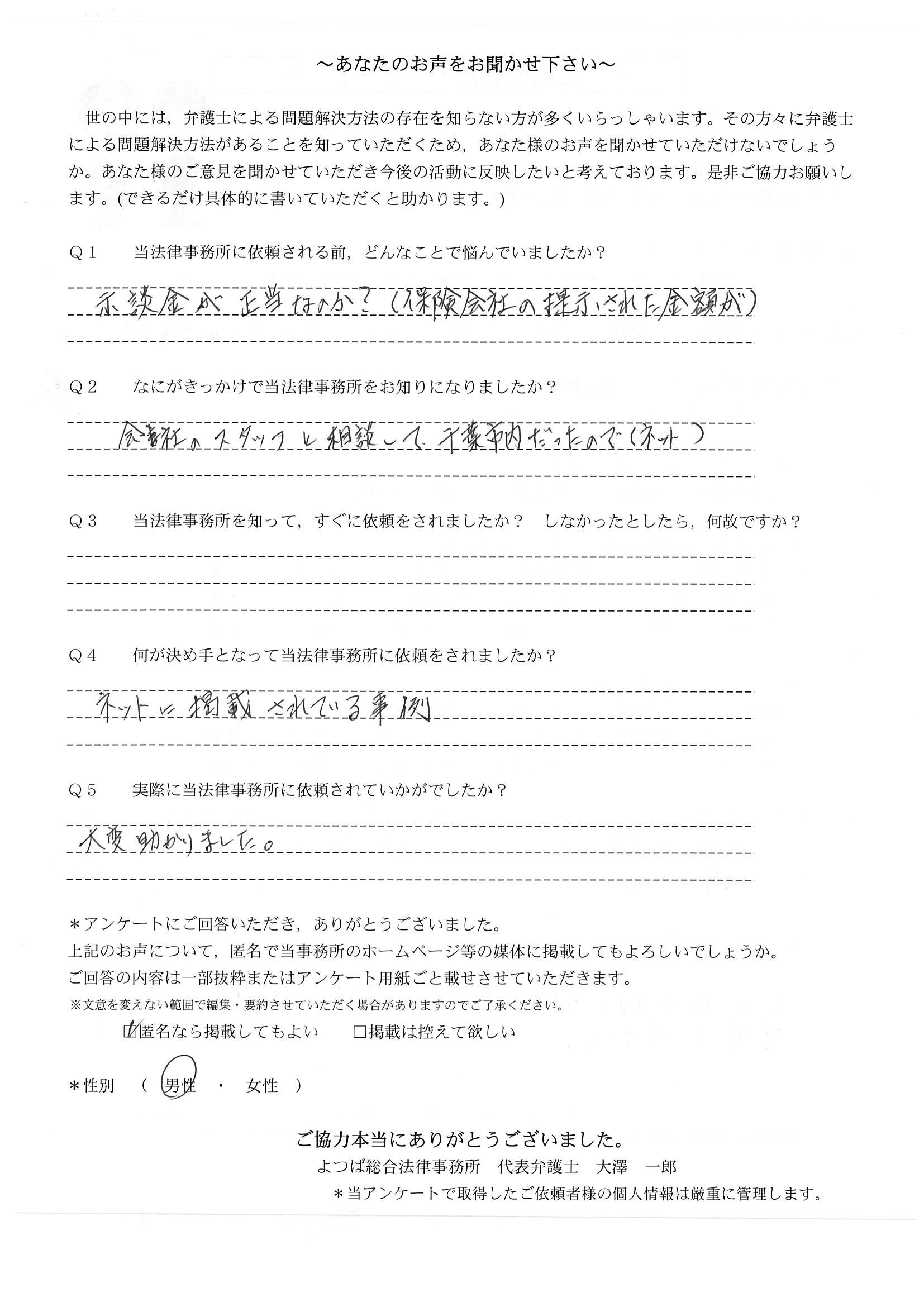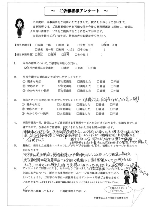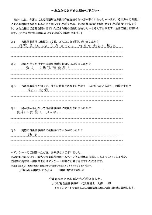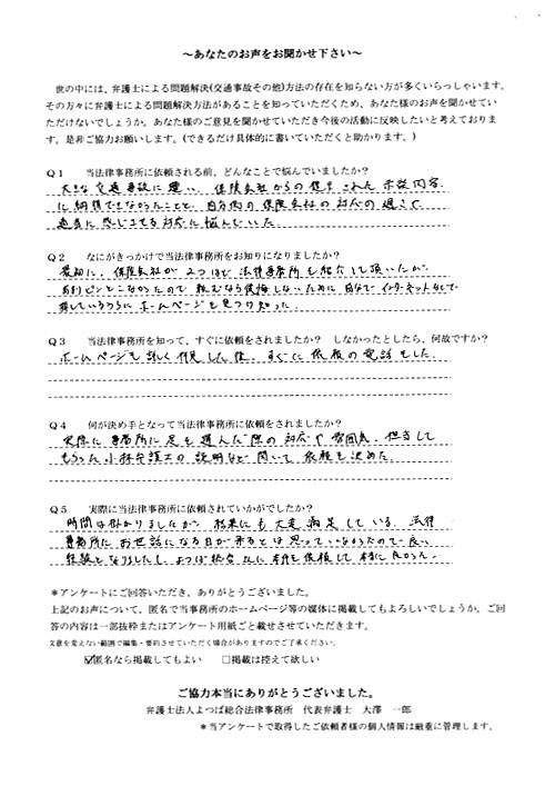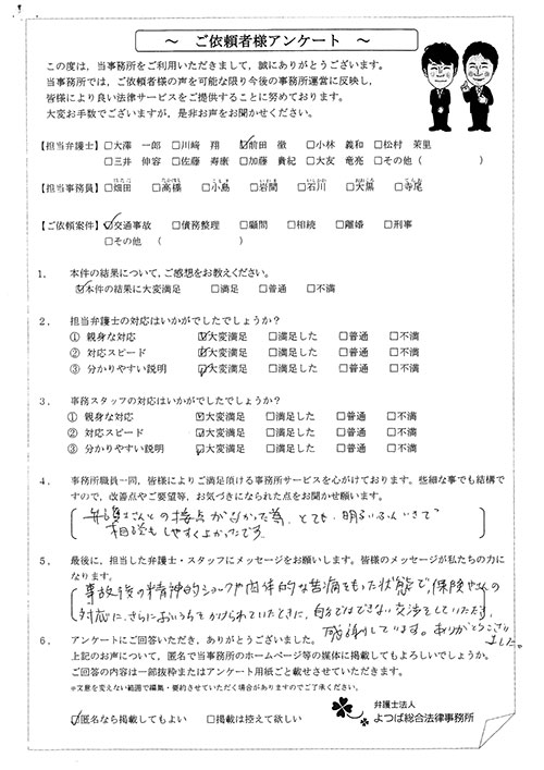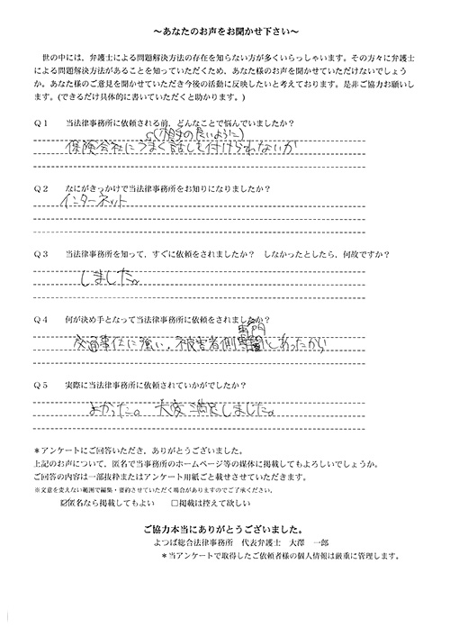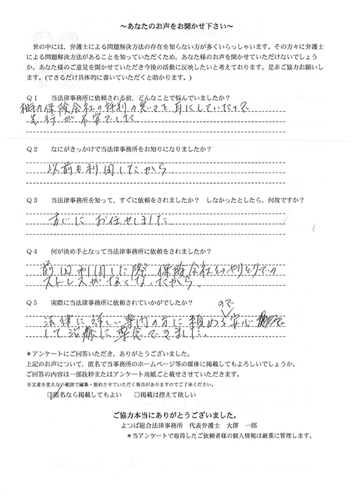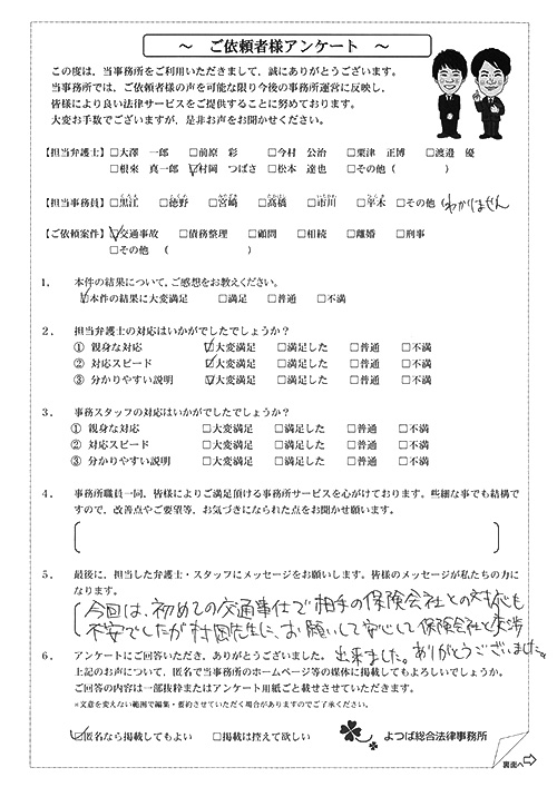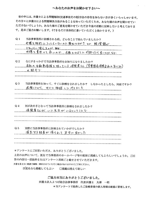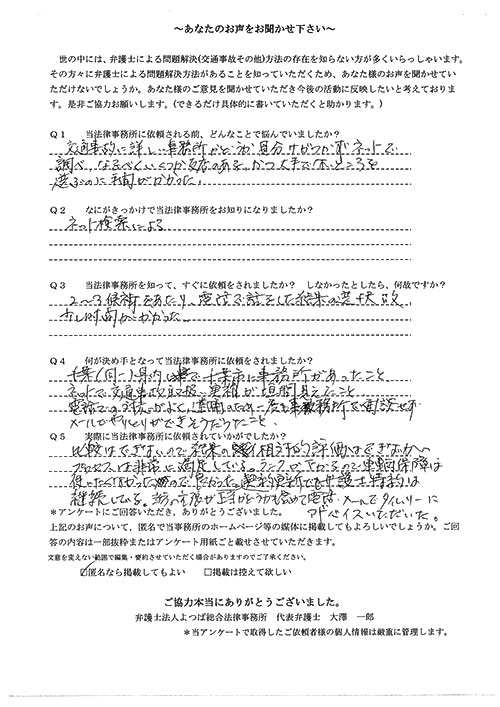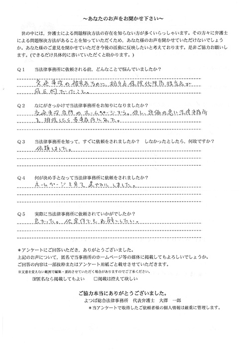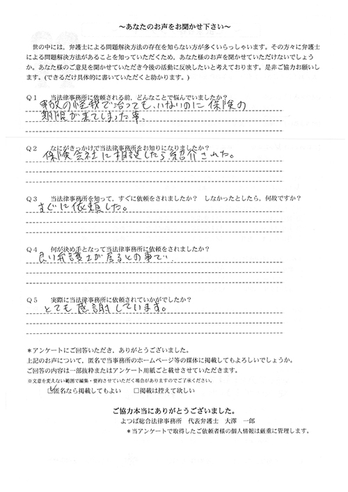 ご依頼した傷害保険会社との交渉以外にも、身近に起こった小さな相談事にも話を聞いていただき、相談に乗っていただき助かりました。また主たる依頼(保険会社との交渉)についても、当初、私が期待していた以上の成果をあげていただき、依頼して良かったと思っております。感謝です。ホームページで貴事務所の地図を分かり易くして欲しい。近隣の地図上の位置も載せてほしい。