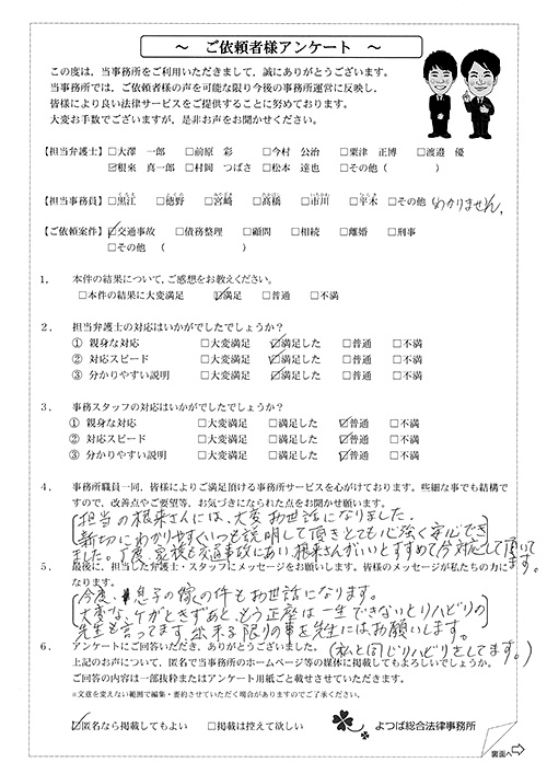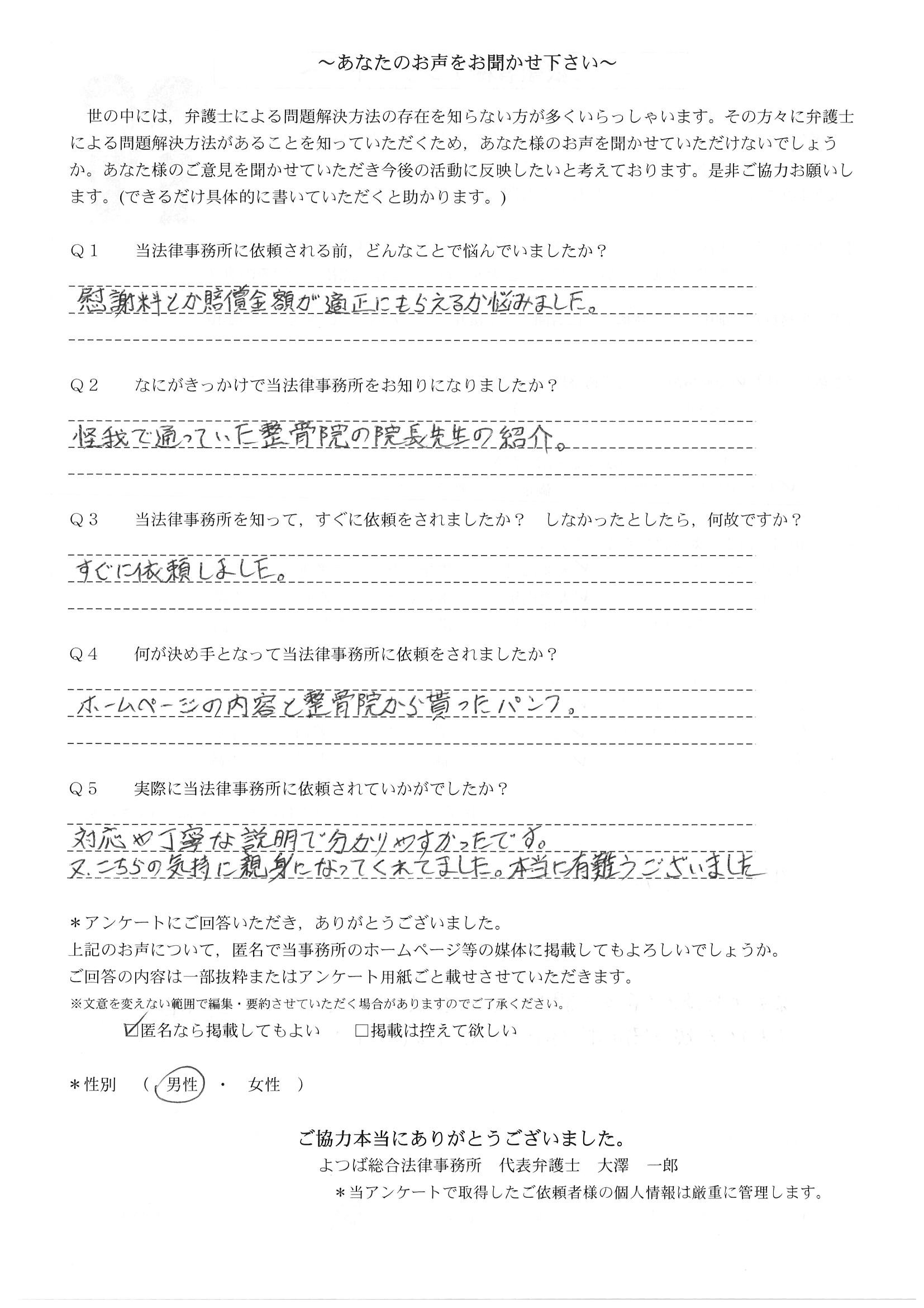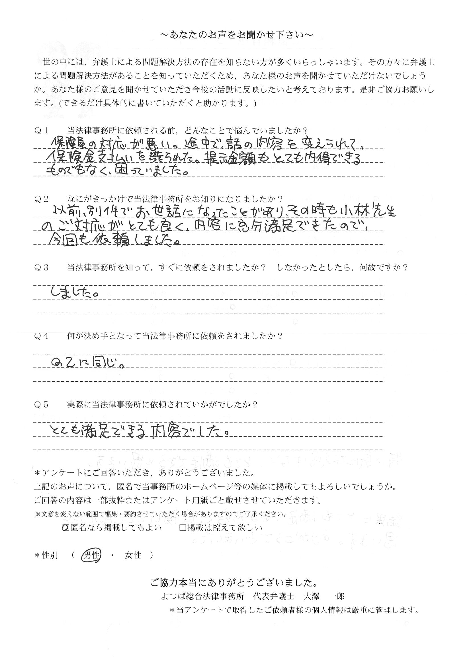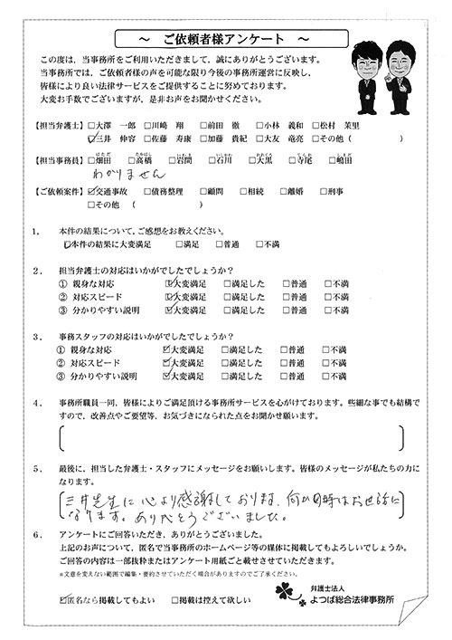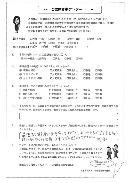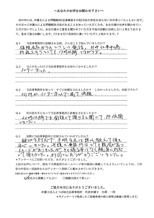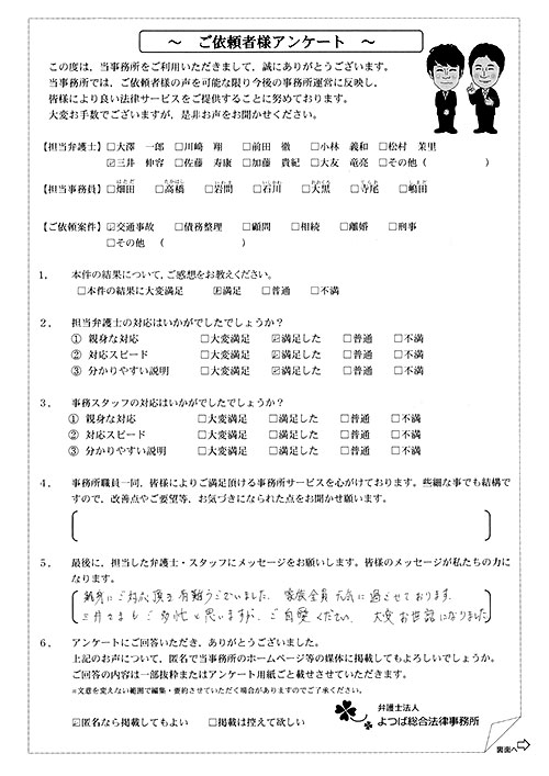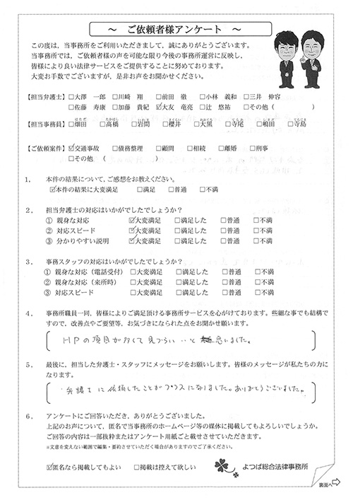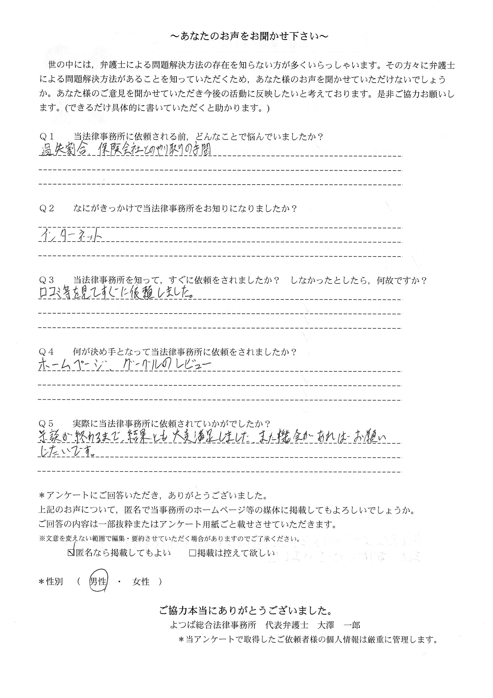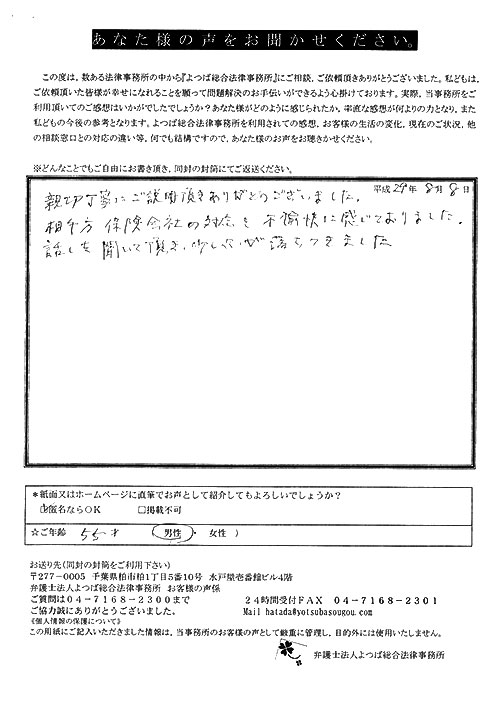 ご依頼した傷害保険会社との交渉以外にも、身近に起こった小さな相談事にも話を聞いていただき、相談に乗っていただき助かりました。また主たる依頼(保険会社との交渉)についても、当初、私が期待していた以上の成果をあげていただき、依頼して良かったと思っております。感謝です。ホームページで貴事務所の地図を分かり易くして欲しい。近隣の地図上の位置も載せてほしい。