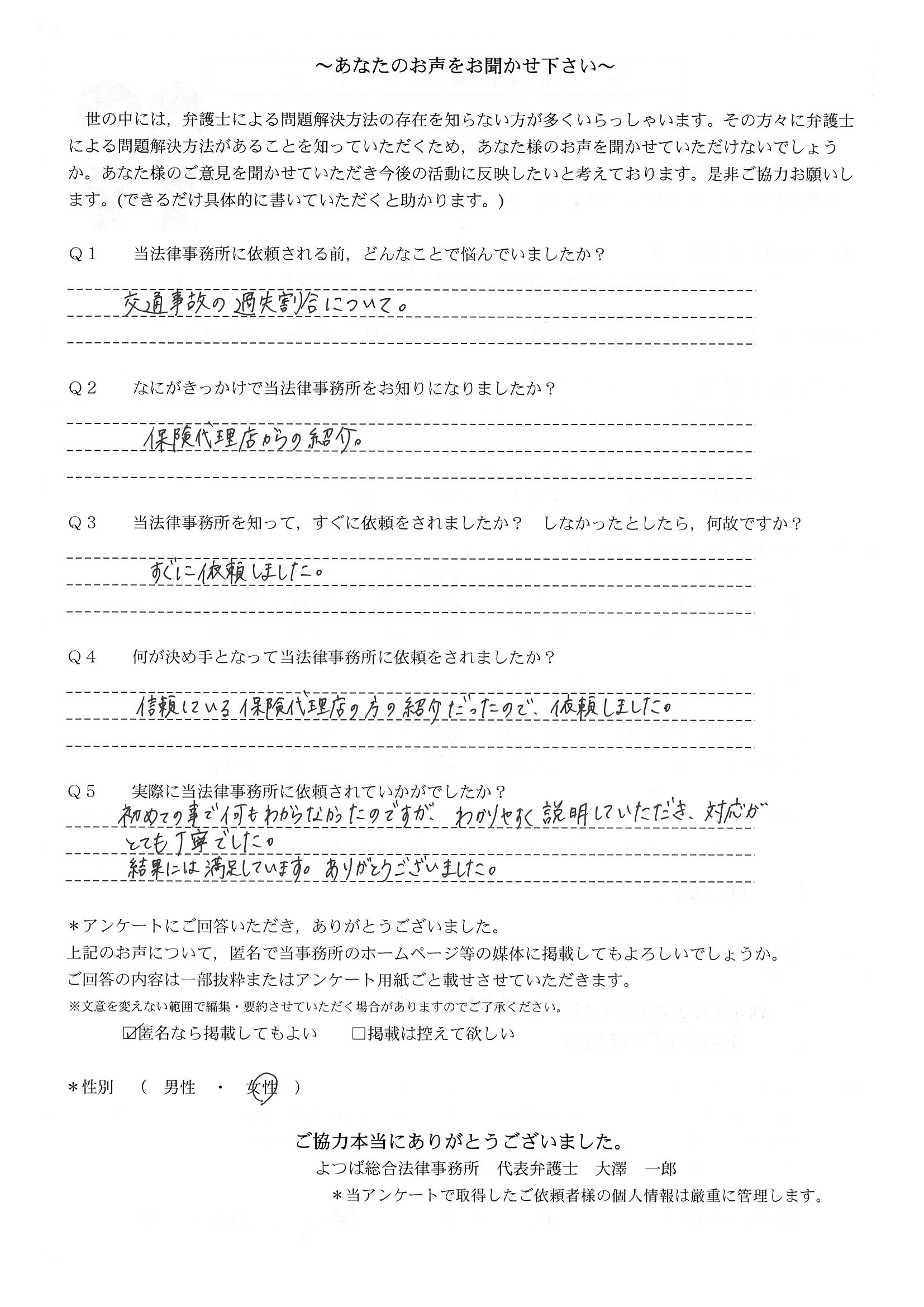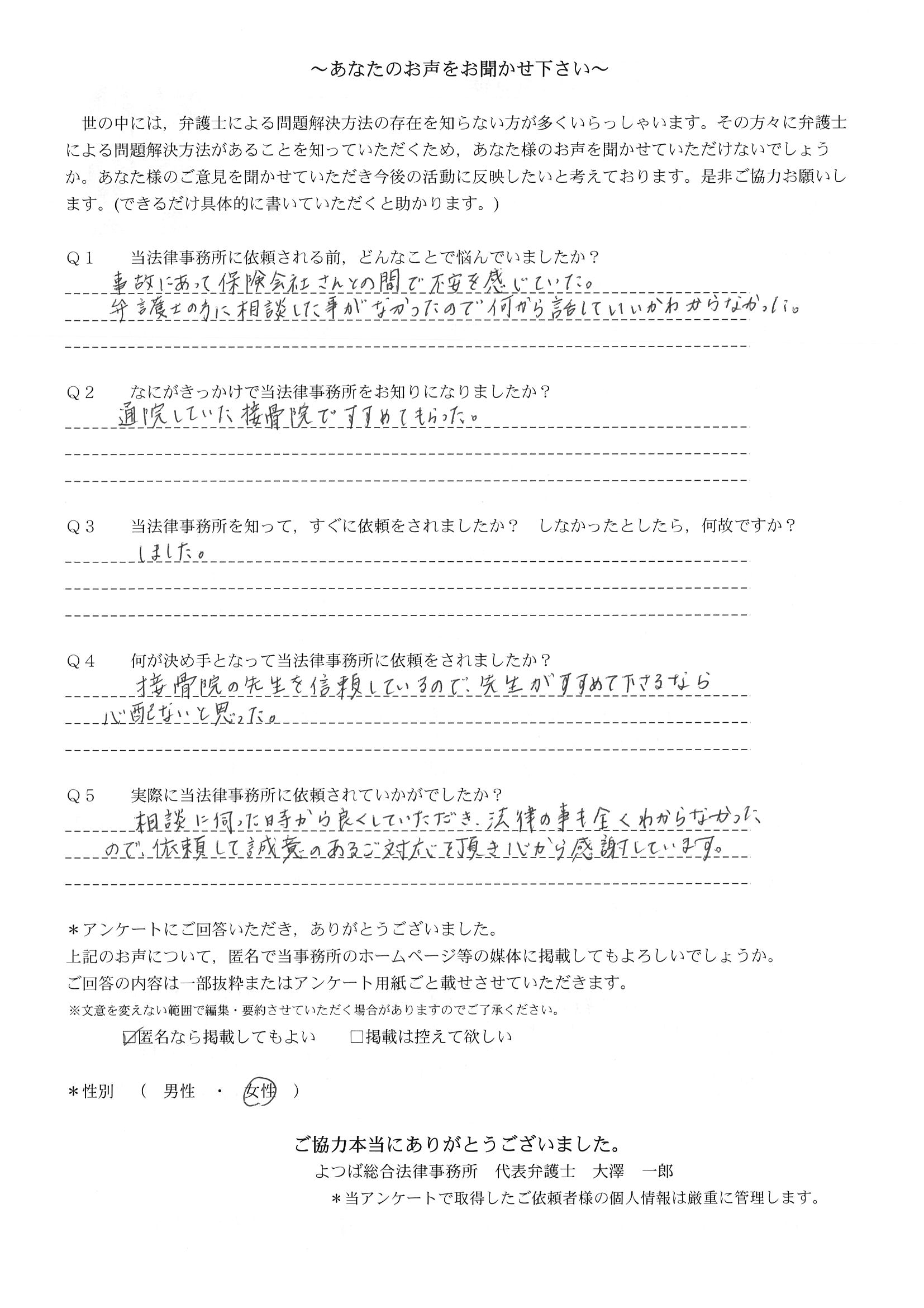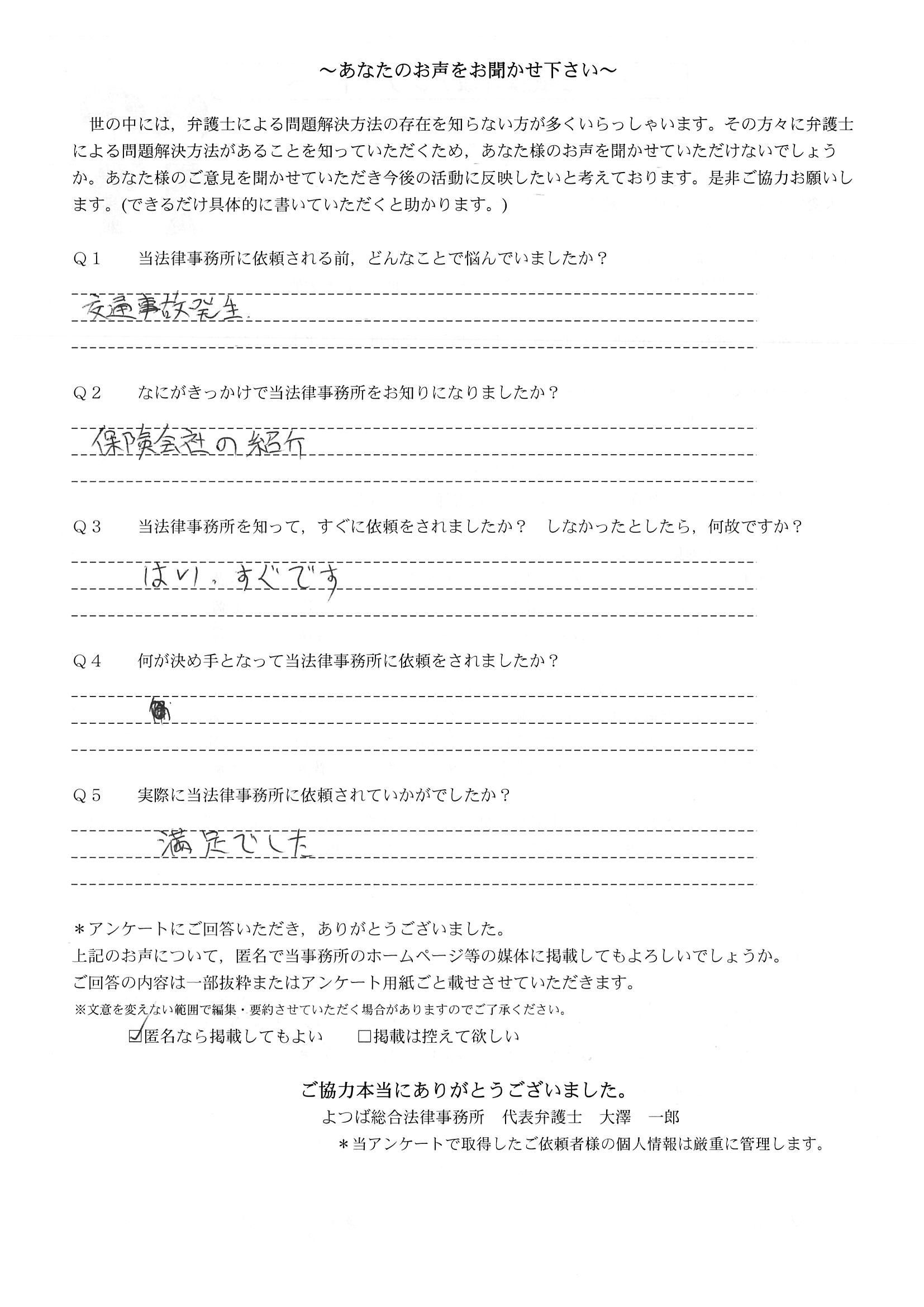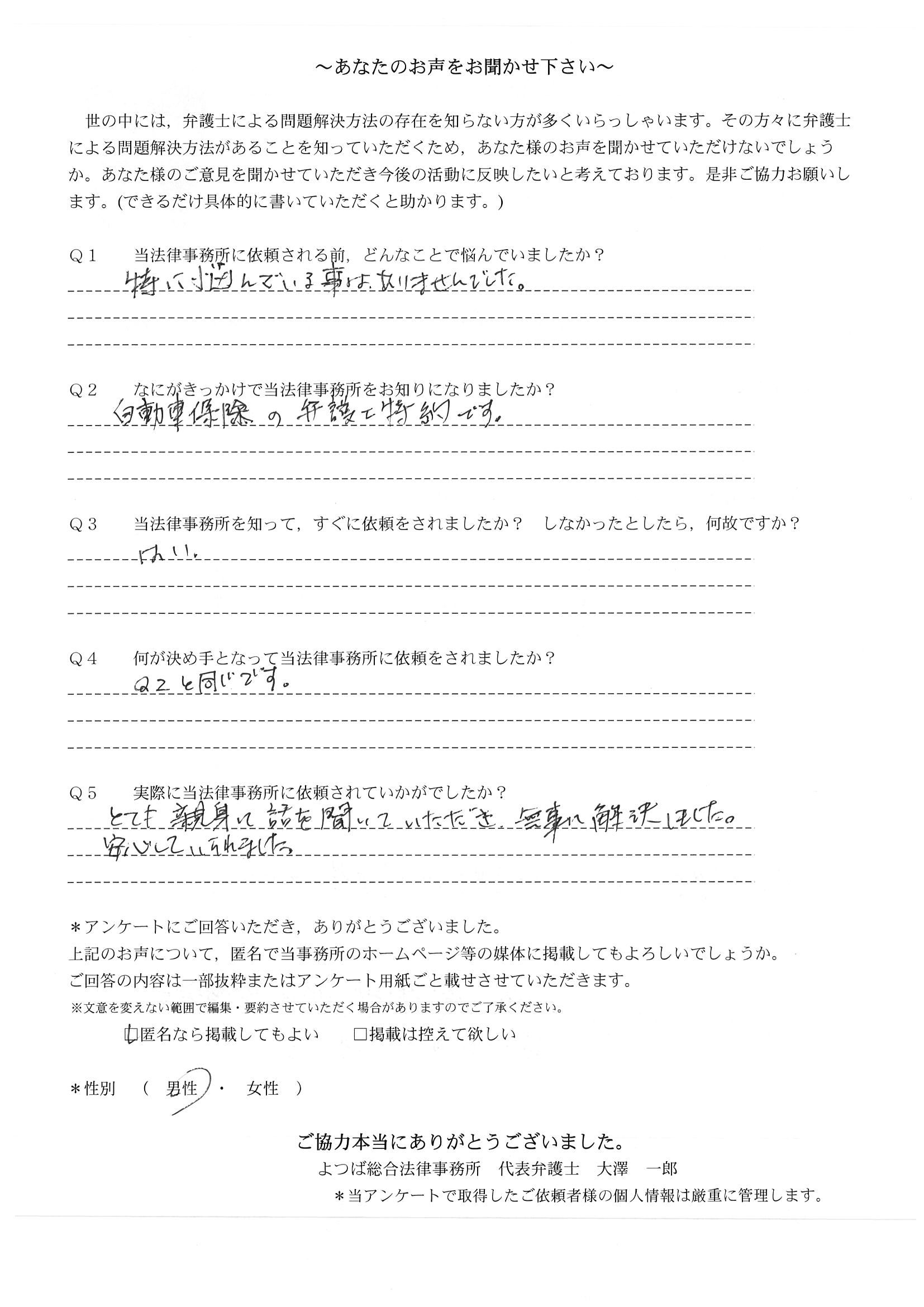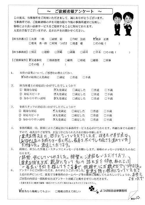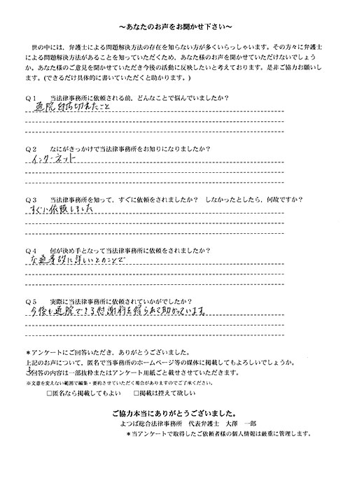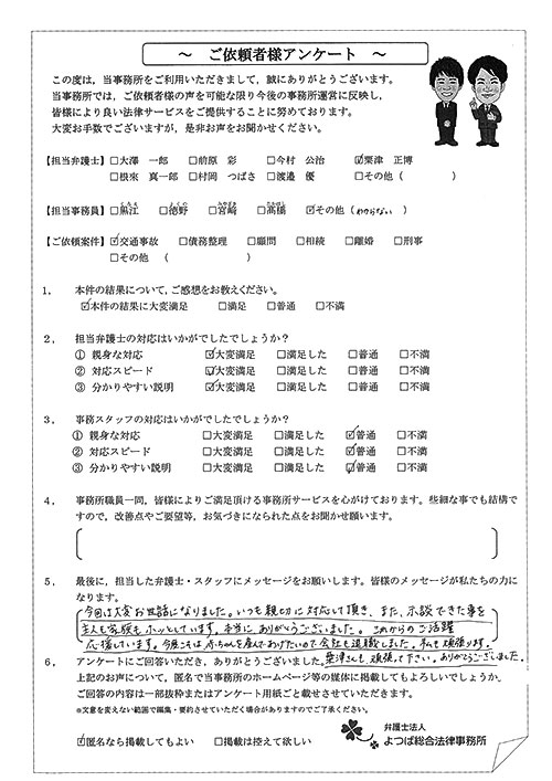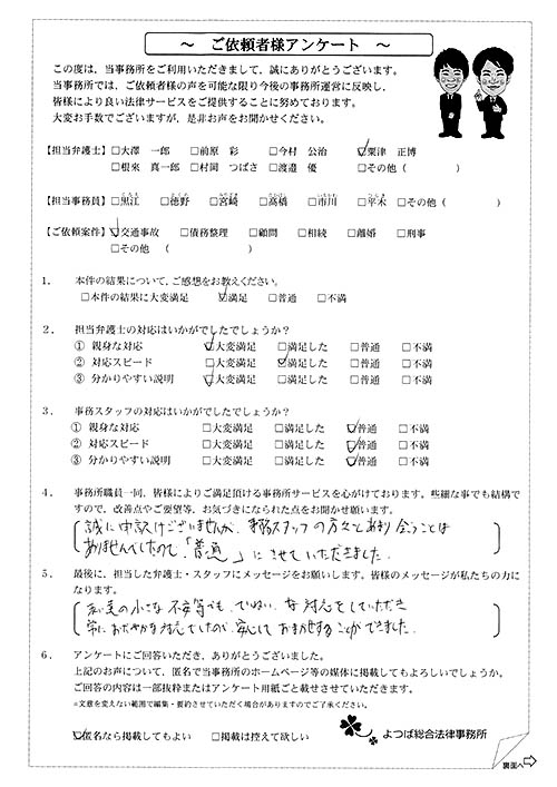 ご依頼した傷害保険会社との交渉以外にも、身近に起こった小さな相談事にも話を聞いていただき、相談に乗っていただき助かりました。また主たる依頼(保険会社との交渉)についても、当初、私が期待していた以上の成果をあげていただき、依頼して良かったと思っております。感謝です。ホームページで貴事務所の地図を分かり易くして欲しい。近隣の地図上の位置も載せてほしい。