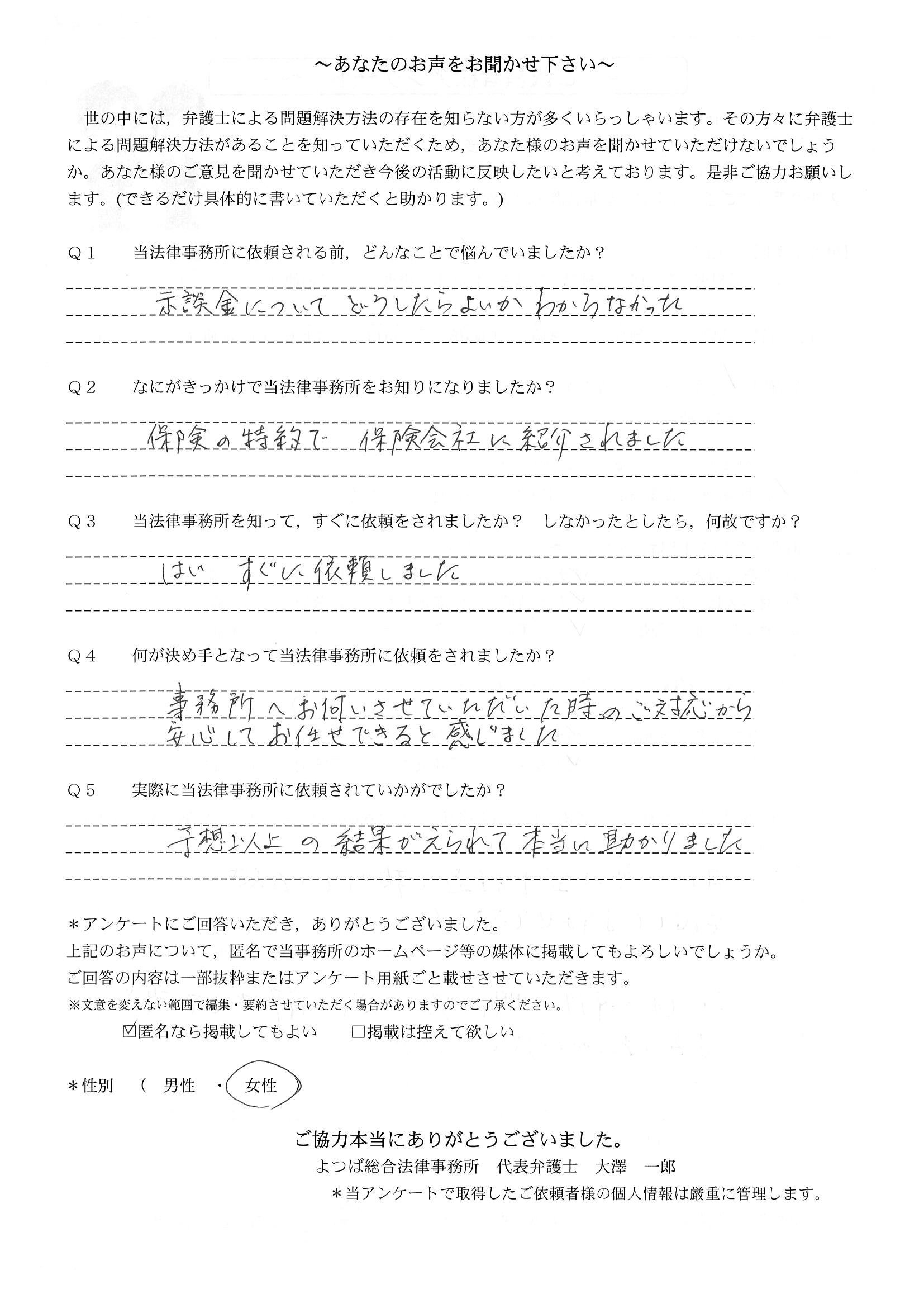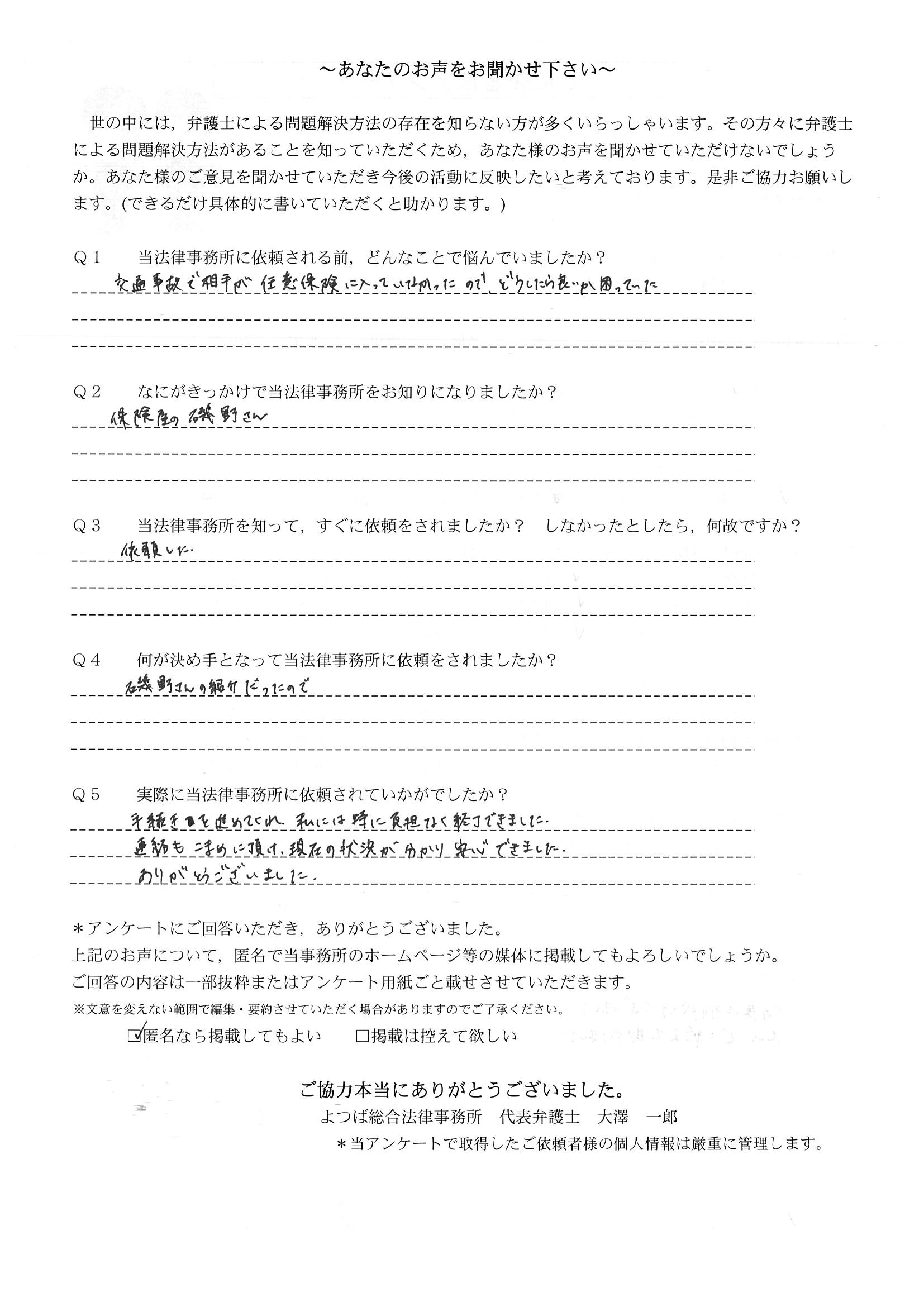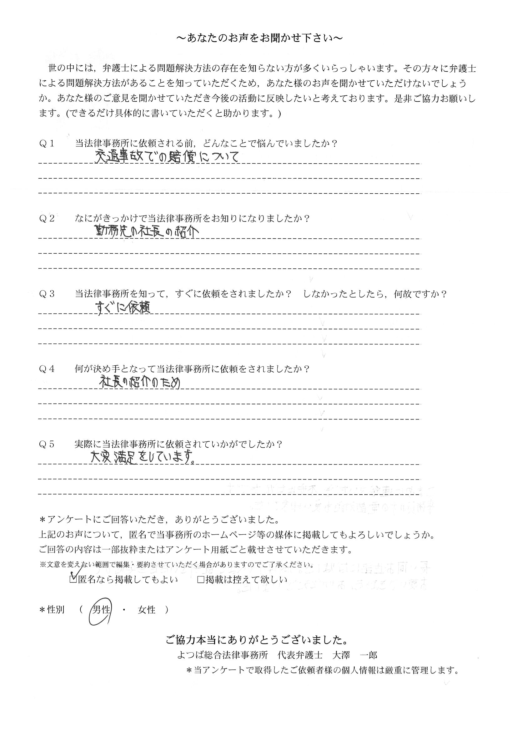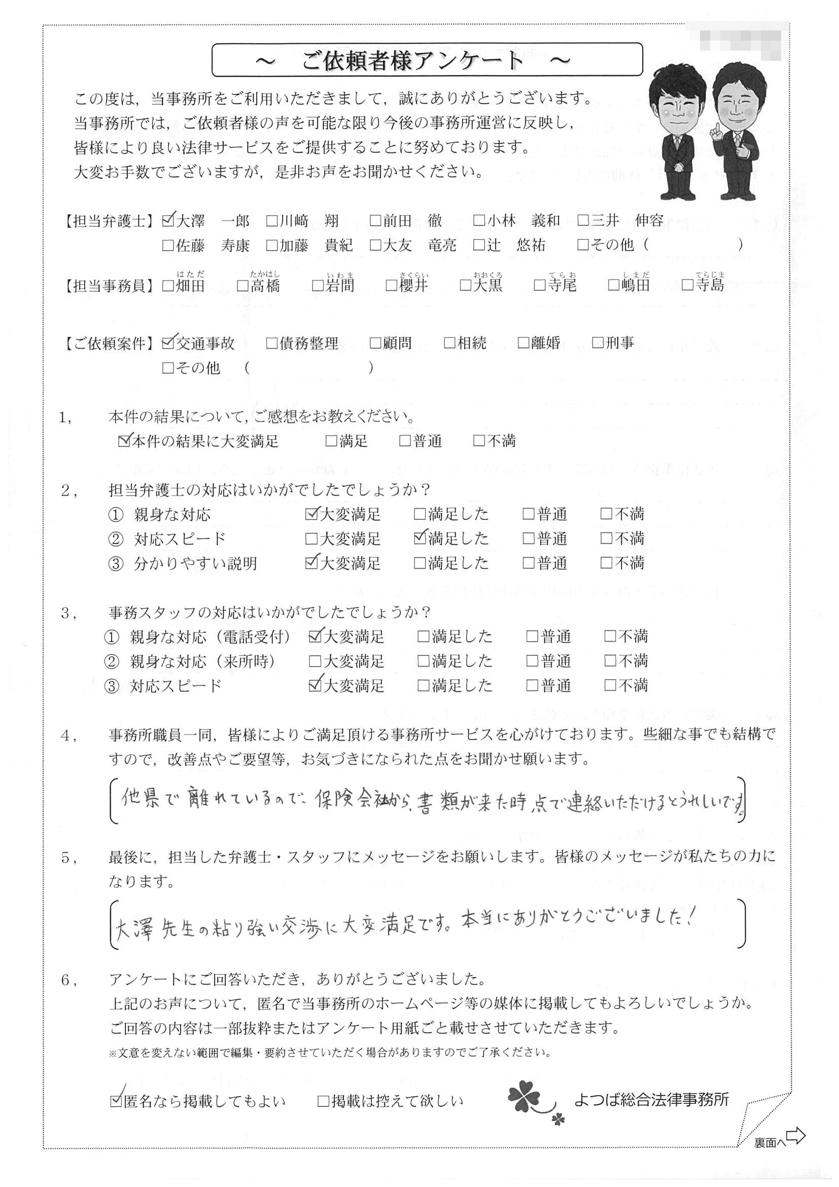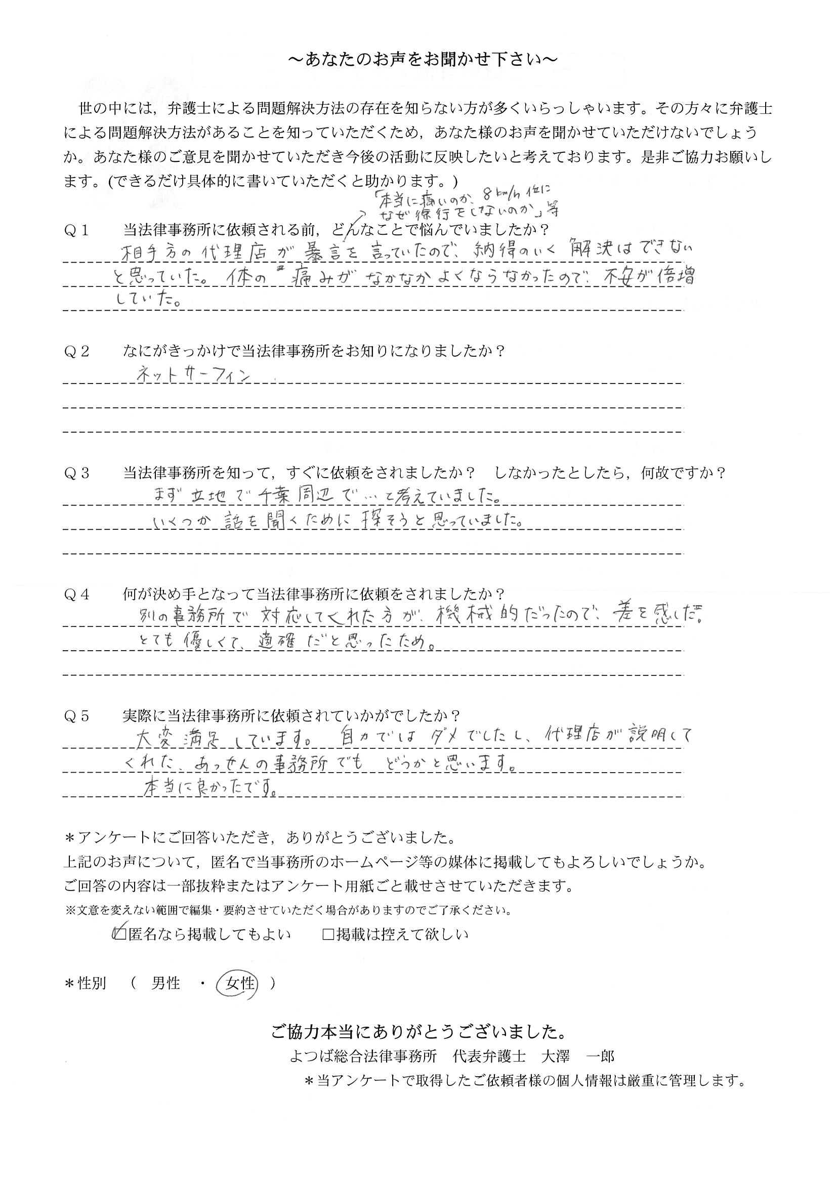 ご依頼した傷害保険会社との交渉以外にも、身近に起こった小さな相談事にも話を聞いていただき、相談に乗っていただき助かりました。また主たる依頼(保険会社との交渉)についても、当初、私が期待していた以上の成果をあげていただき、依頼して良かったと思っております。感謝です。ホームページで貴事務所の地図を分かり易くして欲しい。近隣の地図上の位置も載せてほしい。
