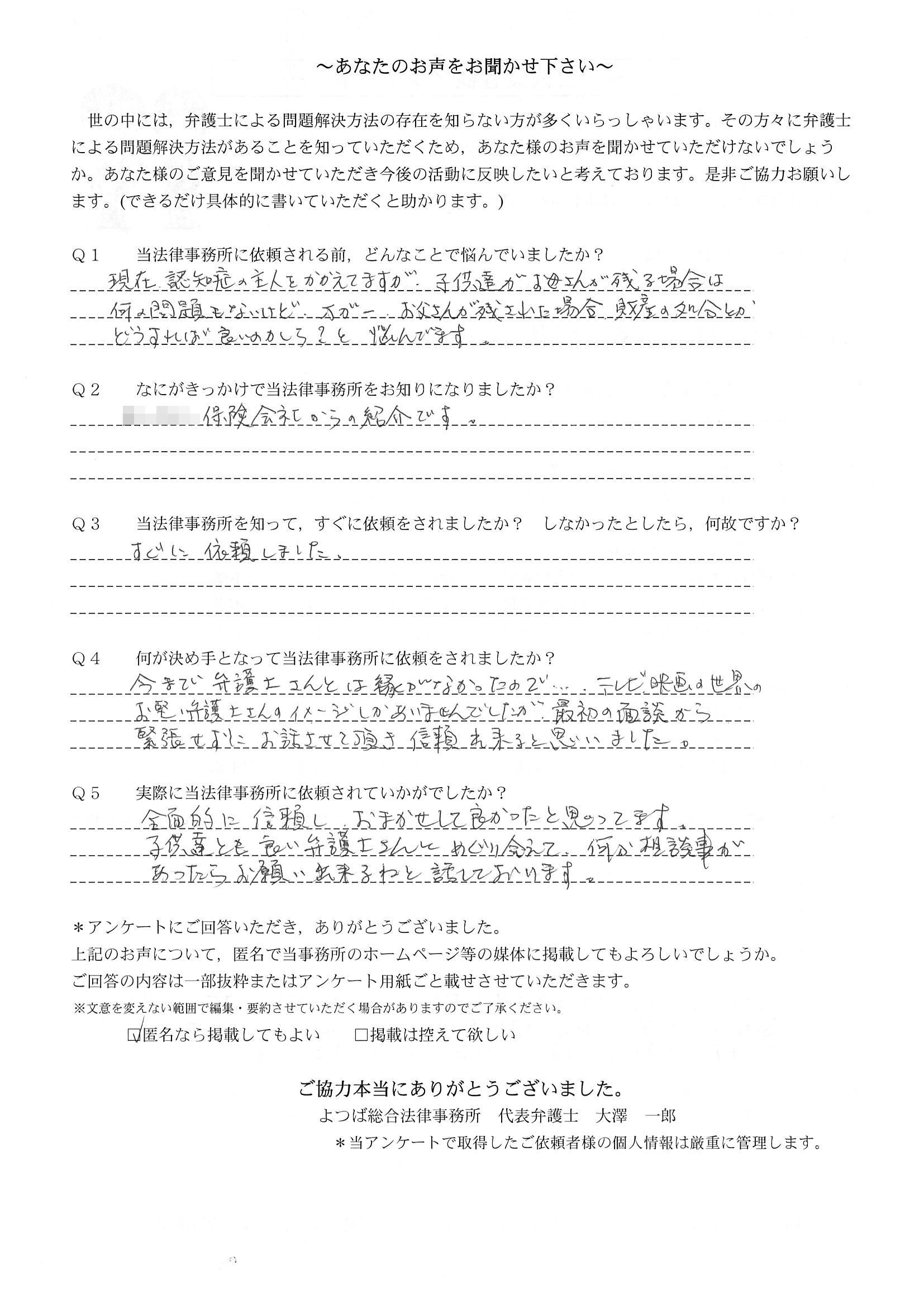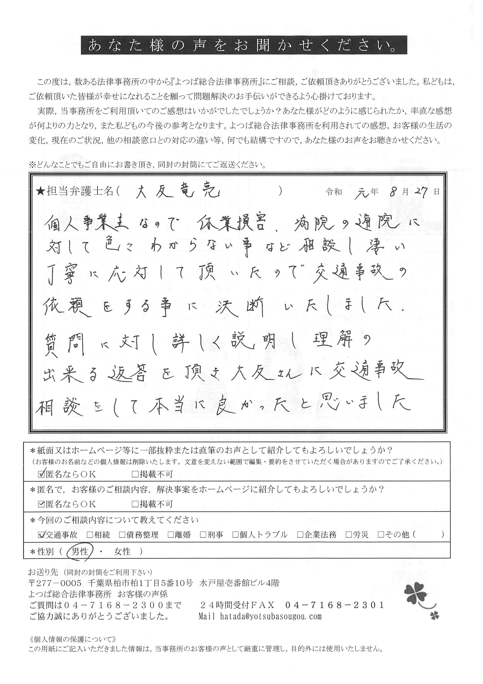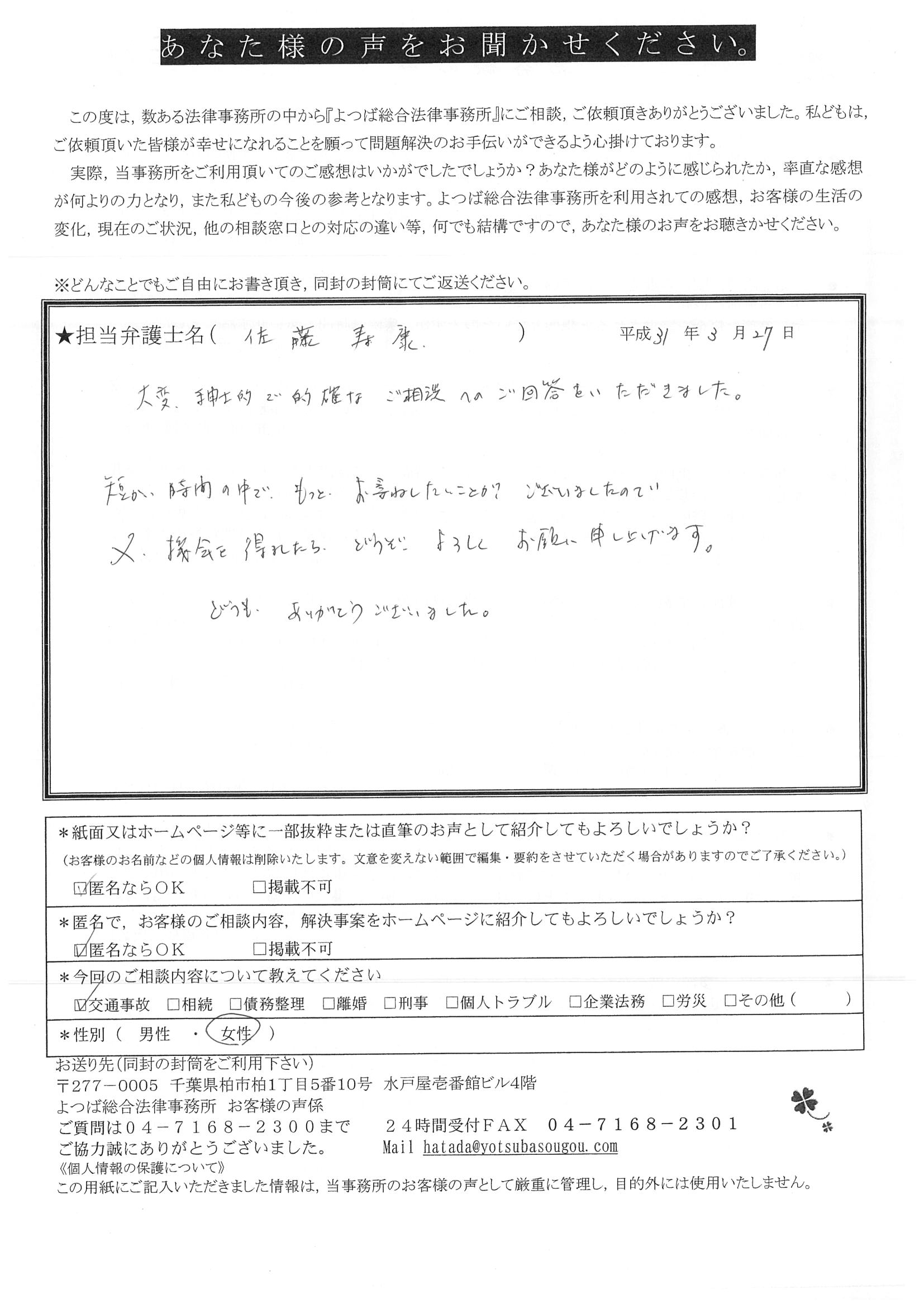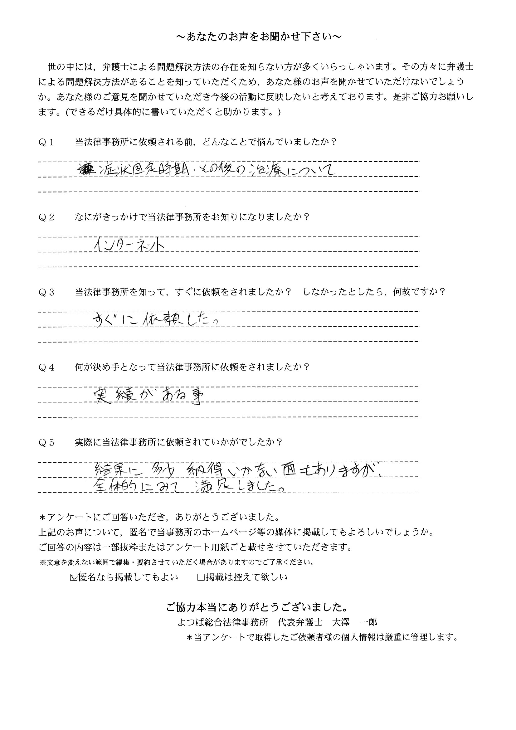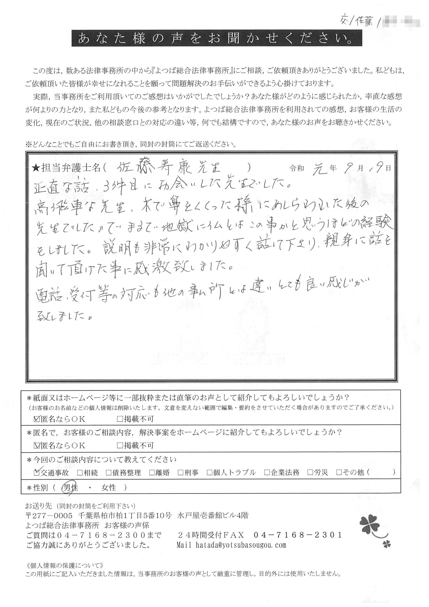 ご依頼した傷害保険会社との交渉以外にも、身近に起こった小さな相談事にも話を聞いていただき、相談に乗っていただき助かりました。また主たる依頼(保険会社との交渉)についても、当初、私が期待していた以上の成果をあげていただき、依頼して良かったと思っております。感謝です。ホームページで貴事務所の地図を分かり易くして欲しい。近隣の地図上の位置も載せてほしい。