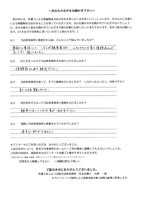 整骨院の紹介で貴事務所を知り、とても助かりました。