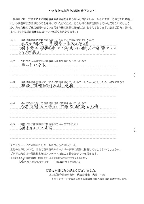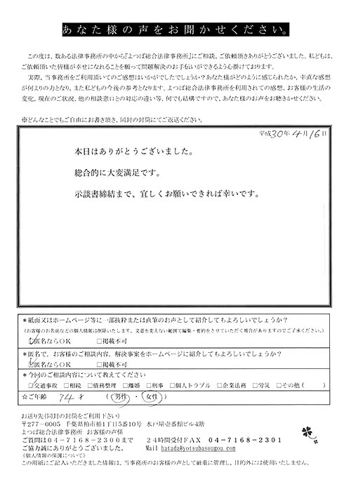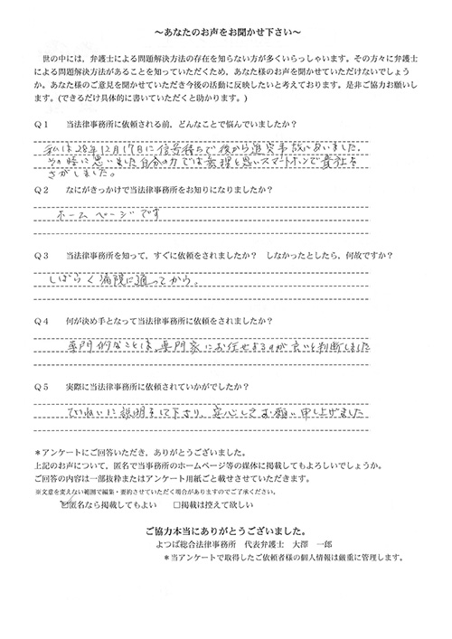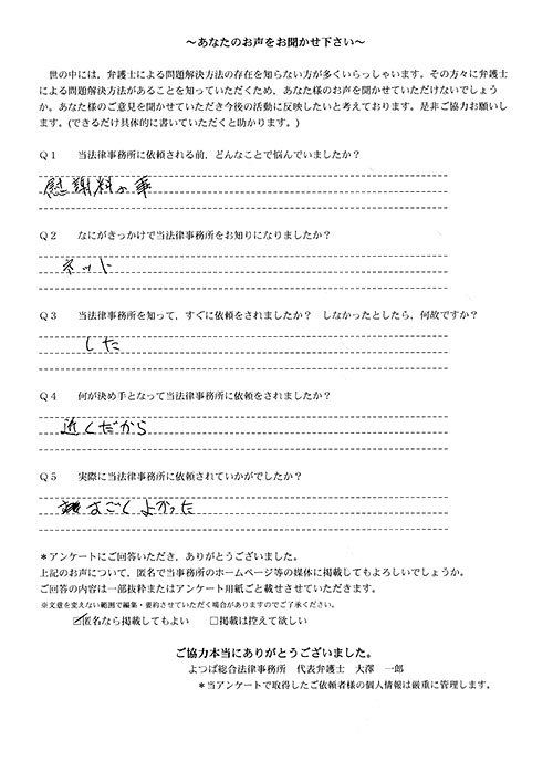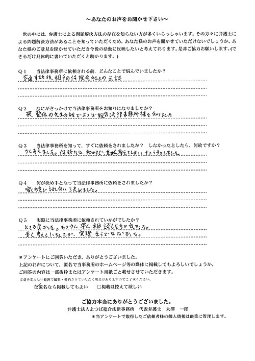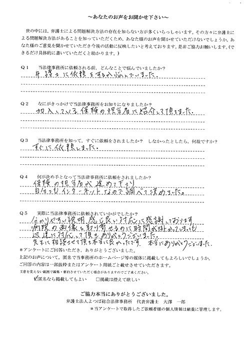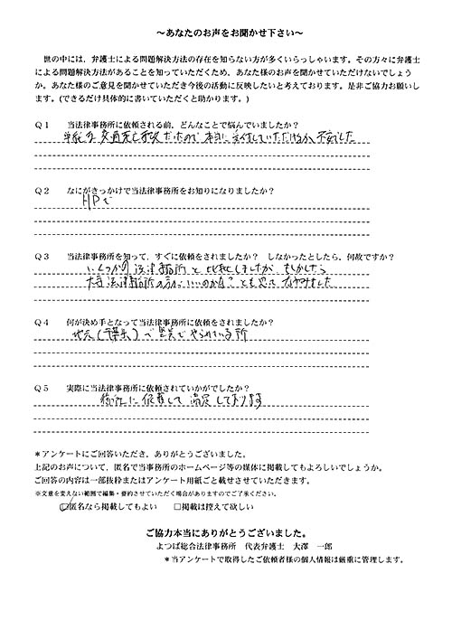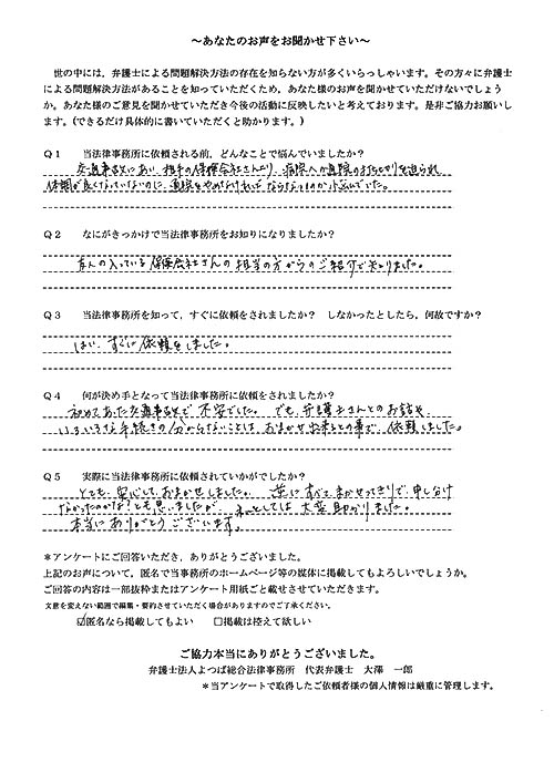 時間はかかりましたが、結果にも大変満足している。法律事務所にお世話になる日が来るとは思っていなかったので良い経験となりましたし、よつば総合さんに、本件を依頼して本当に良かった。