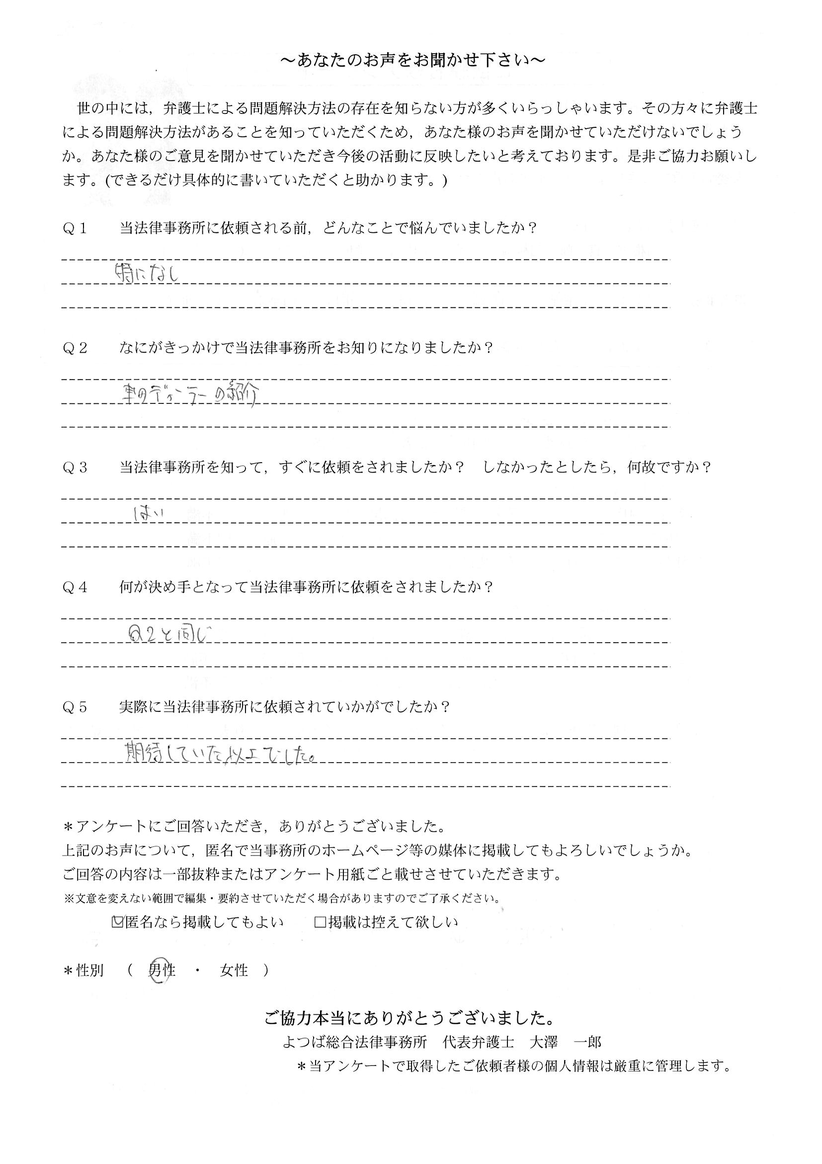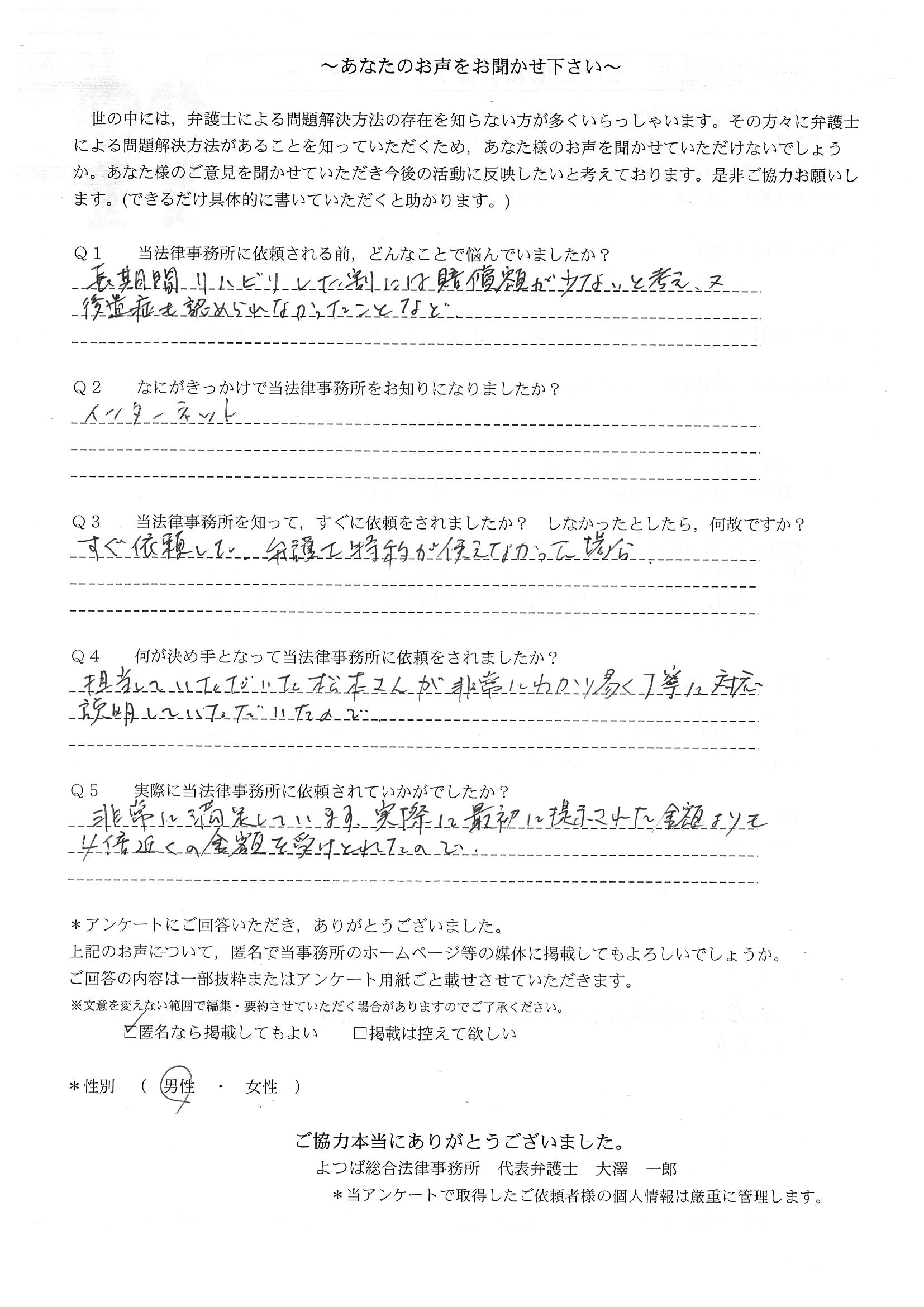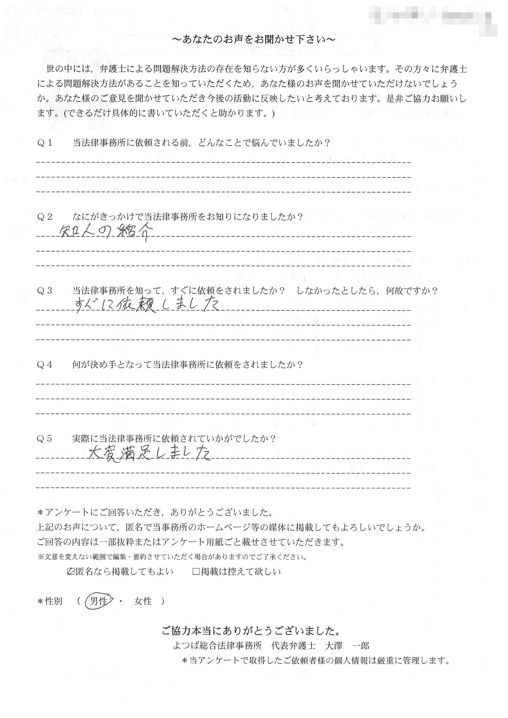 時間はかかりましたが、結果にも大変満足している。法律事務所にお世話になる日が来るとは思っていなかったので良い経験となりましたし、よつば総合さんに、本件を依頼して本当に良かった。