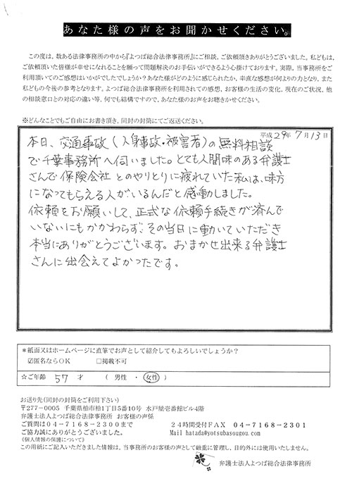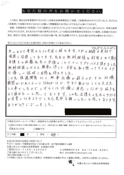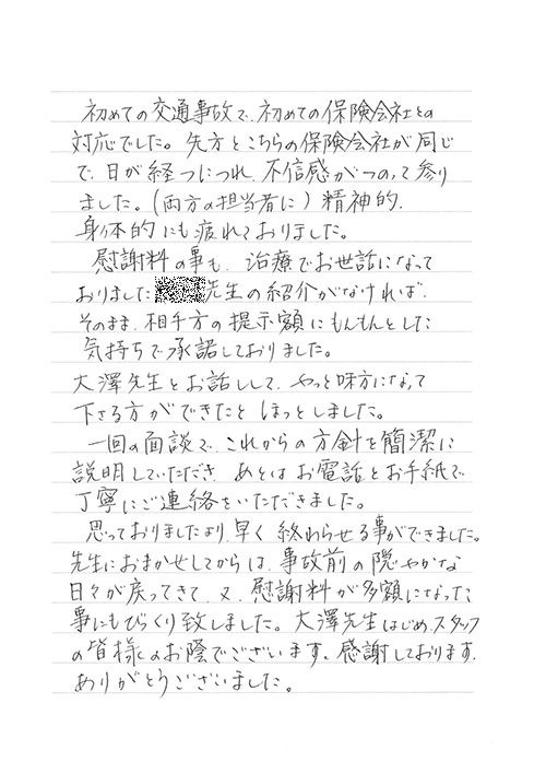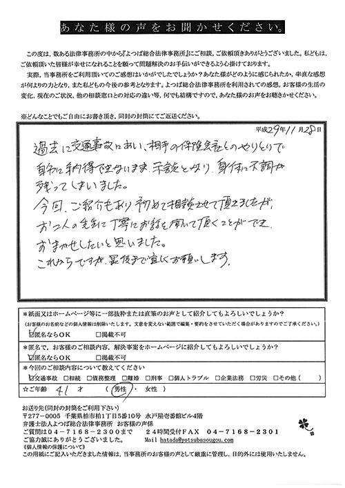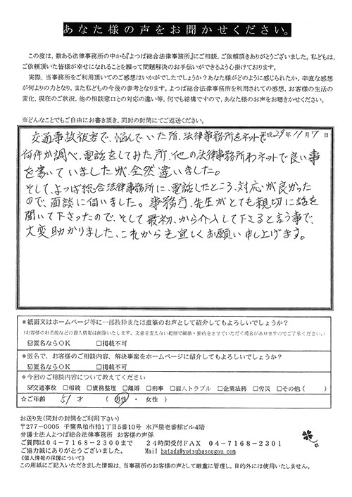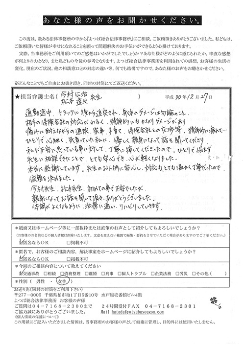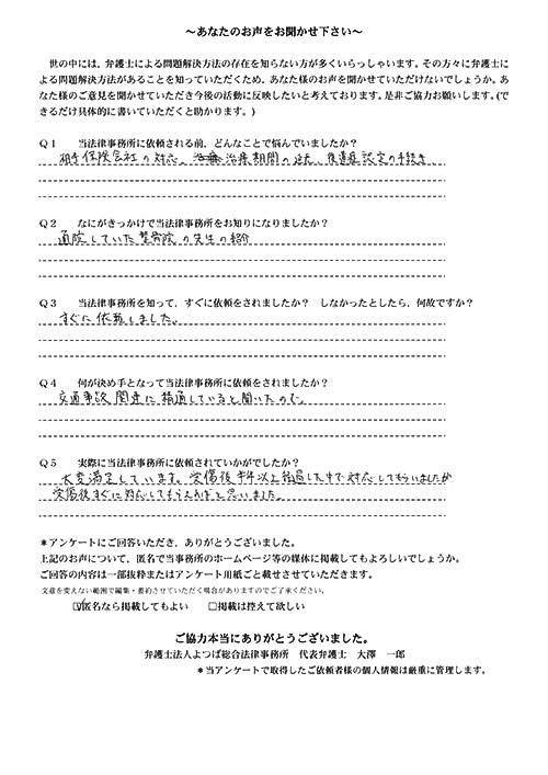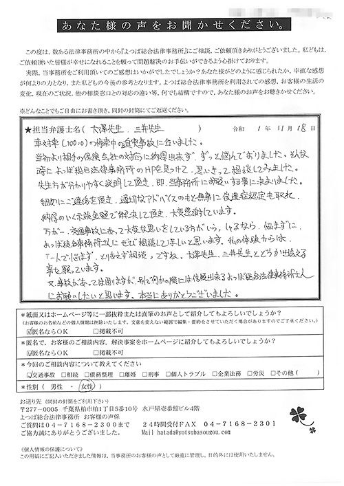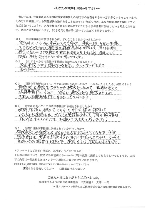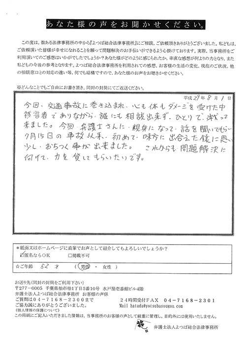 自分がまさか交通事故にあうとは思ってもみませんでした。100パーセント先方のミスだと思っていたので、なぜ加害者の方がそれきりになって、保険会社と自分のやり取りになってしまうのだろうと少しやり切れなかったとき、貴事務所を訪れて色々お話させていただき依頼となりました。当初長くかかりますと言われましたが、先方の保険会社との連絡をしなくて良くなり、気持ち的に楽になりました。その後、ストレスも感じない生活が送れたと思います。本当に有り難うございました。