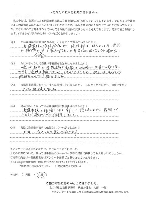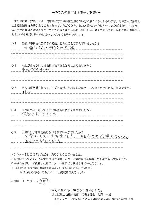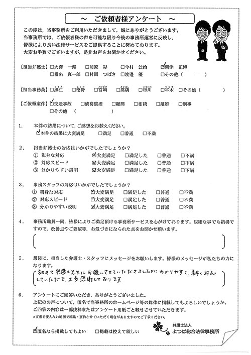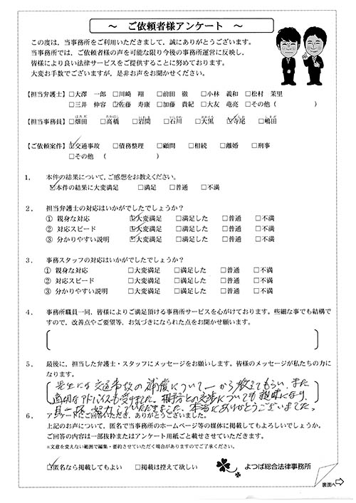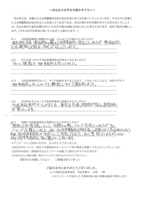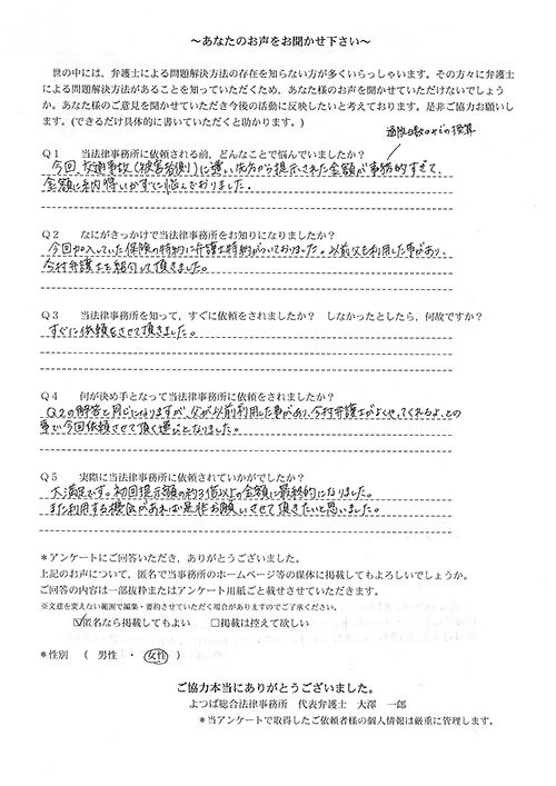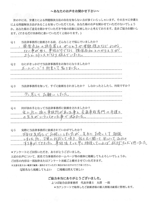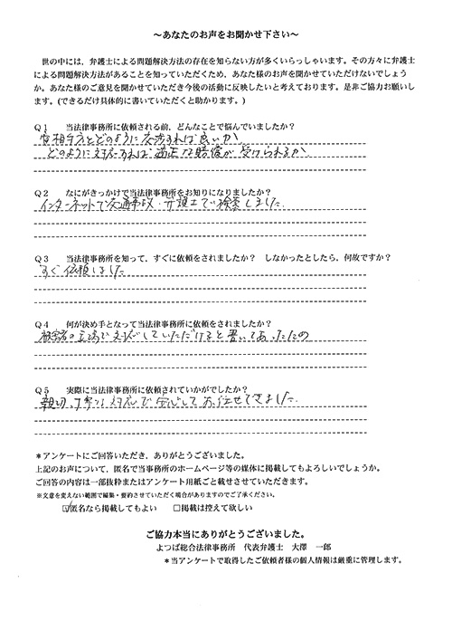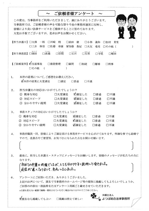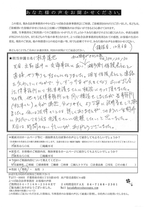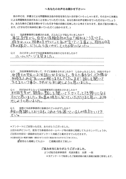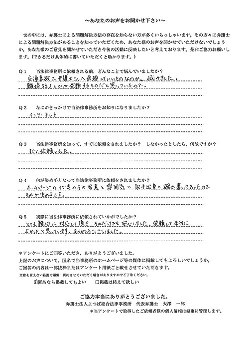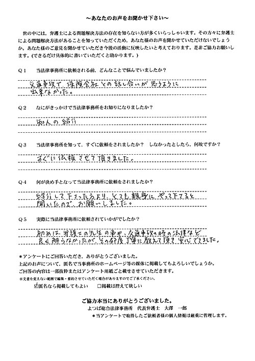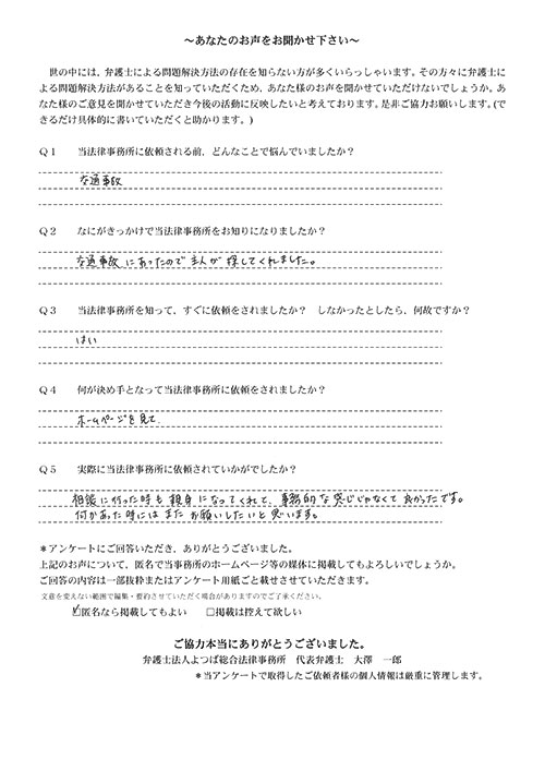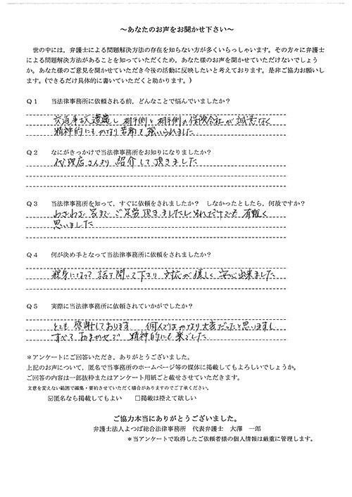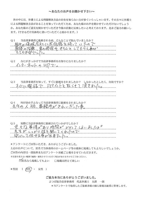 相手保険会社からのしつこい電話に悩まされていました。インターネットで事務所を知り、弁護士との面談時の対応が決め手となって依頼しました。親身な対応やわかりやすい説明、先生の迅速な対応力がよかったです。折り返しの電話や急ぎの時の電話の取り次ぎをスムーズにしていただけたら良かったと思います。この度は事件解決にご尽力いただきまことにありがとうございました。