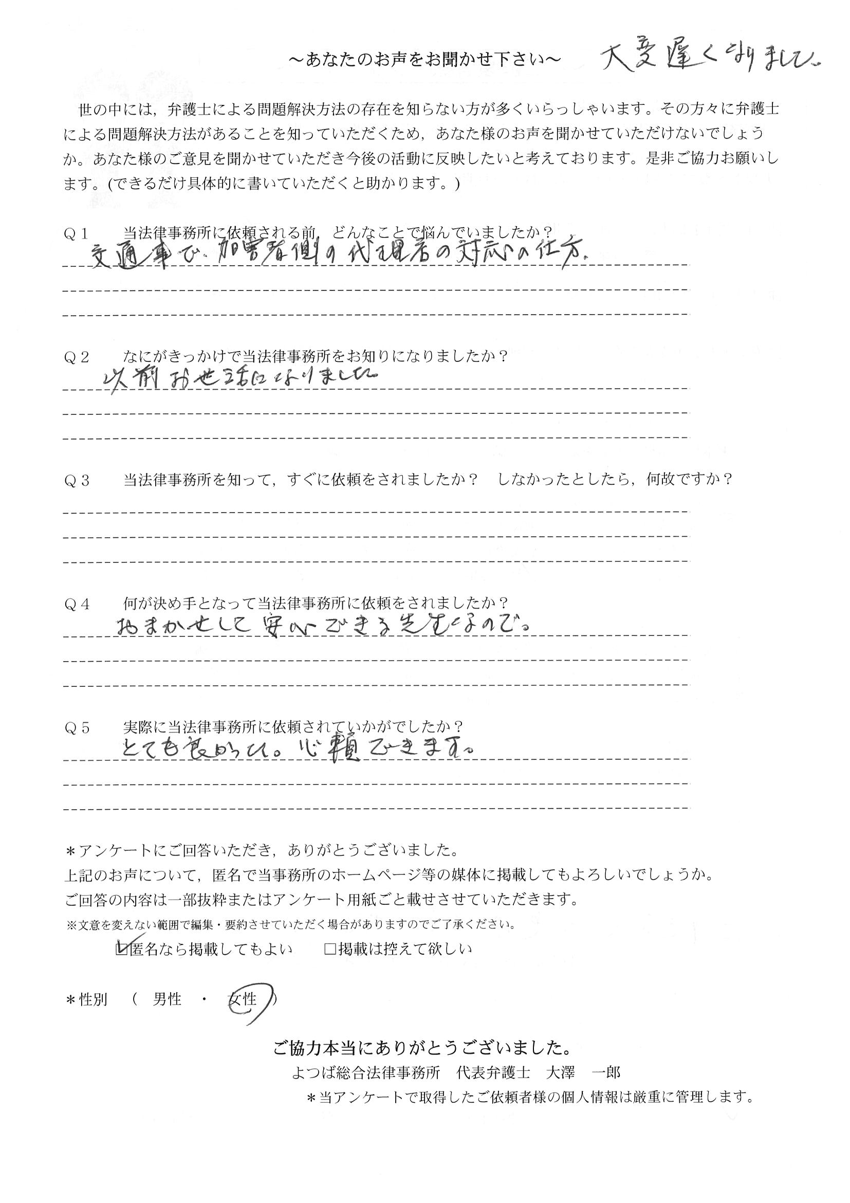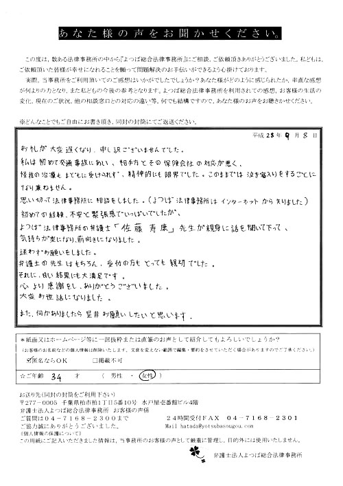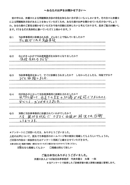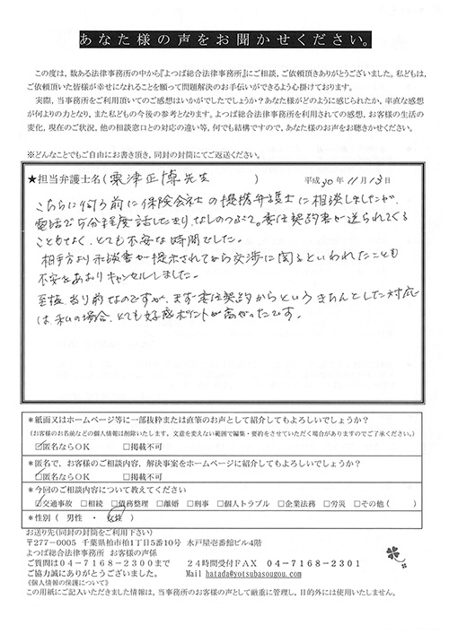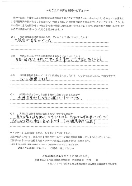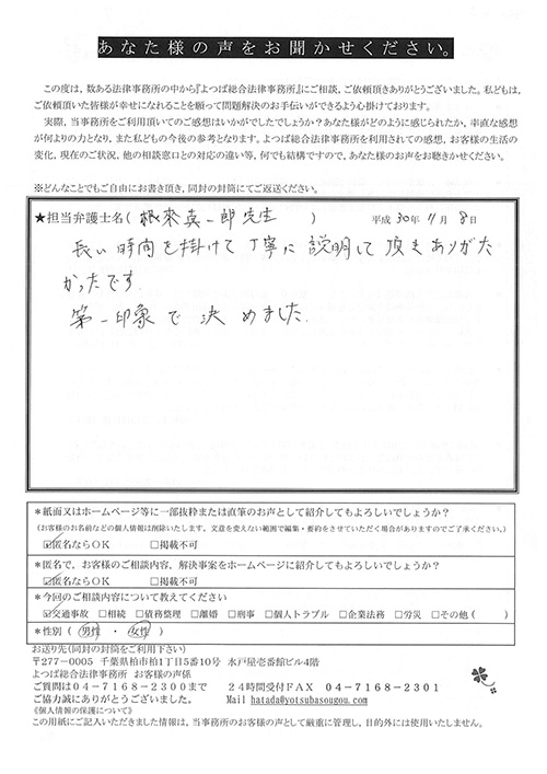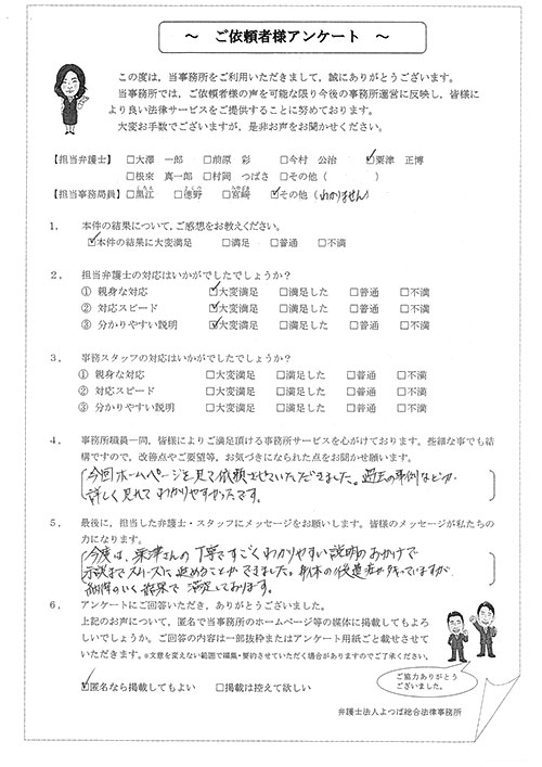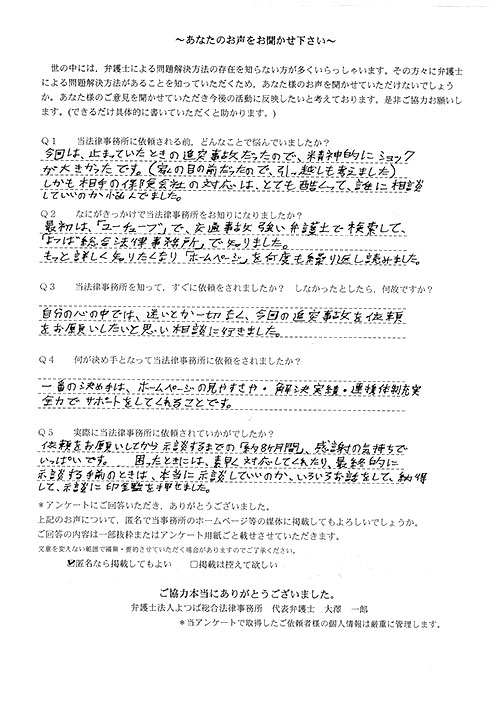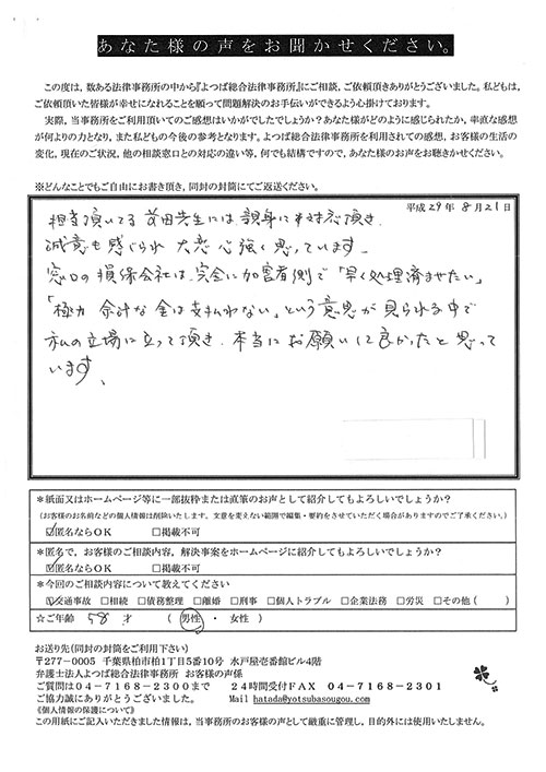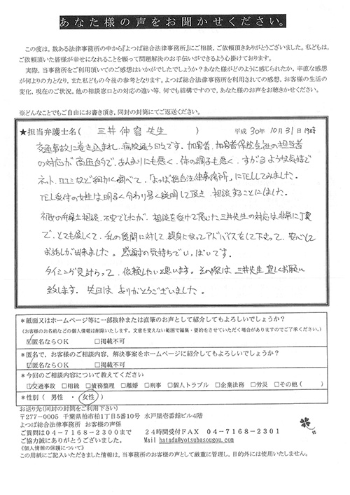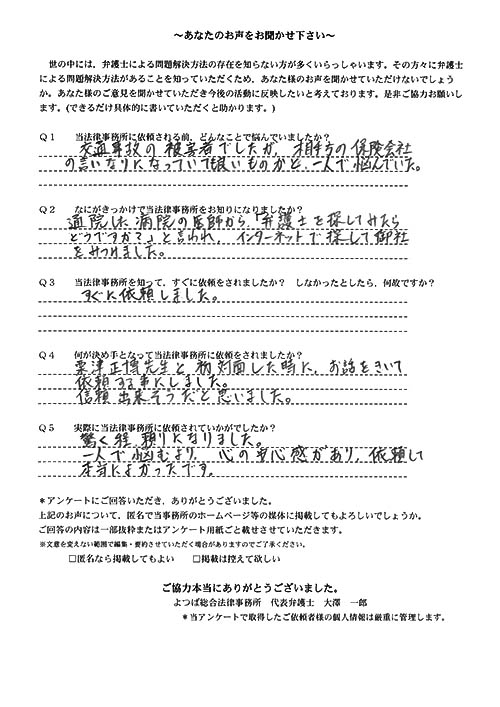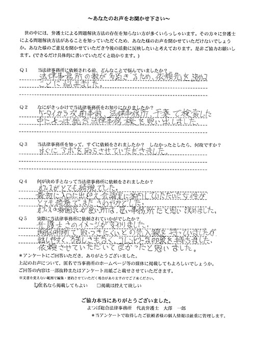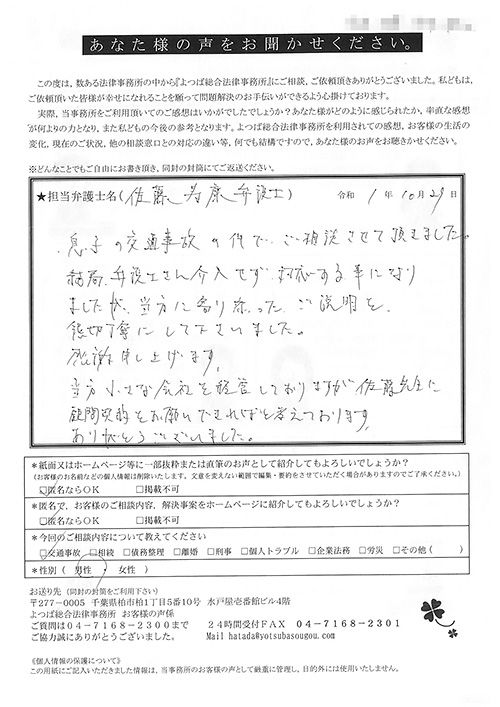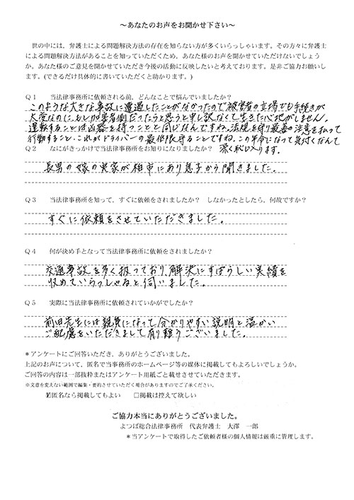 相手保険会社からのしつこい電話に悩まされていました。インターネットで事務所を知り、弁護士との面談時の対応が決め手となって依頼しました。親身な対応やわかりやすい説明、先生の迅速な対応力がよかったです。折り返しの電話や急ぎの時の電話の取り次ぎをスムーズにしていただけたら良かったと思います。この度は事件解決にご尽力いただきまことにありがとうございました。