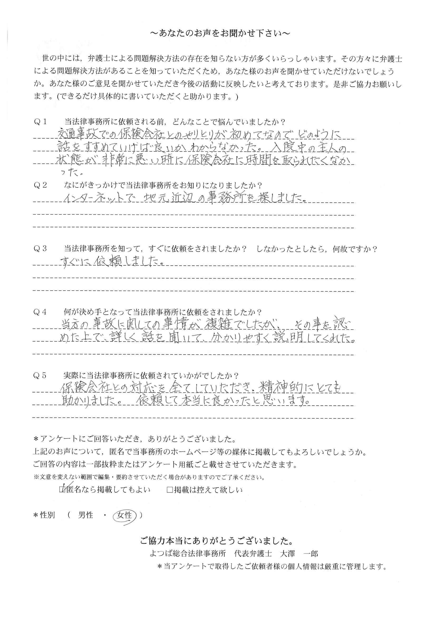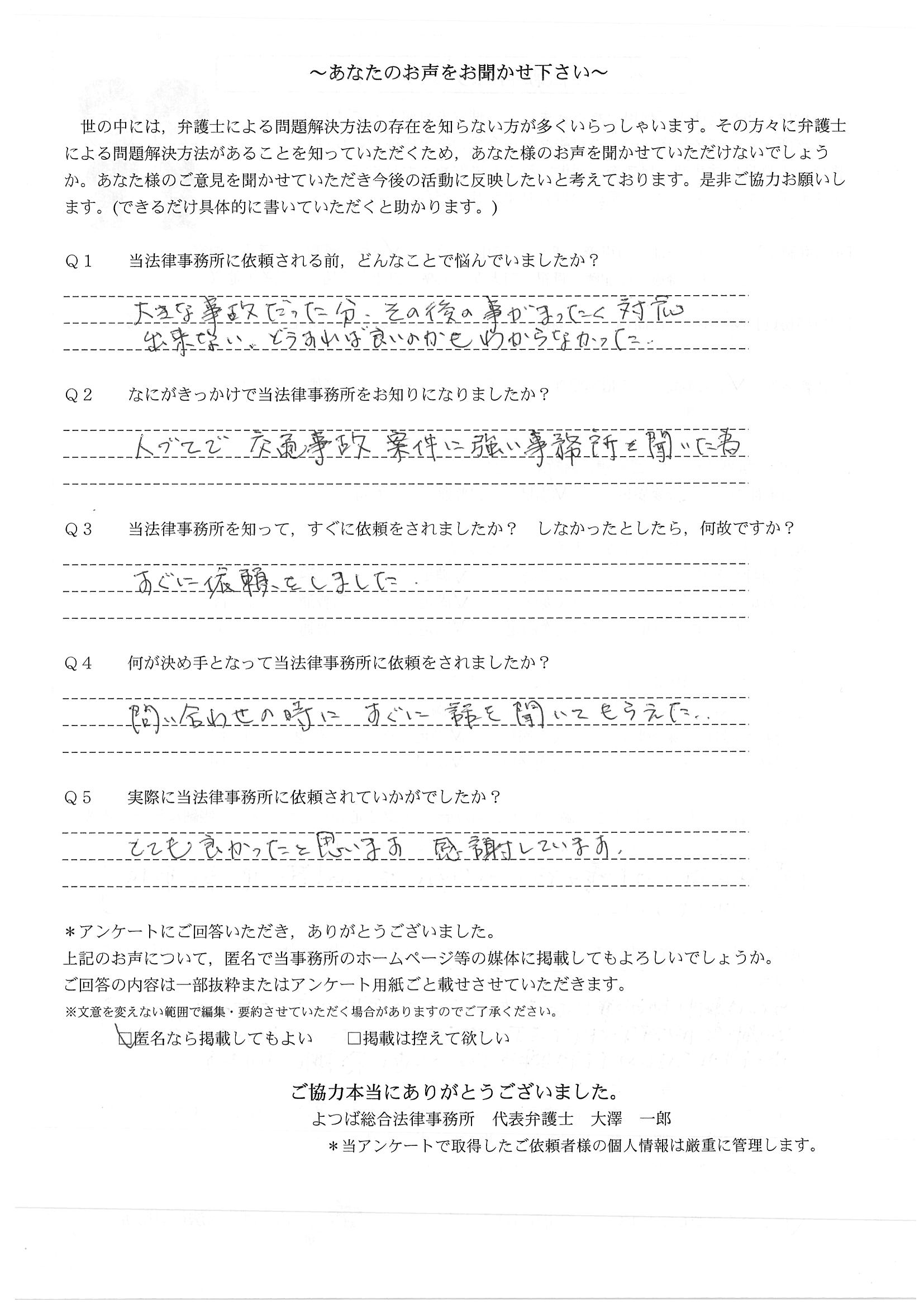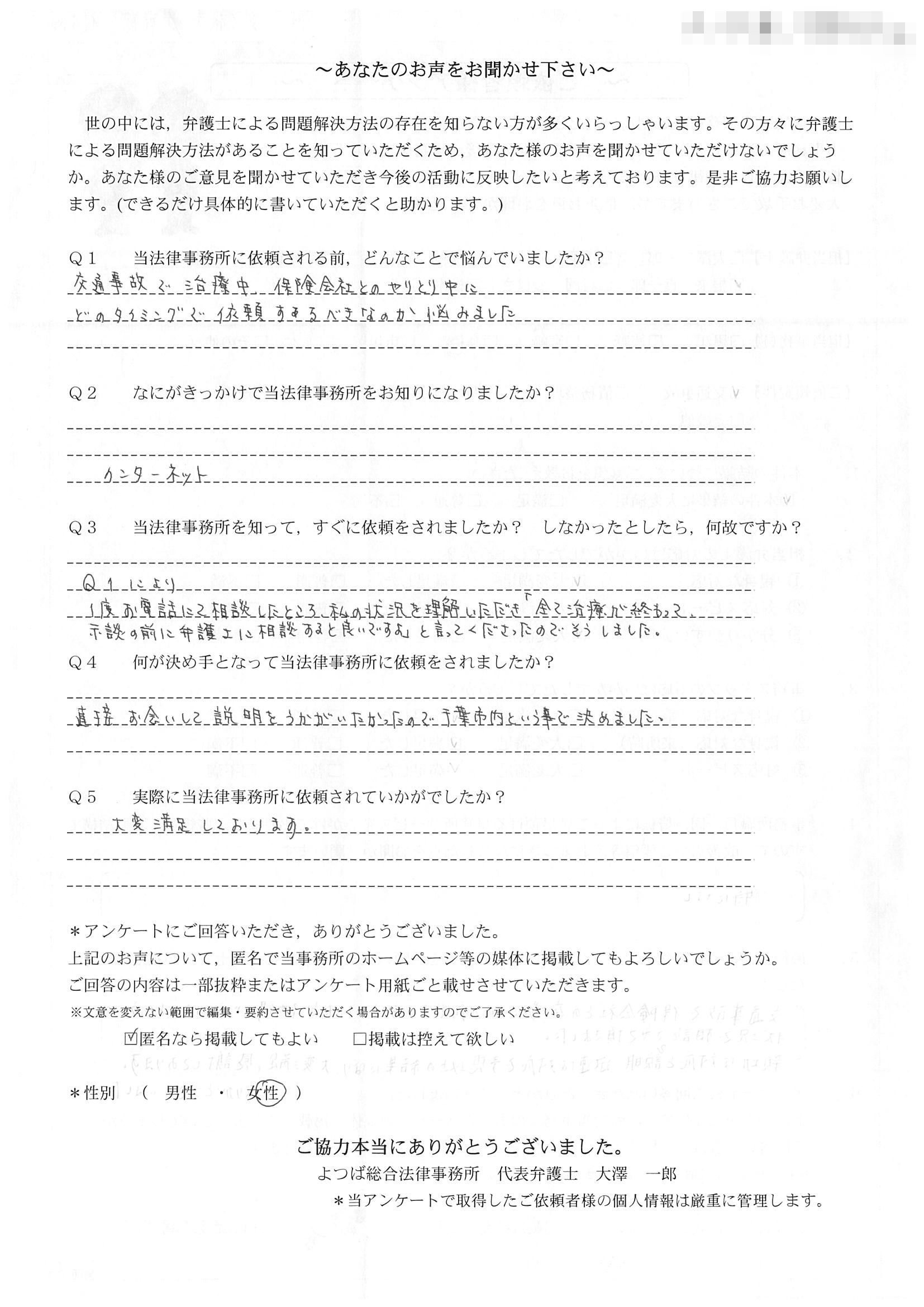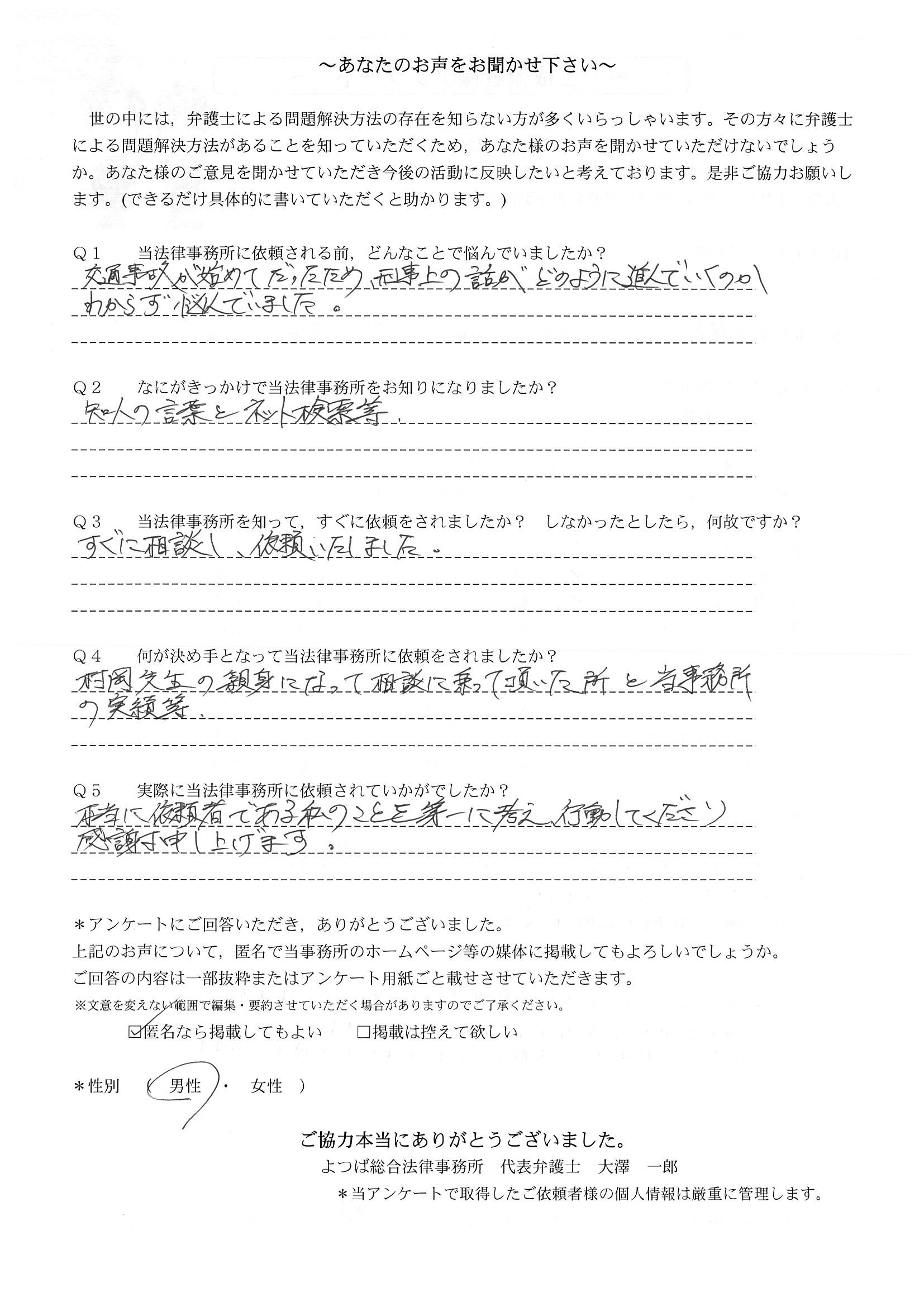 相手保険会社からのしつこい電話に悩まされていました。インターネットで事務所を知り、弁護士との面談時の対応が決め手となって依頼しました。親身な対応やわかりやすい説明、先生の迅速な対応力がよかったです。折り返しの電話や急ぎの時の電話の取り次ぎをスムーズにしていただけたら良かったと思います。この度は事件解決にご尽力いただきまことにありがとうございました。