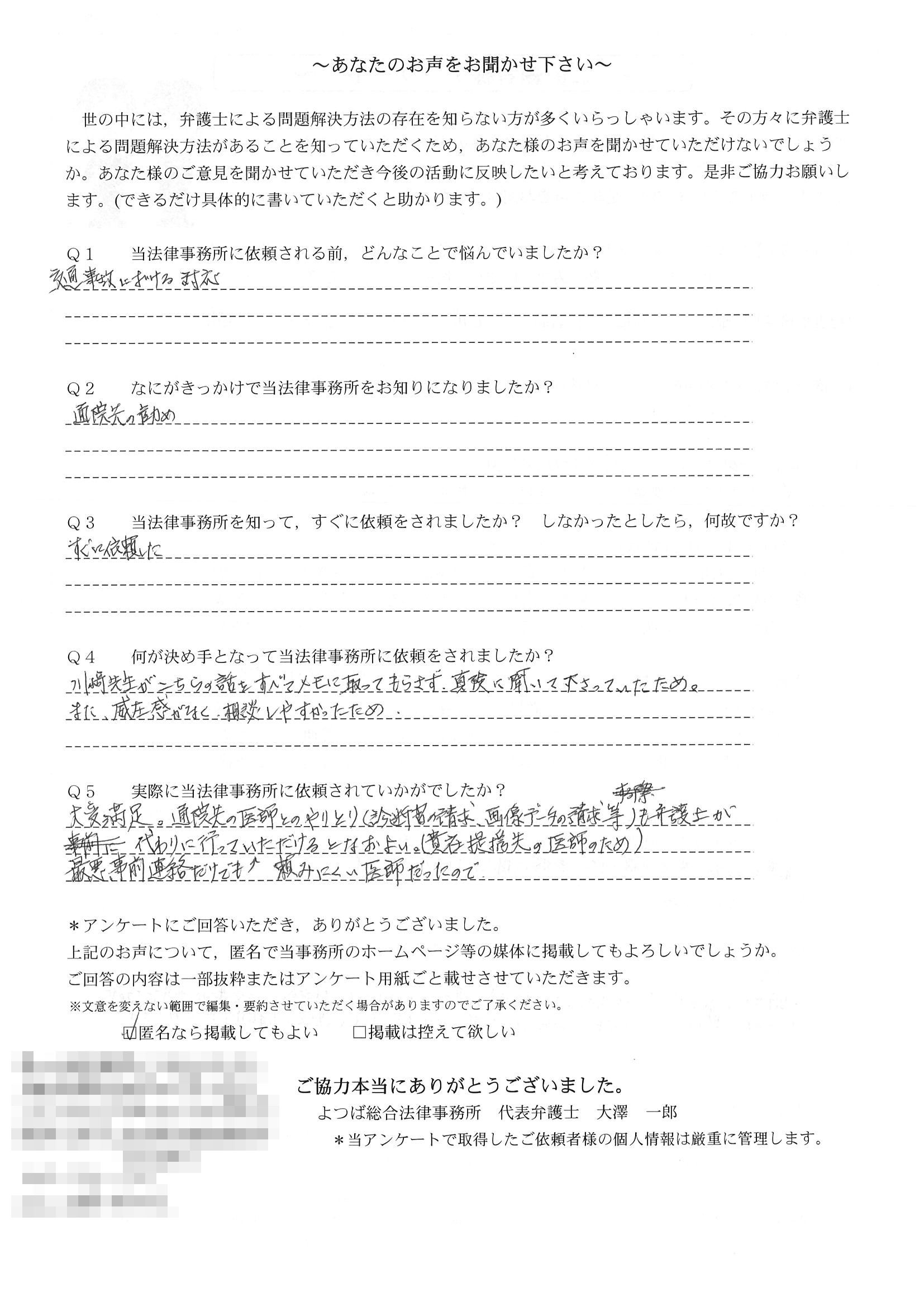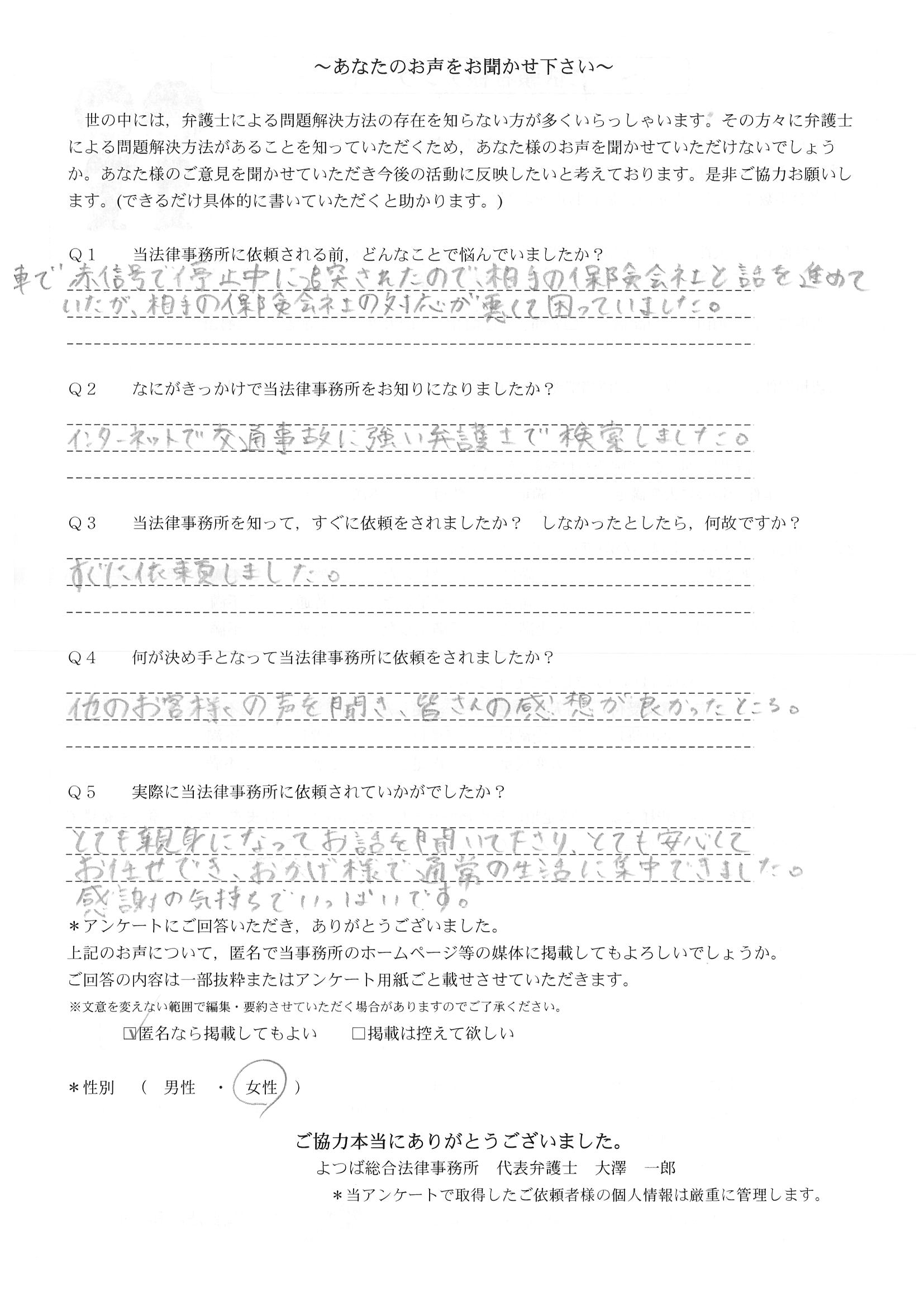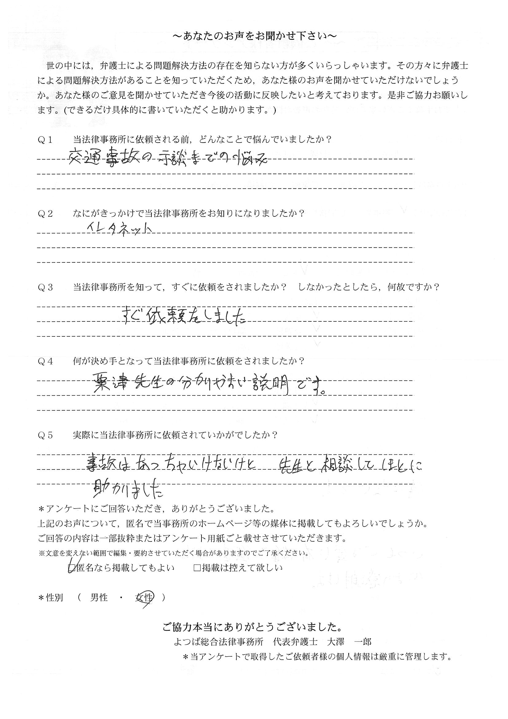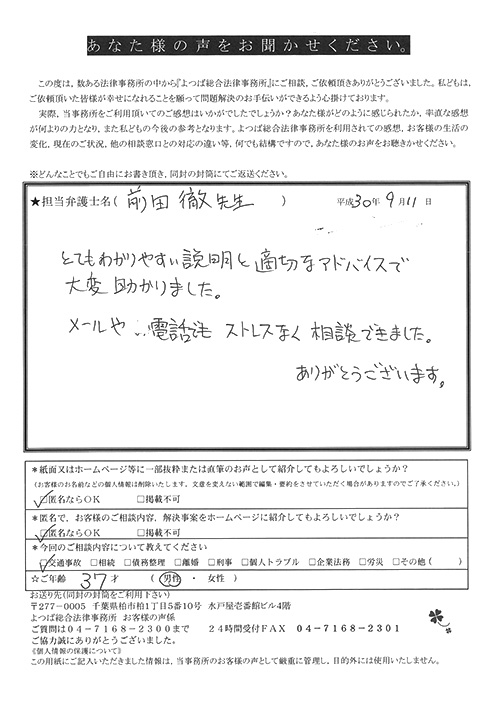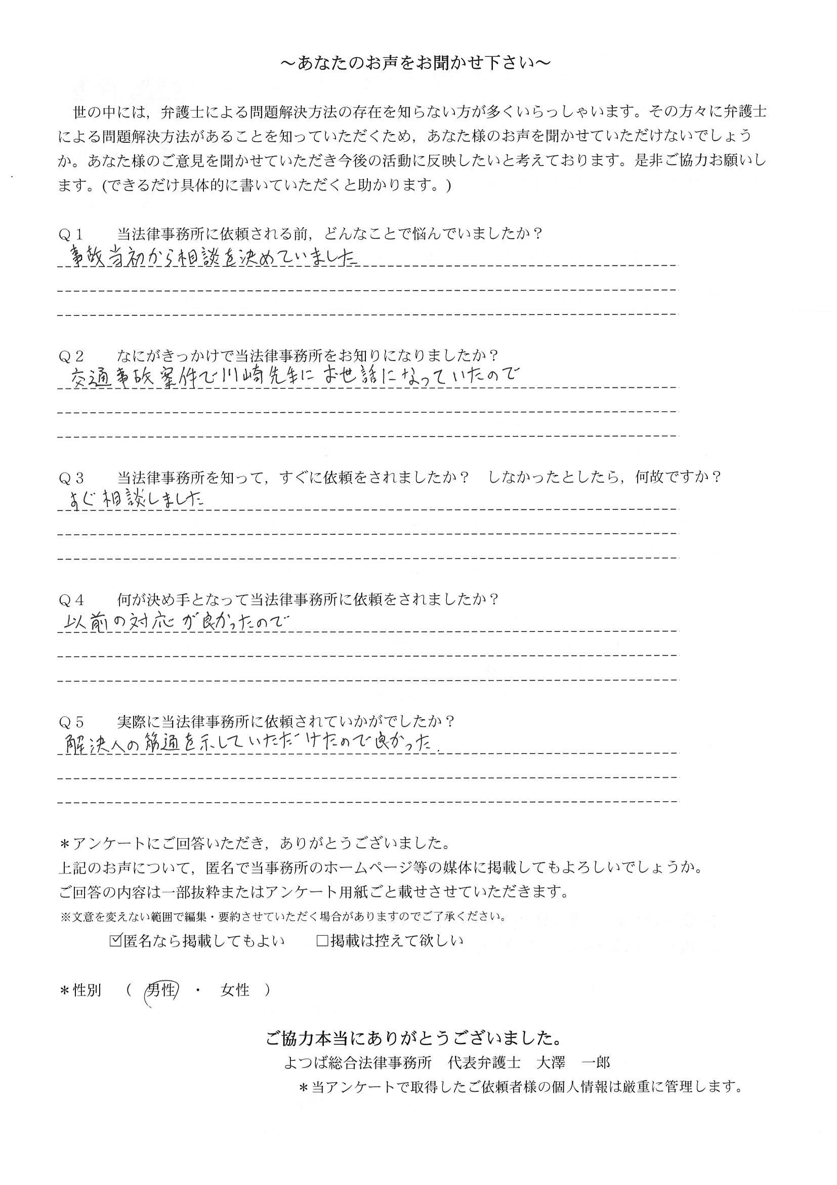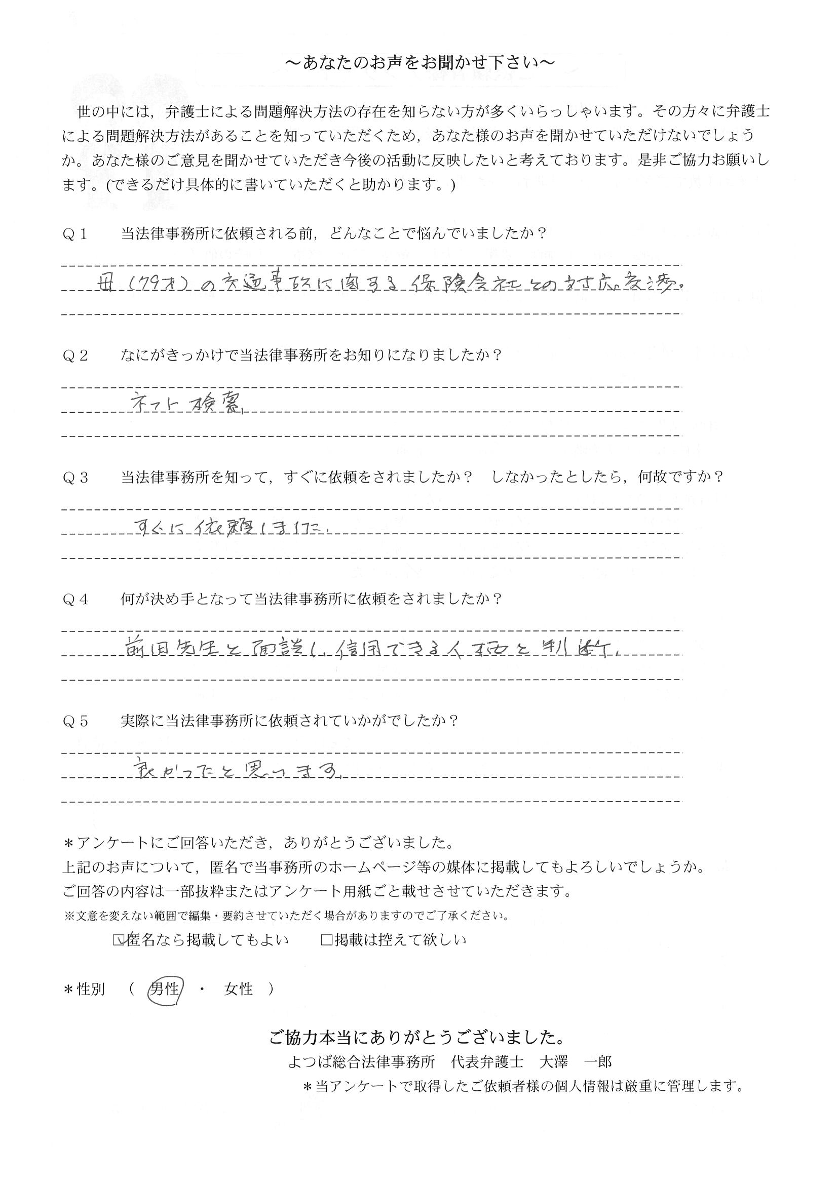 相手保険会社からのしつこい電話に悩まされていました。インターネットで事務所を知り、弁護士との面談時の対応が決め手となって依頼しました。親身な対応やわかりやすい説明、先生の迅速な対応力がよかったです。折り返しの電話や急ぎの時の電話の取り次ぎをスムーズにしていただけたら良かったと思います。この度は事件解決にご尽力いただきまことにありがとうございました。
