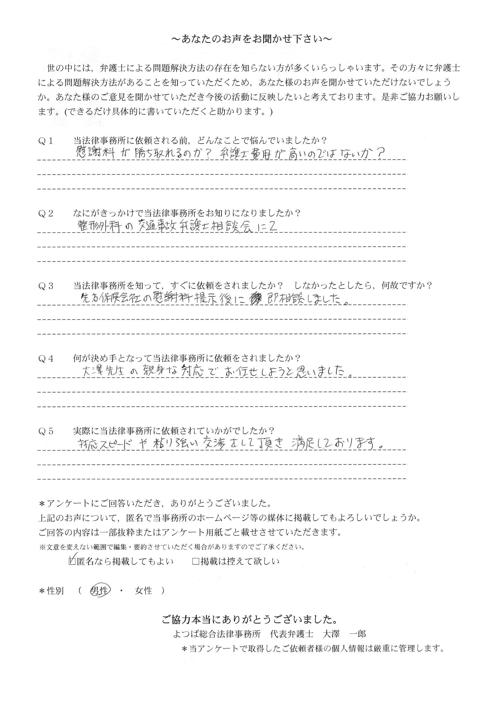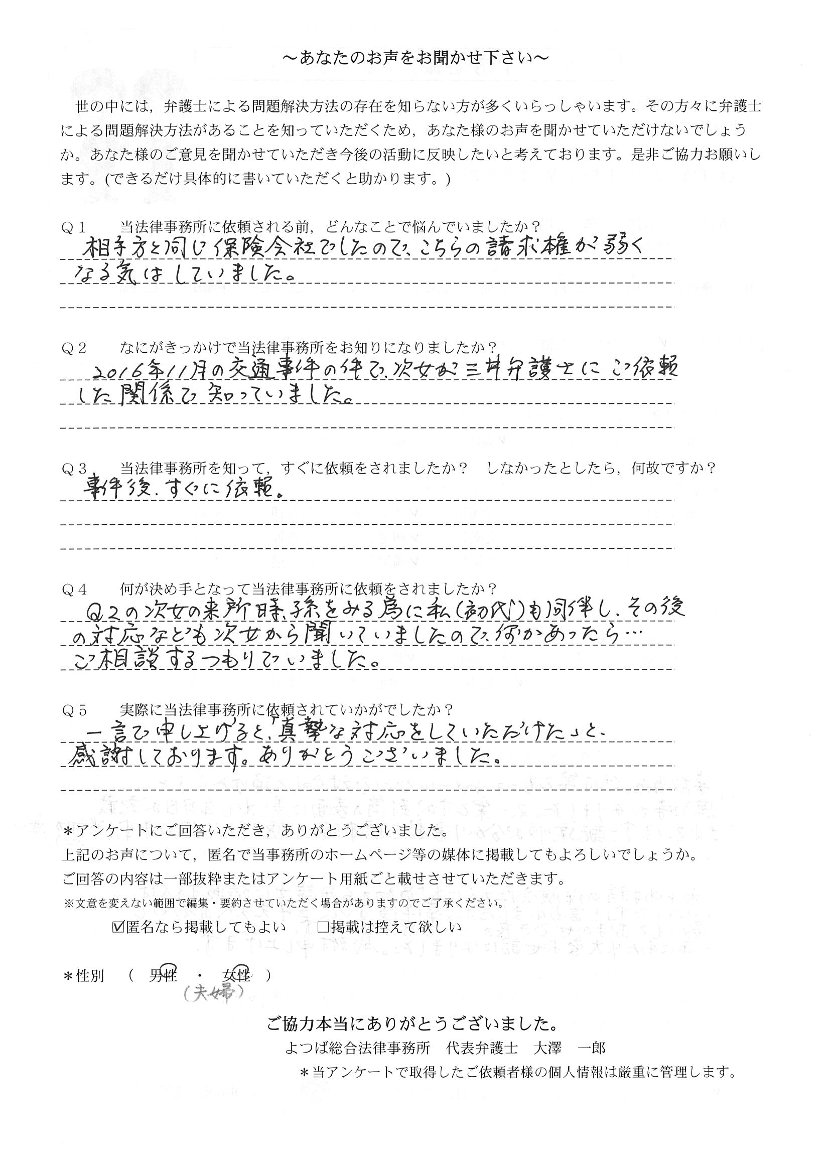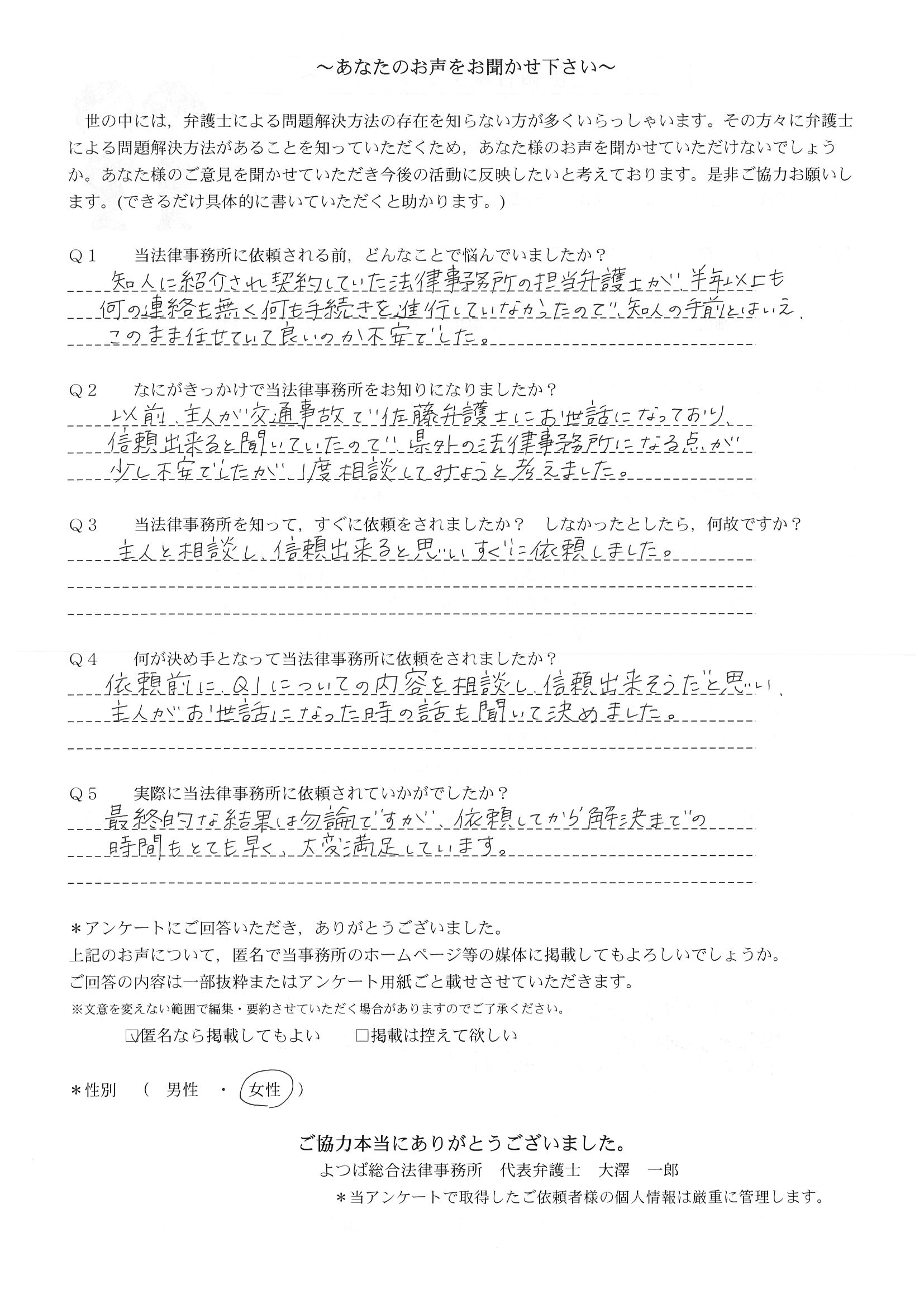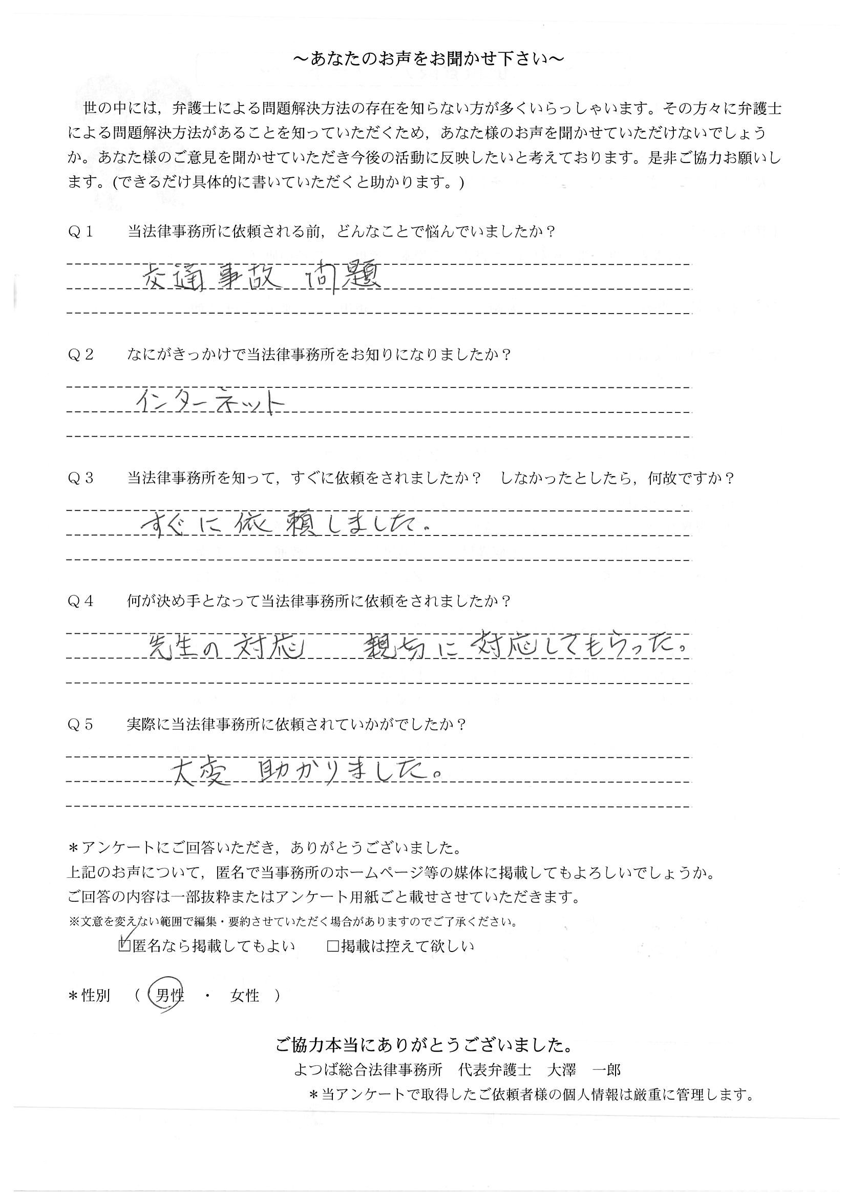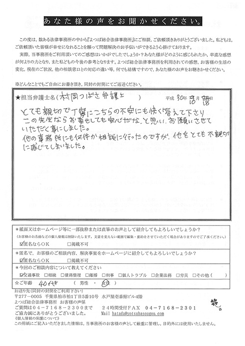 相手保険会社からのしつこい電話に悩まされていました。インターネットで事務所を知り、弁護士との面談時の対応が決め手となって依頼しました。親身な対応やわかりやすい説明、先生の迅速な対応力がよかったです。折り返しの電話や急ぎの時の電話の取り次ぎをスムーズにしていただけたら良かったと思います。この度は事件解決にご尽力いただきまことにありがとうございました。