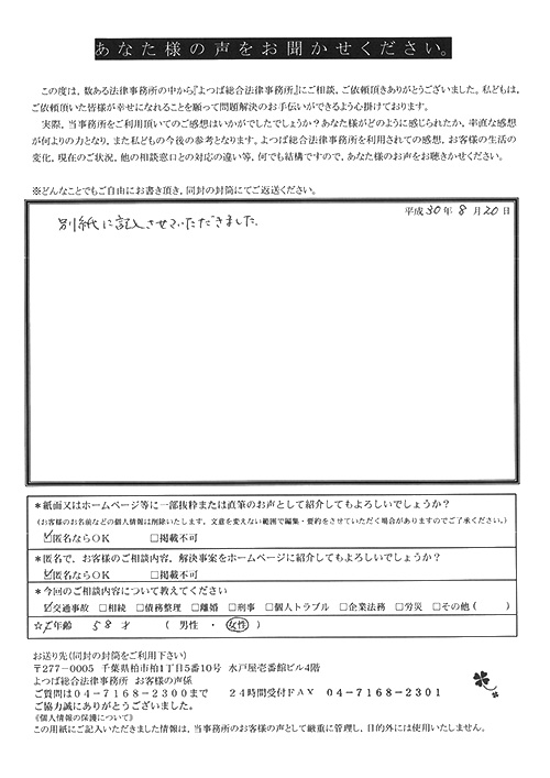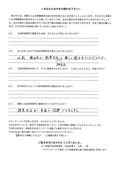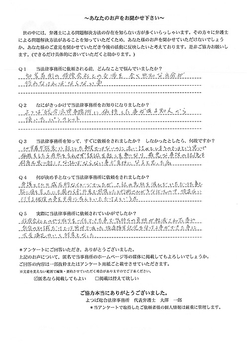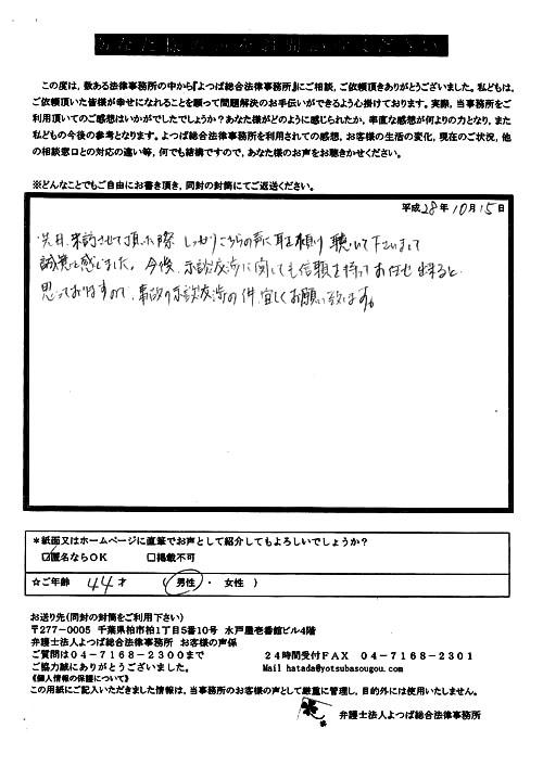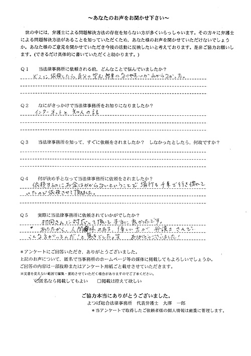 今では自分の気持ちも落ち着いて依頼して本当に良かったです。昨年、貴事務所へお伺いし、何もわからない状態の自分にいろいろと教えていただき、また親身になってお気遣いいただき、ありがとうございました。これからも三井弁護士さんのご活躍をお祈りいたします。