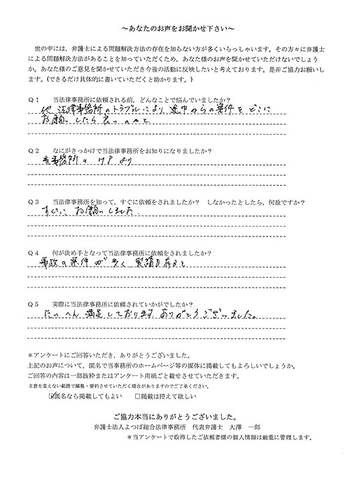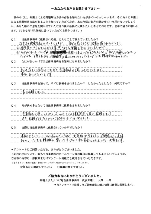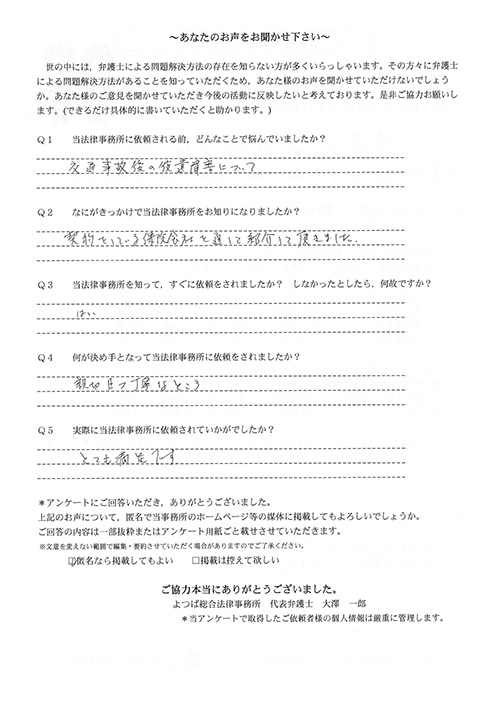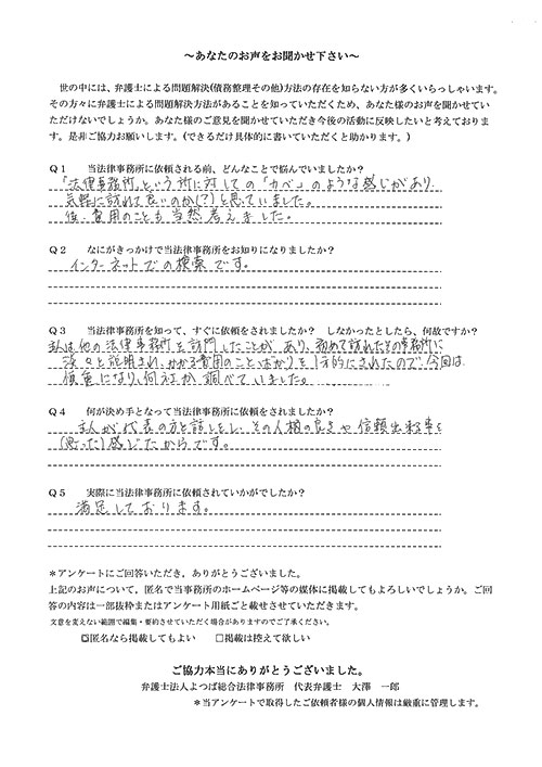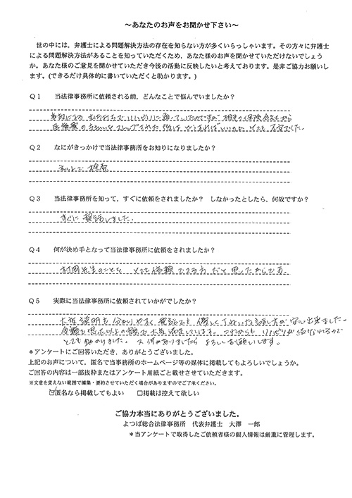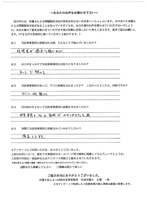 大友先生はとても親身になって相談に乗ってくださり、ぜひこちらの事務所にお願いしたいと思い、弁護士さんを変更しました。