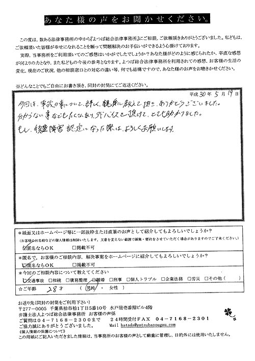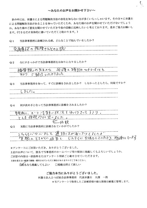 細かにご連絡を頂き、適切なアドバイスのもと無事に後遺症認定も取れ、納得のいく示談金額で解決して頂き、大変感謝しています。