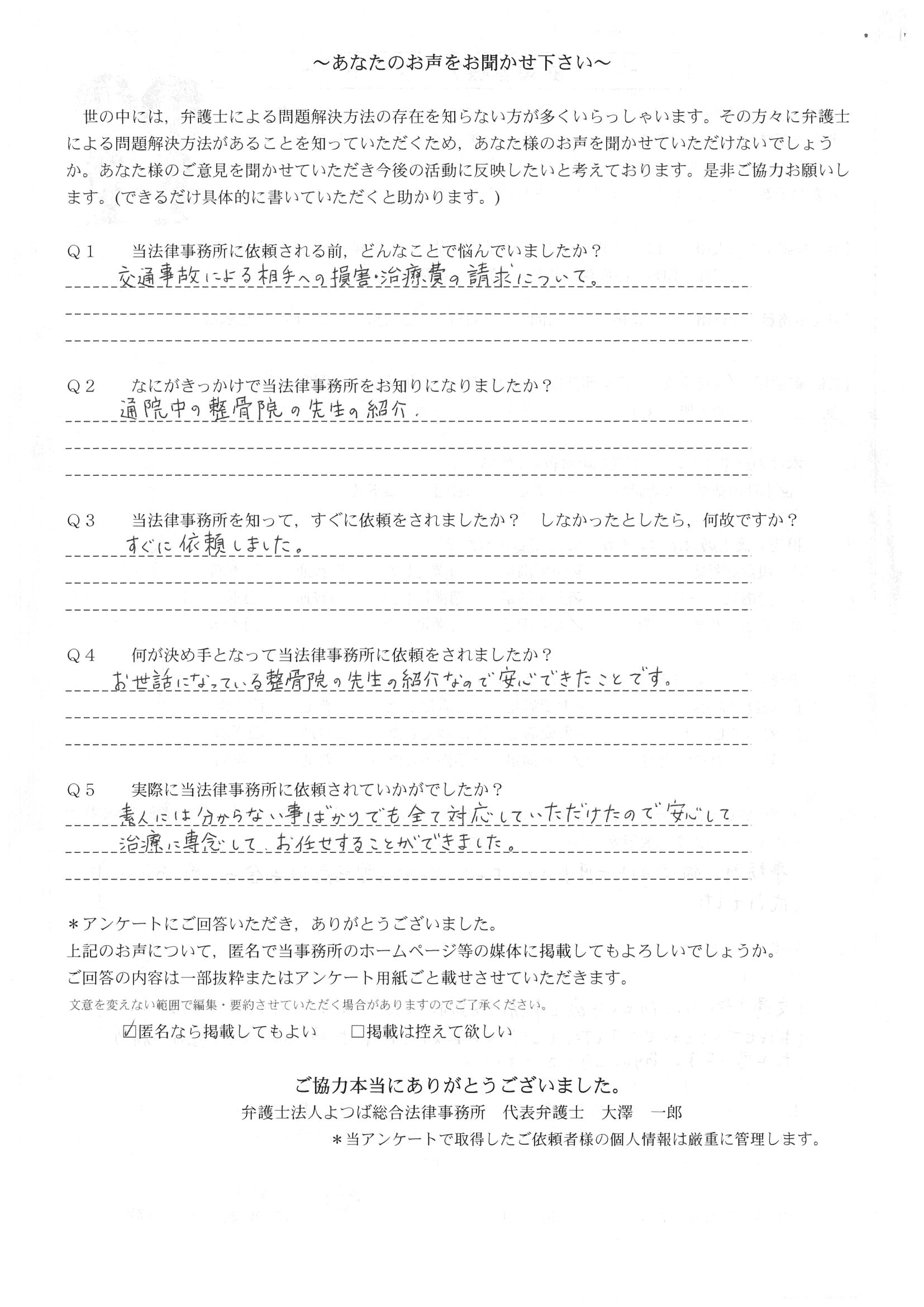 事故についての知識がないため悩んでいました。整骨院の紹介で貴事務所を知り、とても助かりました。
