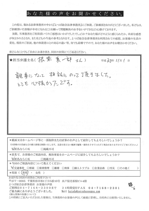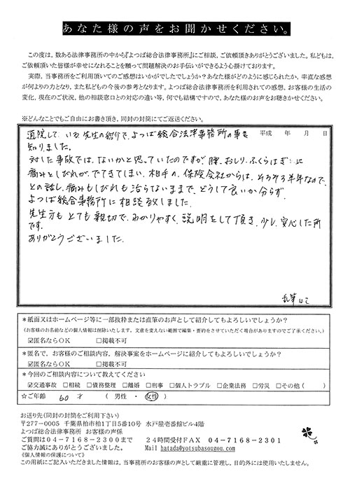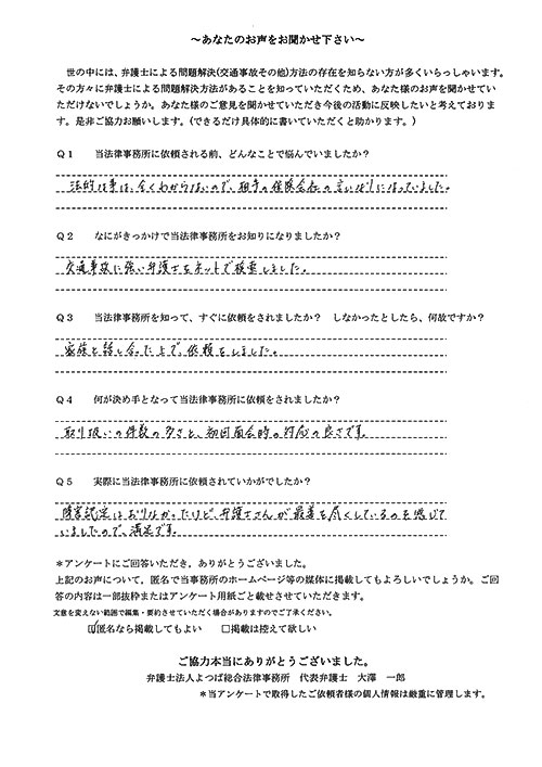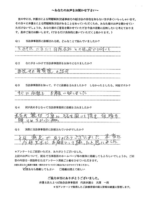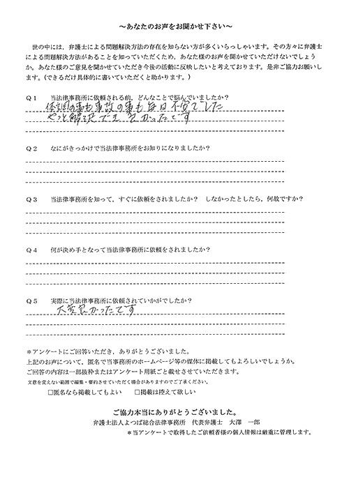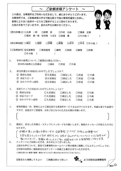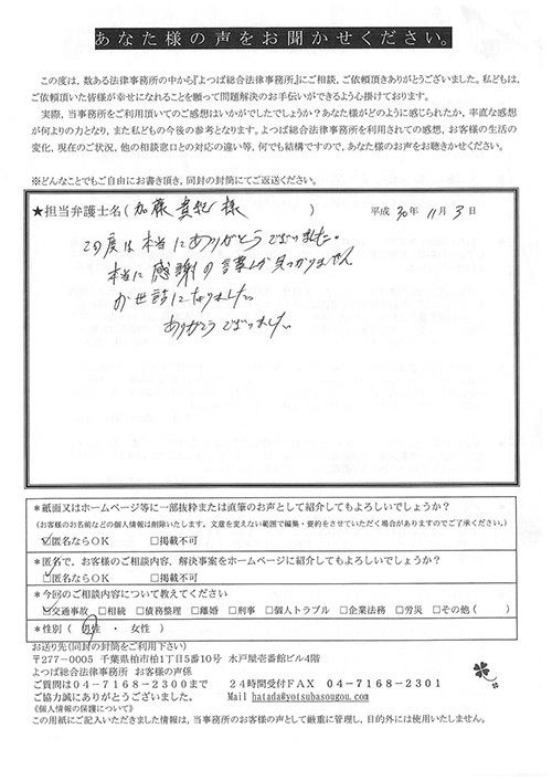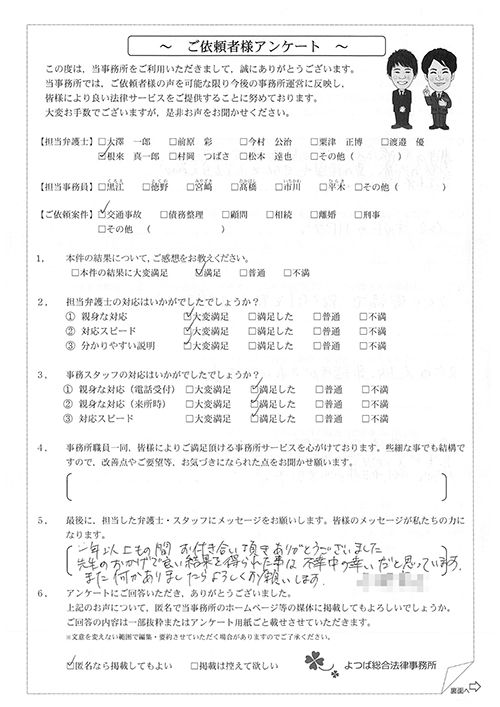 交通事故、むち打ち、後遺障害、示談交渉などで約1年半かかりましたが、満足いく結果でした。大変お世話になりました。全てに関して初めてのことでしたので、不安に思う毎日でした。しかし事務員、弁護士さんなどが丁寧な対応とても親身になってくれ、解決に至りました。有り難うございました。
