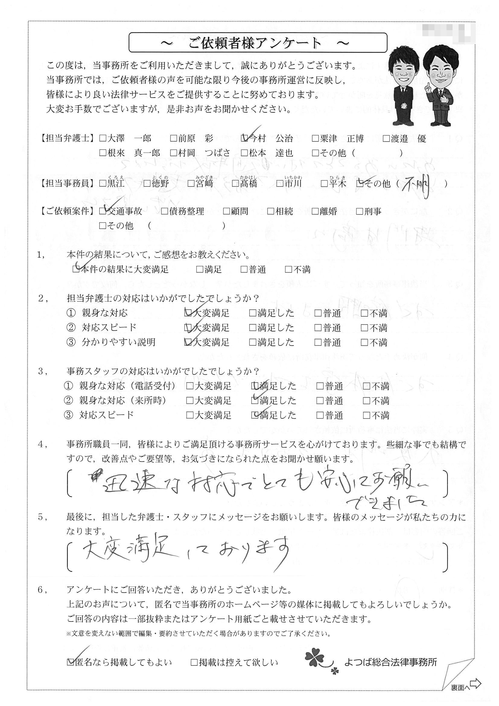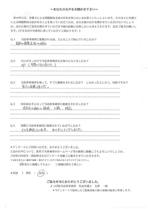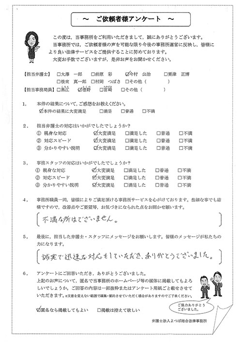今回加入していた保険の特約に弁護士特約がついておりました。以前、父も利用したことがあり、「今村弁護士がよくやってくれるよ」との事で、今村弁護士を紹介して頂き、すぐに依頼をさせて頂きました。