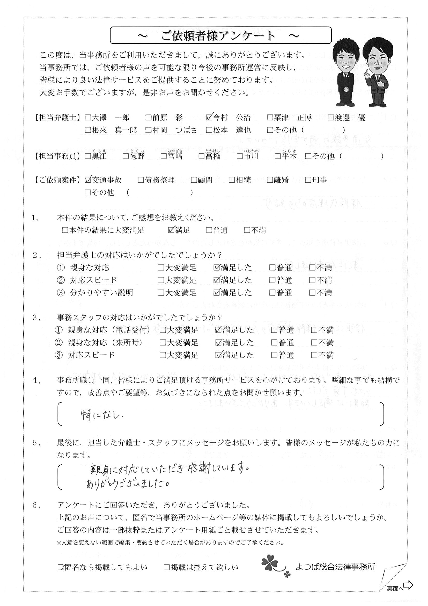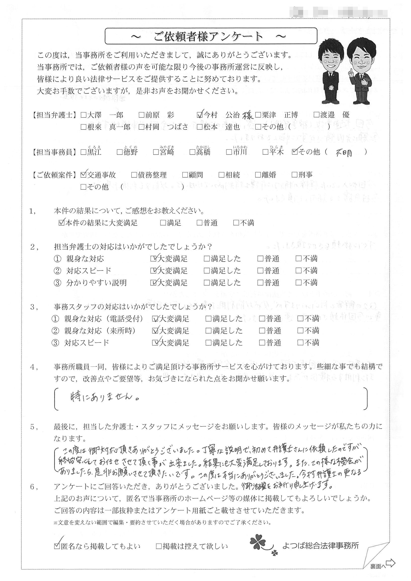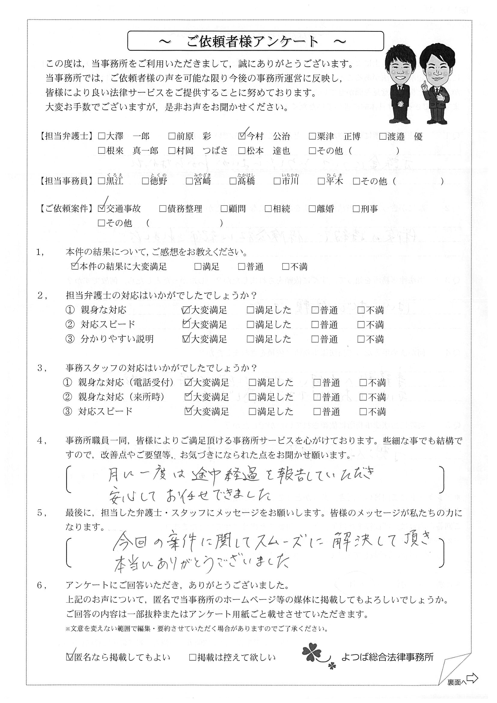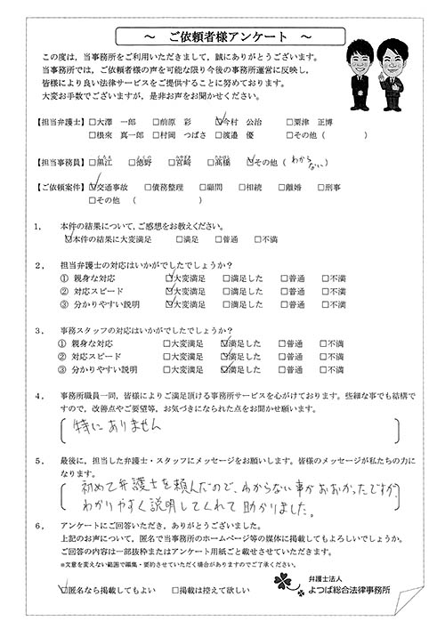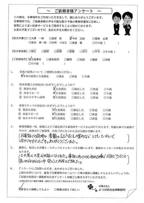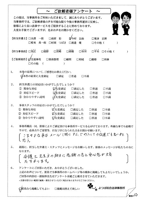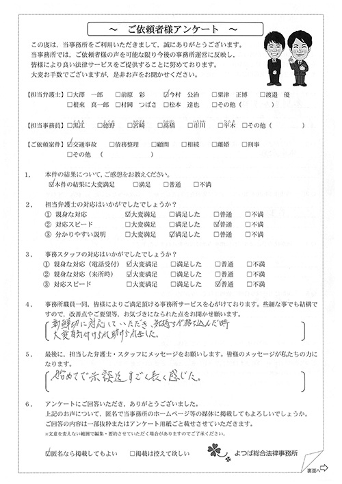 相手方(保険会社)との交渉に悩んでいました。(無料相談時の)今村さんの雰囲気が決めてになって依頼しました。対応が迅速で丁寧だったのでとても良かったです。何度も交渉して頂き、本当に有り難うございました。