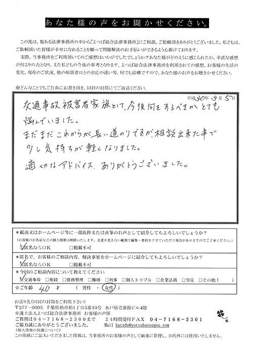 突然追突事故に巻き込まれ、いろいろと悩んでいました。先日、相談をさせていただき、とても気持ちが楽になっておりました。また、いろいろなことを教えていただき勉強になりました。ありがとうございました。