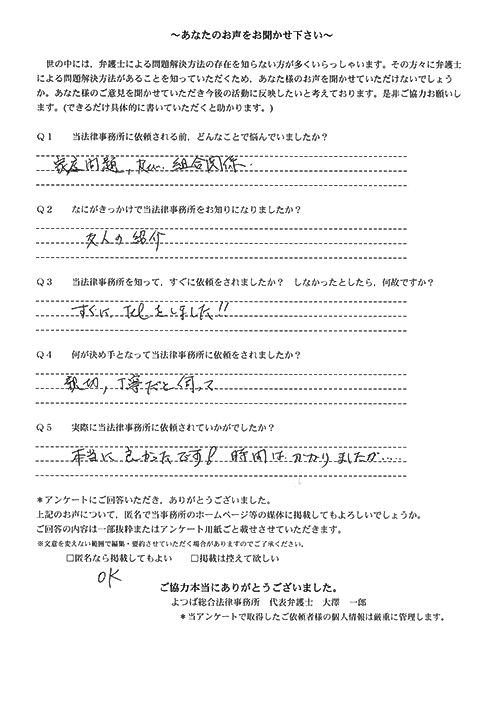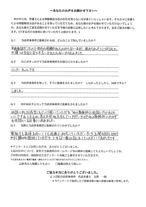 事務所に伺った時、親身になって話を聞いて下さり「今迄頑張りましたね」と言われ、気持ちが”ふっ”と軽くなりました。