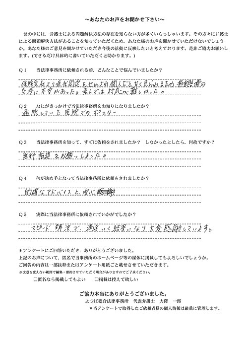 後遺症の辛さと様々な不安で身動きが取れなかったため、代行して下さり大変ありがたかった。補償も可能な限りで獲得していただけてよかった。