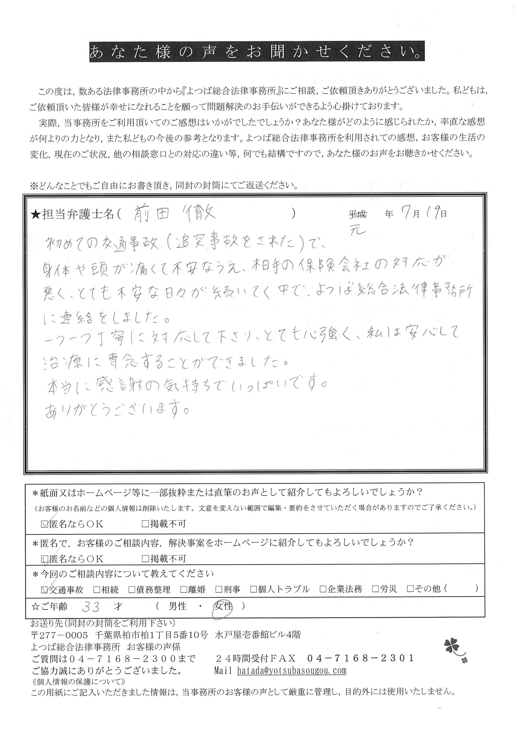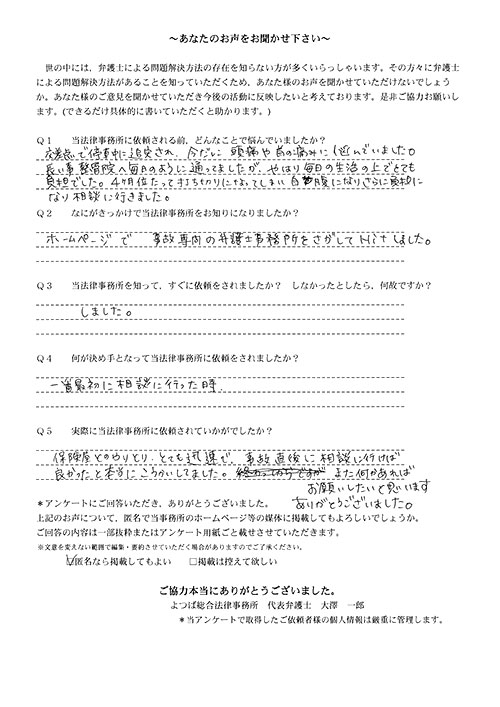 よつばさんの親切丁寧な対応に、感謝の気持ちでいっぱいです。後遺障害4級を勝ち取り、示談金も満足するものでした。有り難うございました。