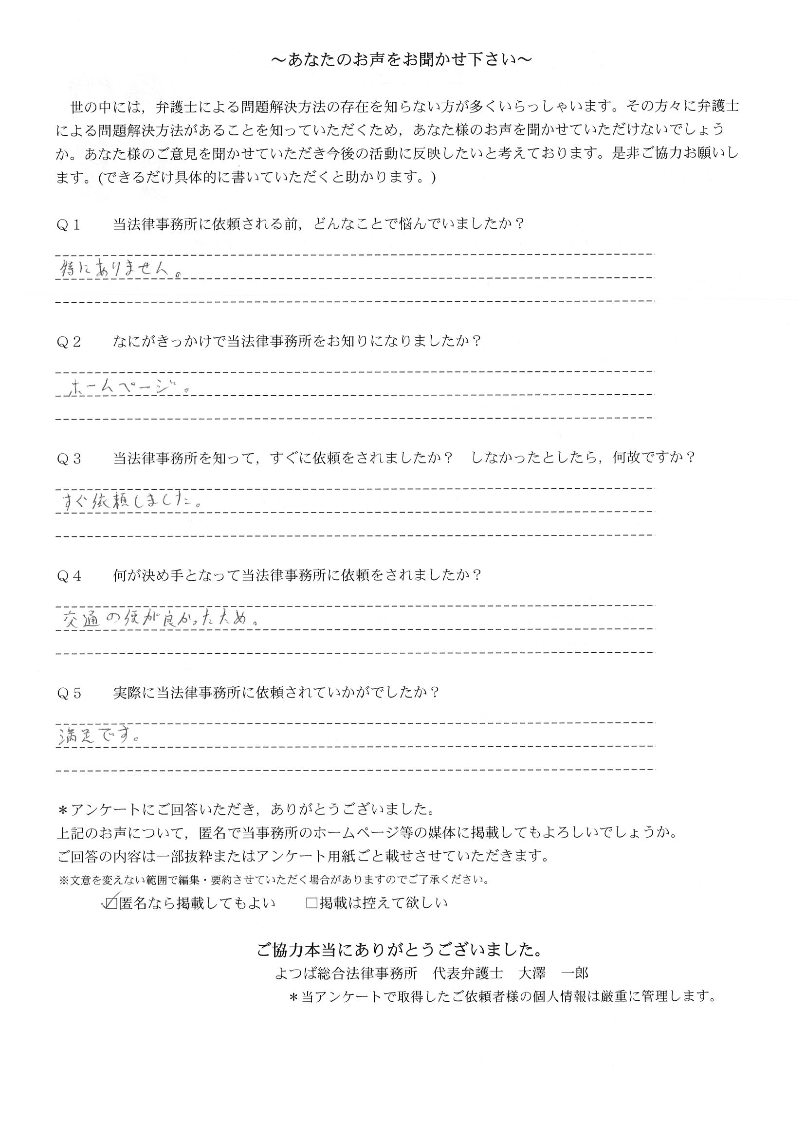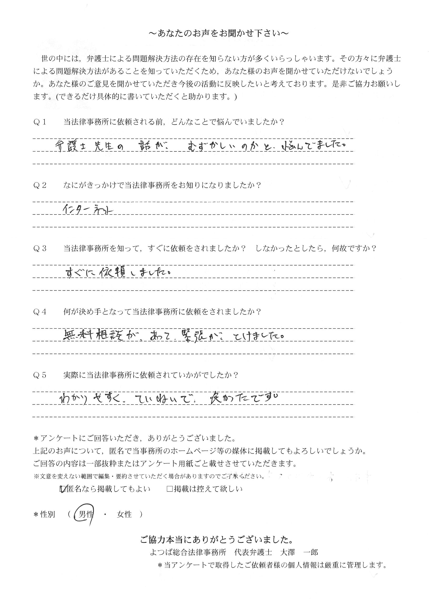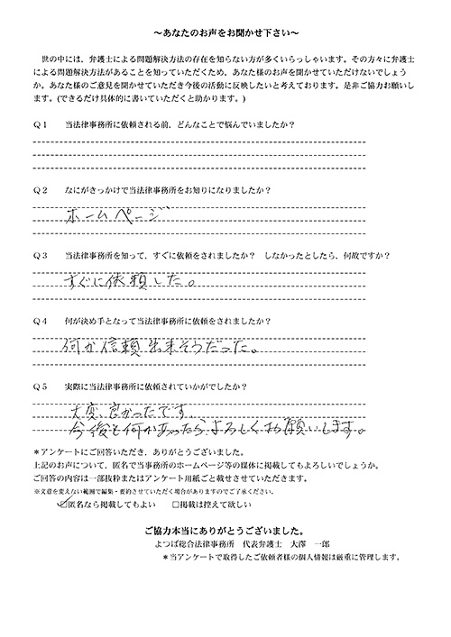 インターネットで事務所を知りすぐに依頼をしました。予約もスピーディーでした。とても助かりました。