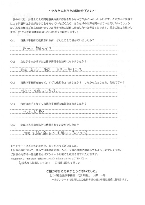 スピーディーで丁寧でまた相談した際は親身になって答えてくださり、大変お世話になりました。4ヶ月半での解決となり、その間とても心強かったです。有り難うございました 。