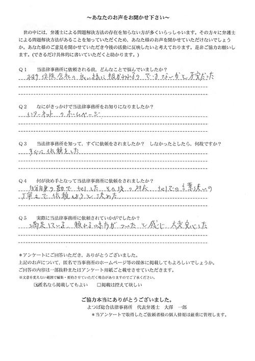 インターネットで検索してこの事務所を知りましたが、すぐに依頼しませんでした。保険会社から勧められた弁護士さんに依頼したからです。