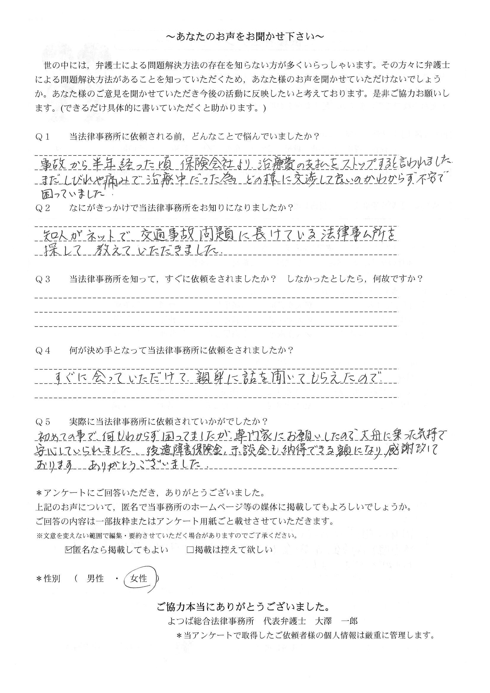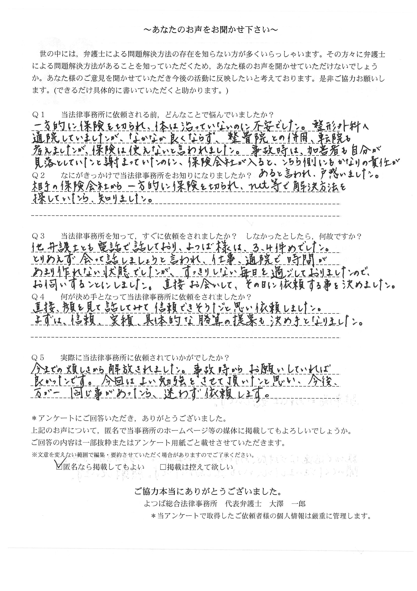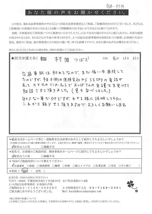交通事故は初めてなので、まだ痛い中通院してたのですが、相手側の保険会社から打ち切りの電話があって、スマホのインターネットでよつばさんの弁護士を見つけて相談させて頂きました。いろいろ安心しました。