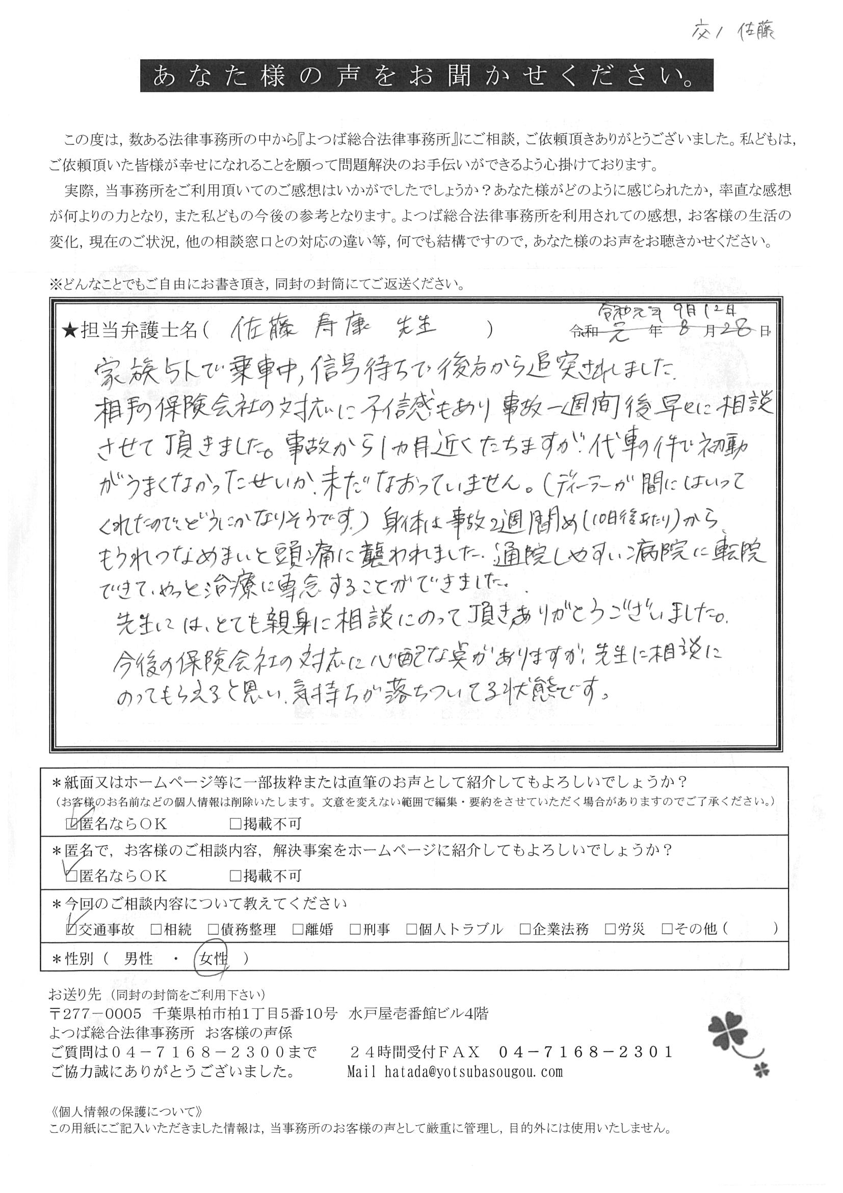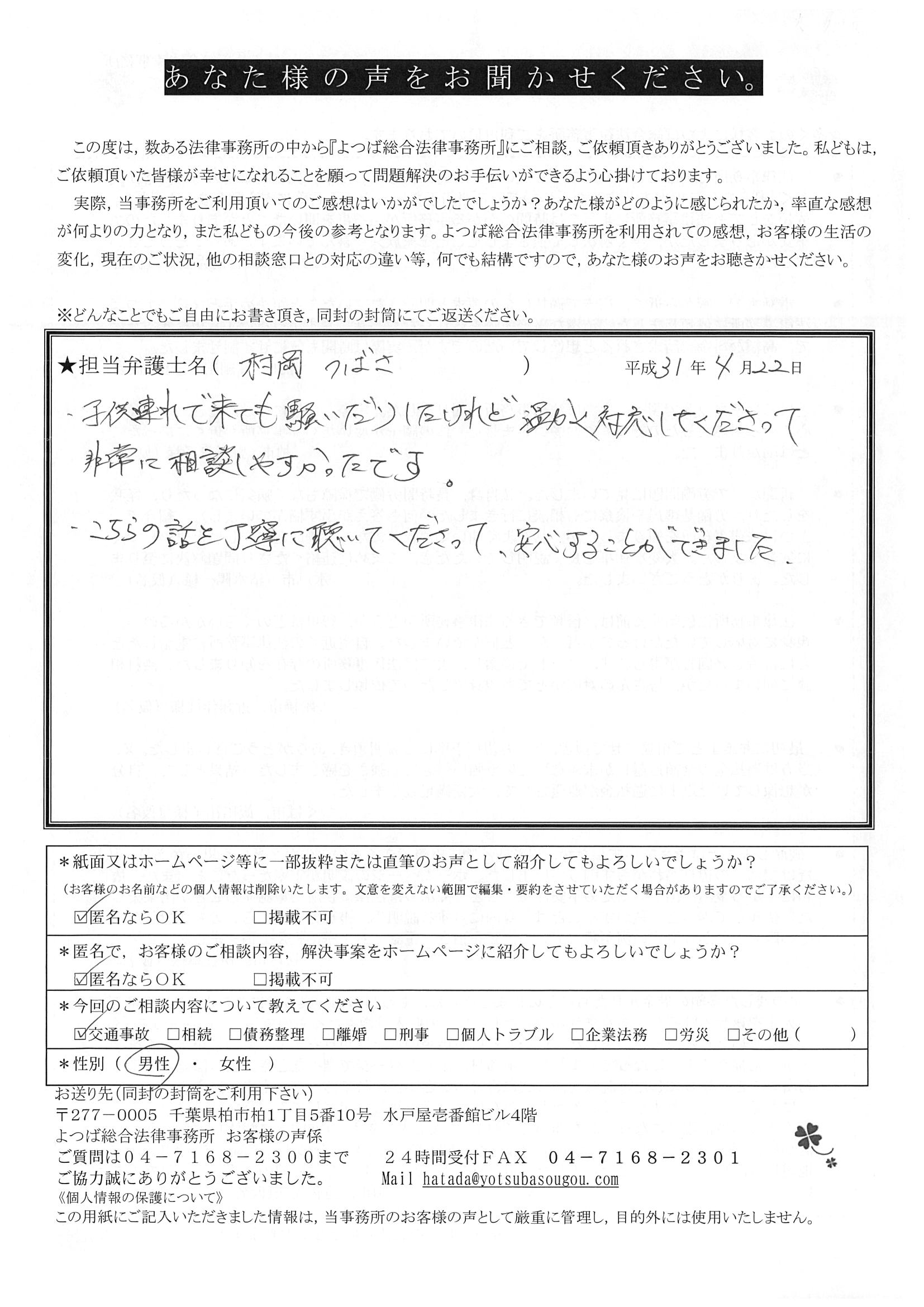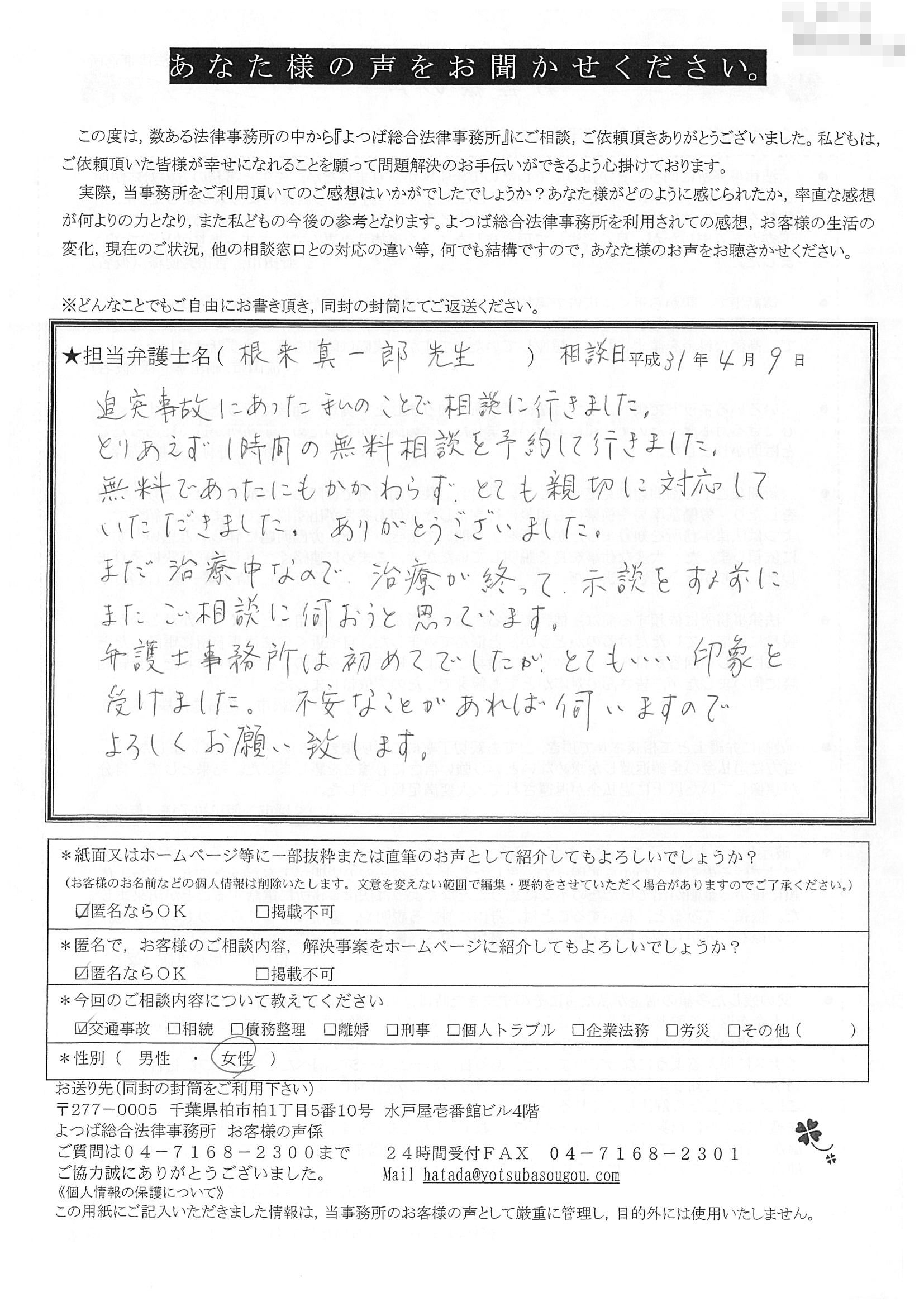 交通事故は初めてなので、まだ痛い中通院してたのですが、相手側の保険会社から打ち切りの電話があって、スマホのインターネットでよつばさんの弁護士を見つけて相談させて頂きました。いろいろ安心しました。