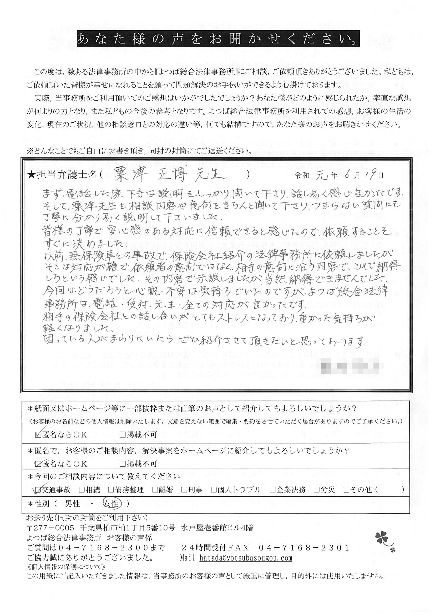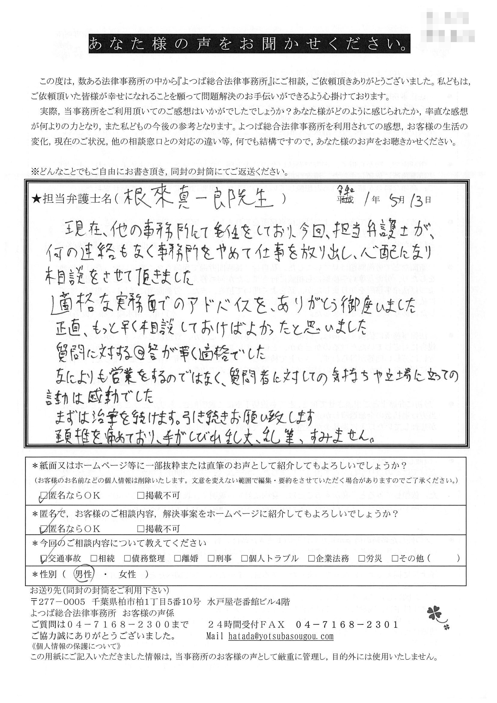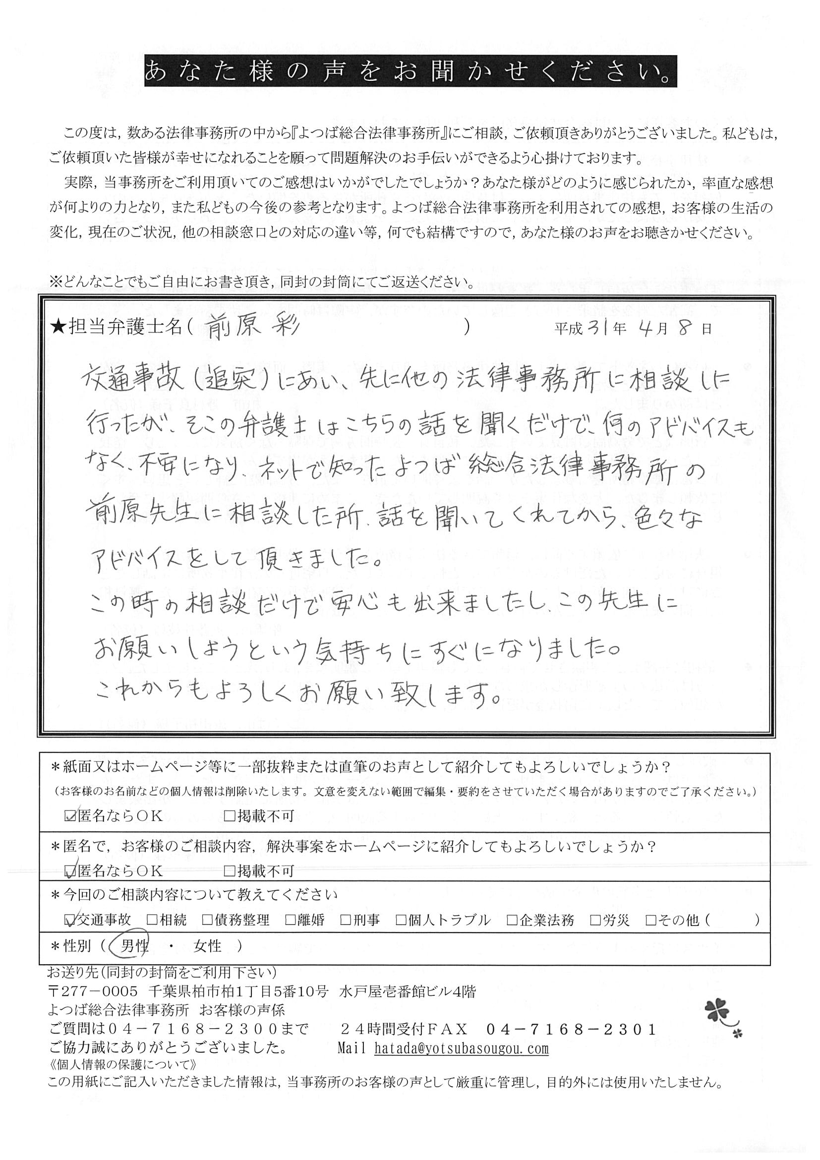 その時ネットの検索で見つけたのが、「加害者の立場に立った弁護士じゃなく被害者の味方です」のよつば総合さんでした。すぐ電話して伺いました。前原先生が対応してくださり、「よし、この 事務所にお願いしよう」と決めました。ほんとに良かったと思います。ありがとうございました。