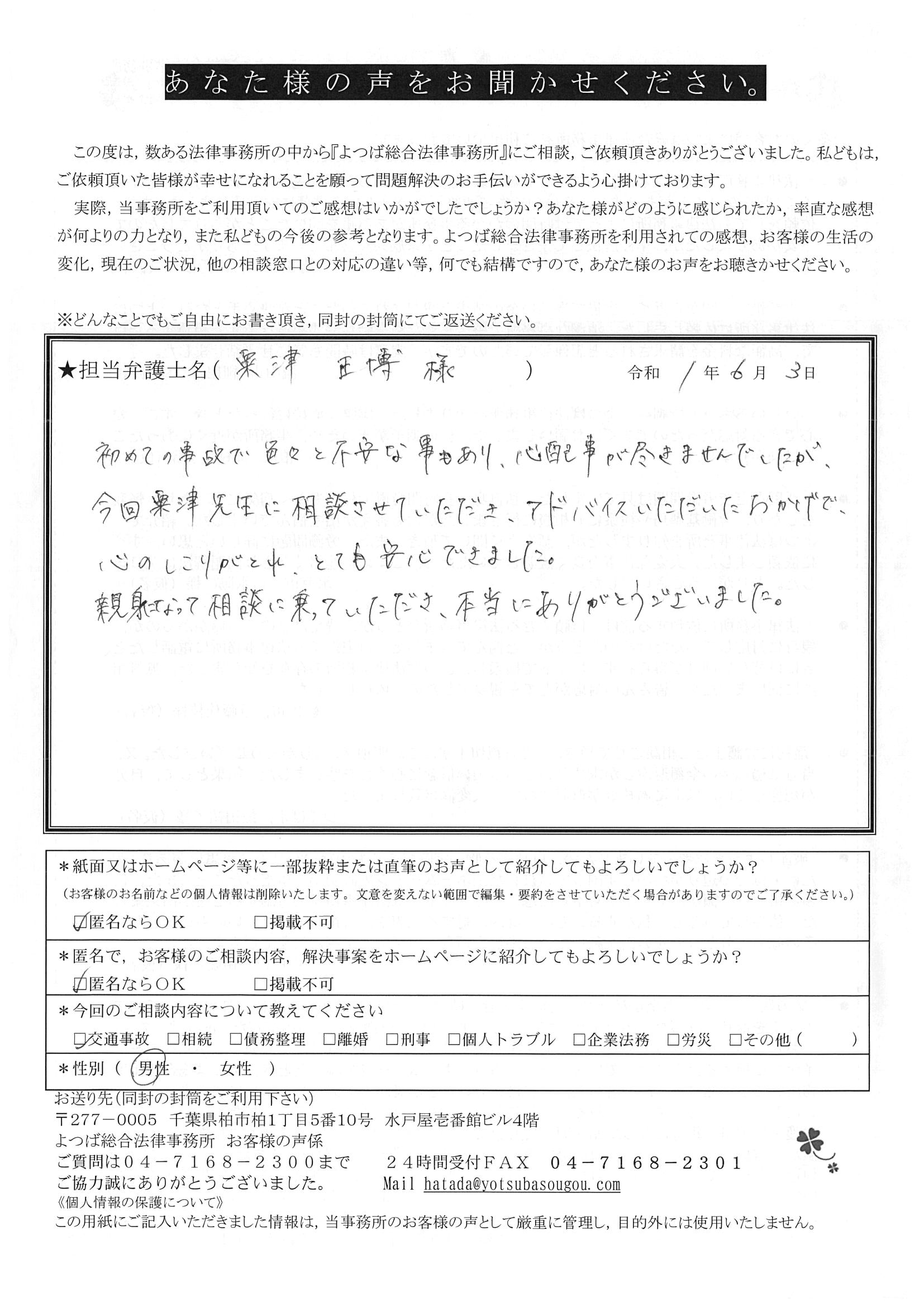 また、事故があっては困りますが、別で何かの際には信頼できるよつば総合法律事務所さんにお願いしたいと思います。本当にありがとうございました。