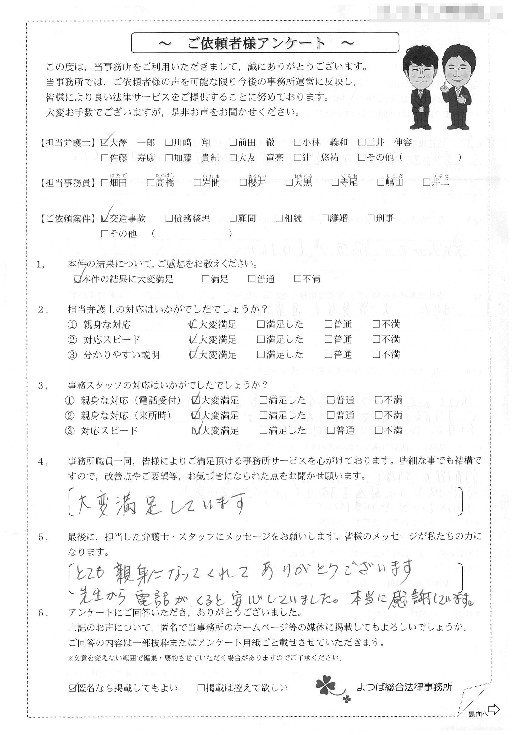 大きい事故は初めてでしたので当惑しました。先生にお世話になり大変助かりました。