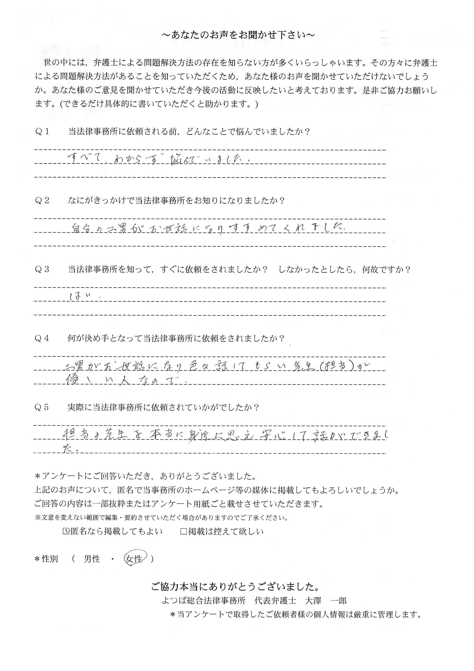 先生には大変お世話になりました。初めて弁護士先生にお願いしましたが、親身で分かりやすく相談に乗って頂きました。