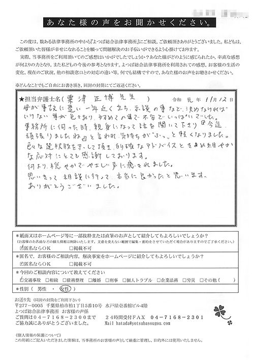 母が事故に遭い、一年近く経ち、示談の事など決めなければいけないことがいろいろあり、初めての事で不安でいっぱいでした。