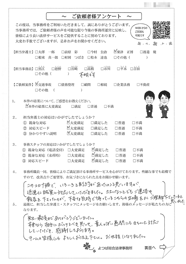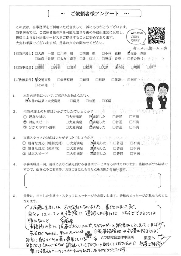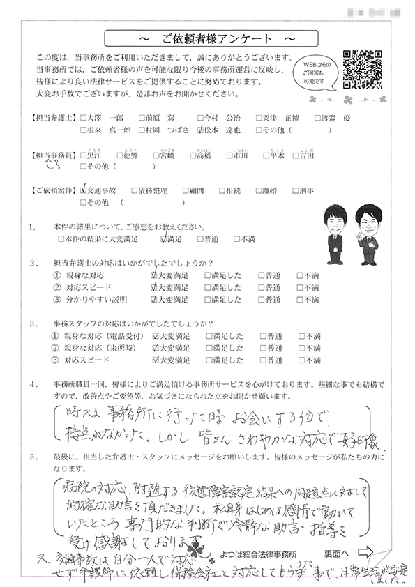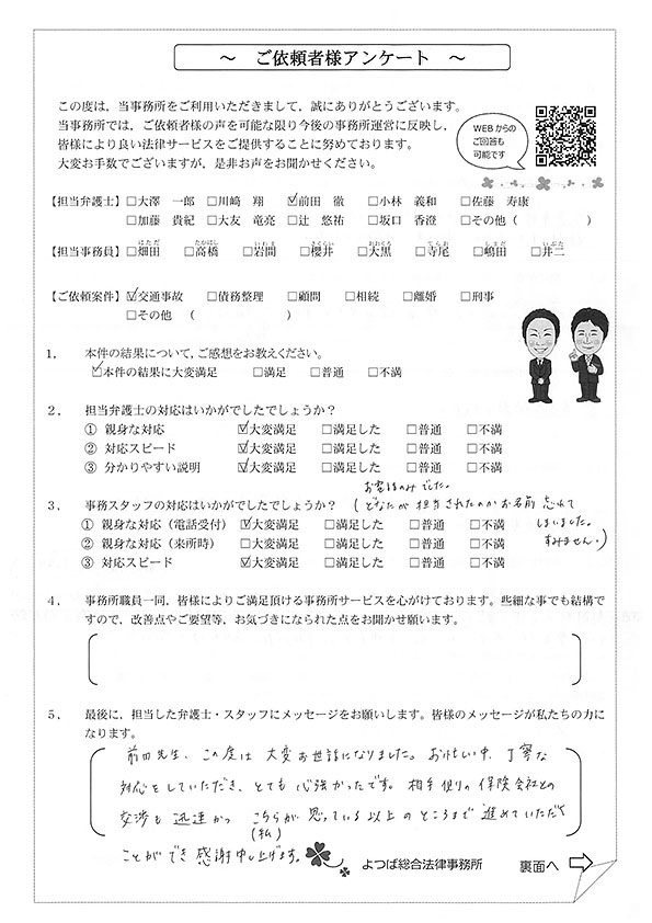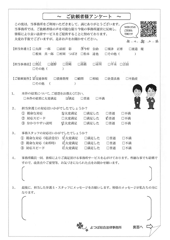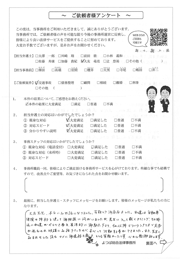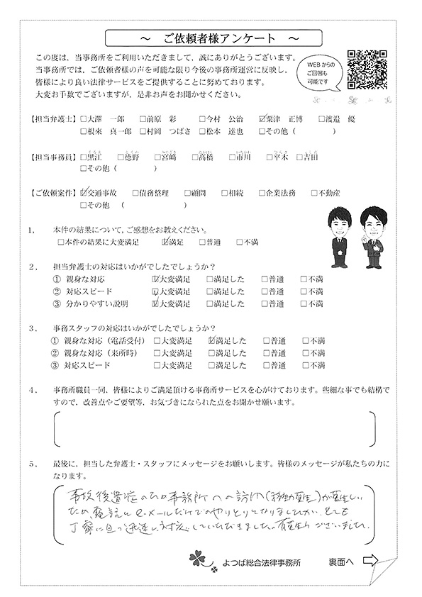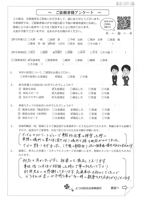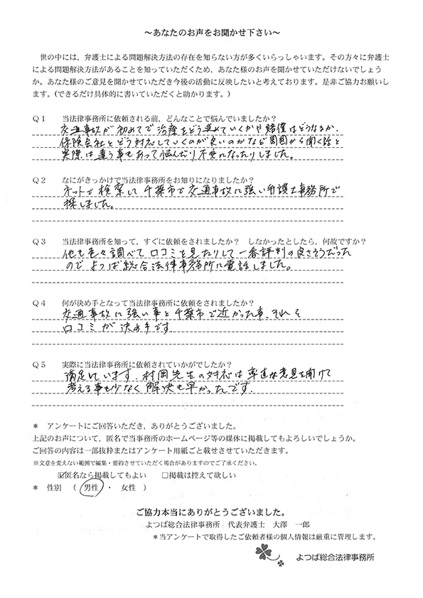 対応も早かったですし、結果にも満足しています。事故後1か月位で相談した時に丁寧に対応してくださり、村岡先生には感謝しております。