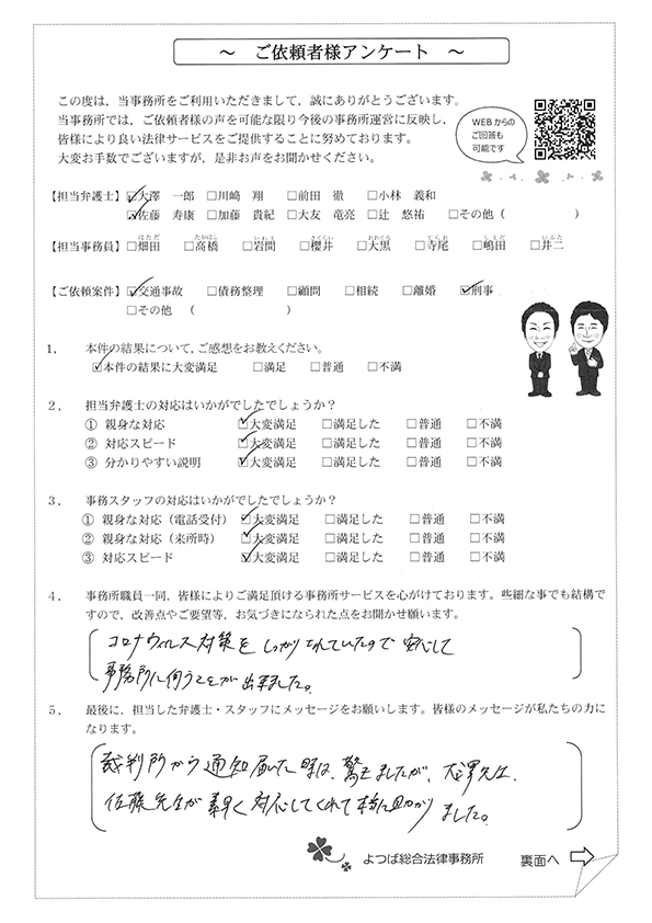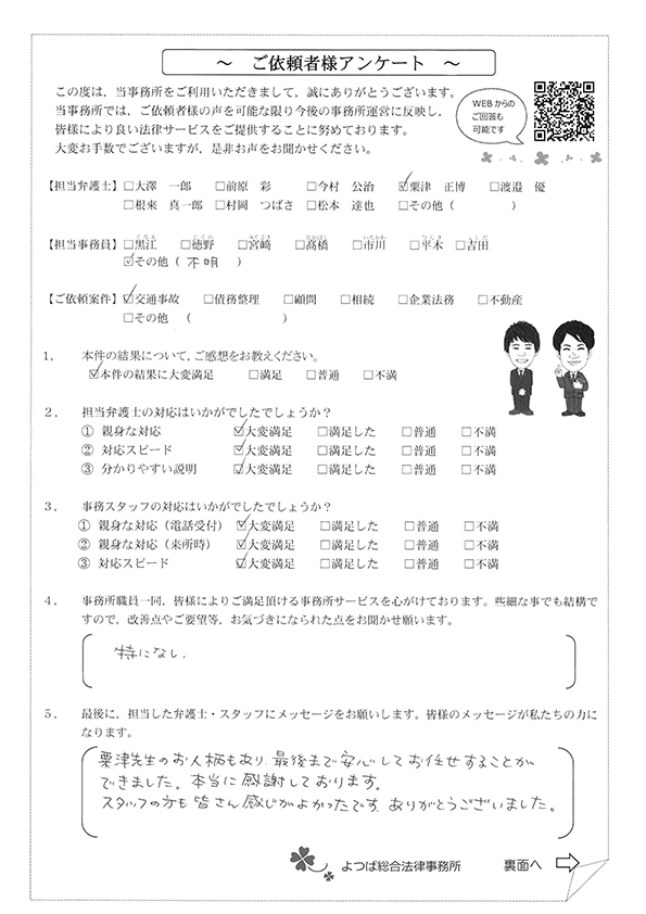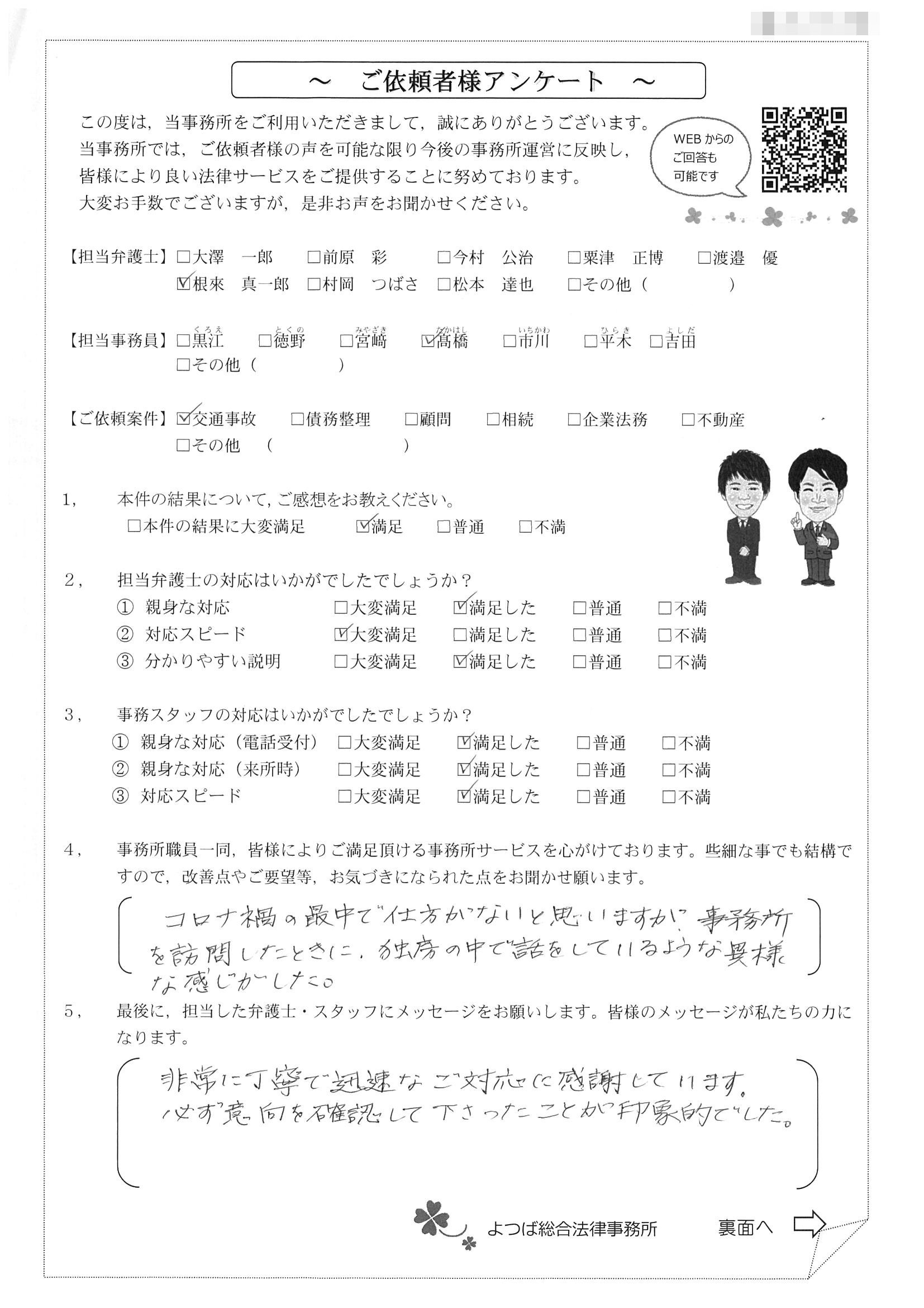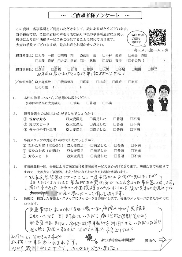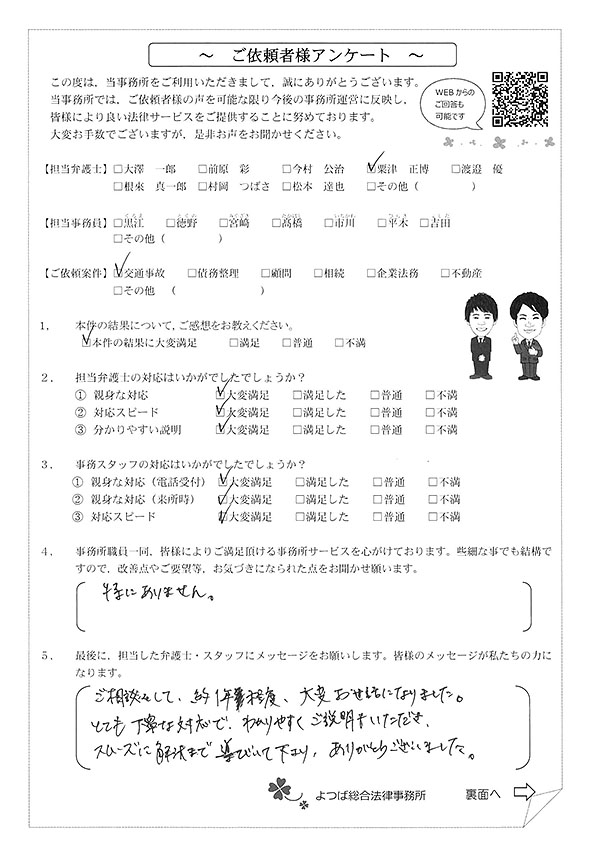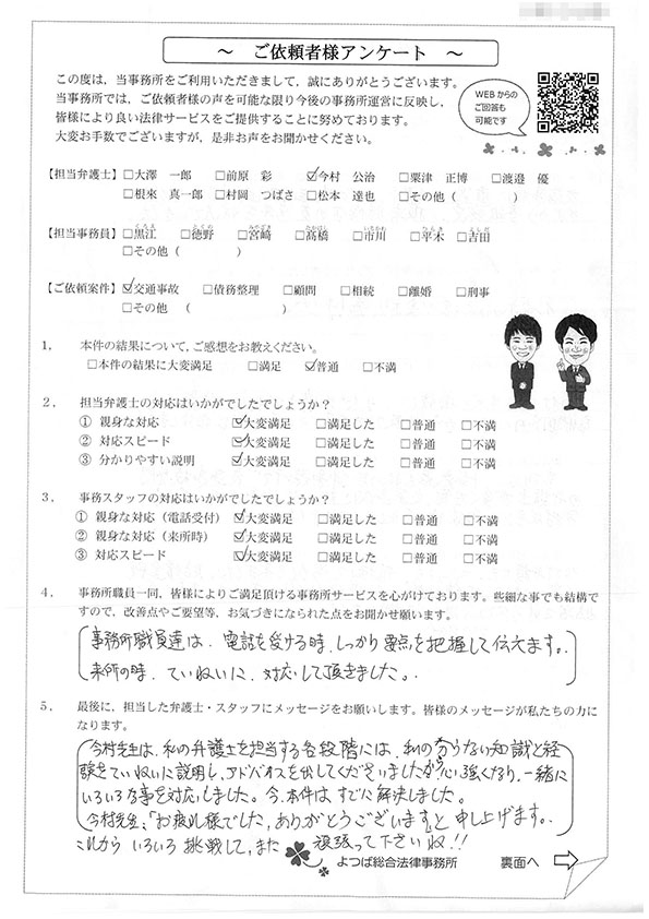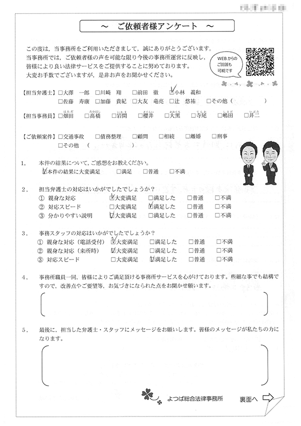 対応も早かったですし、結果にも満足しています。事故後1か月位で相談した時に丁寧に対応してくださり、村岡先生には感謝しております。